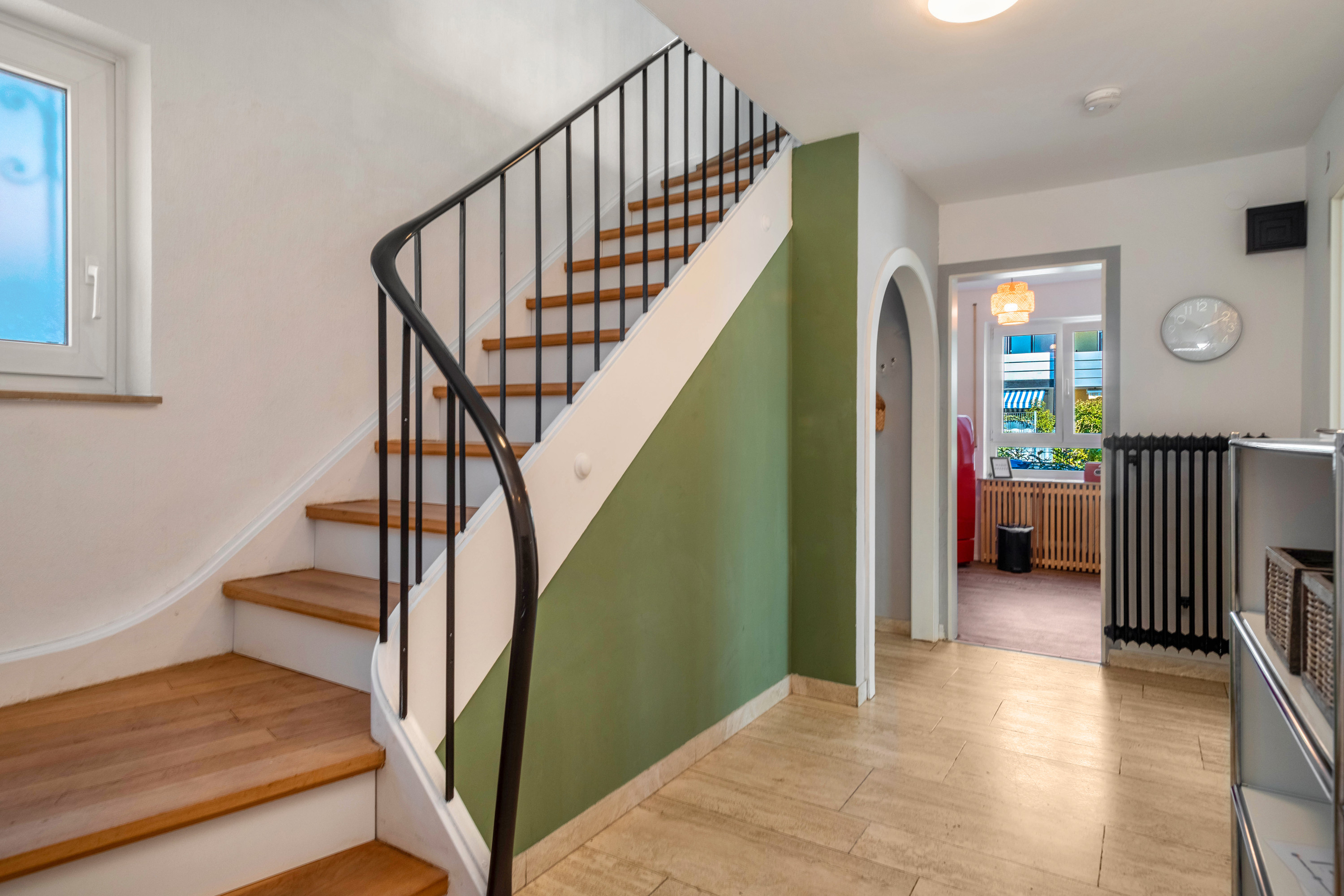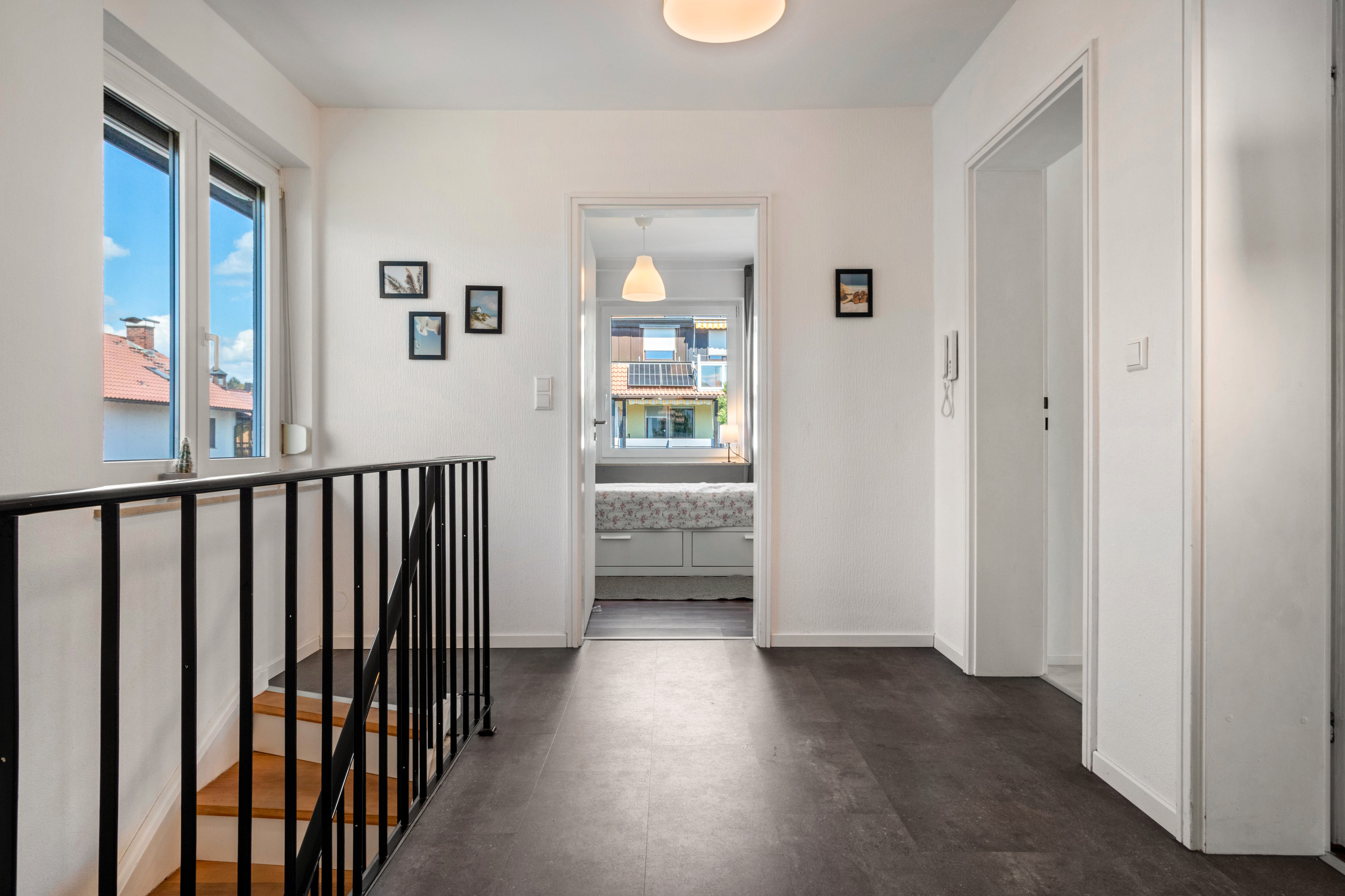 Der private Außenbereich mit umzäuntem Garten, überdachter Terrasse, Balkon und Grill ist der perfekte Ort, um entspannte Stunden im Freien zu genießen. Zwei Stellplätze befinden sich direkt am Haus auf dem eigenen Grundstück – einer davon eignet sich für Fahrzeuge mit einer Länge bis zu 5 m.