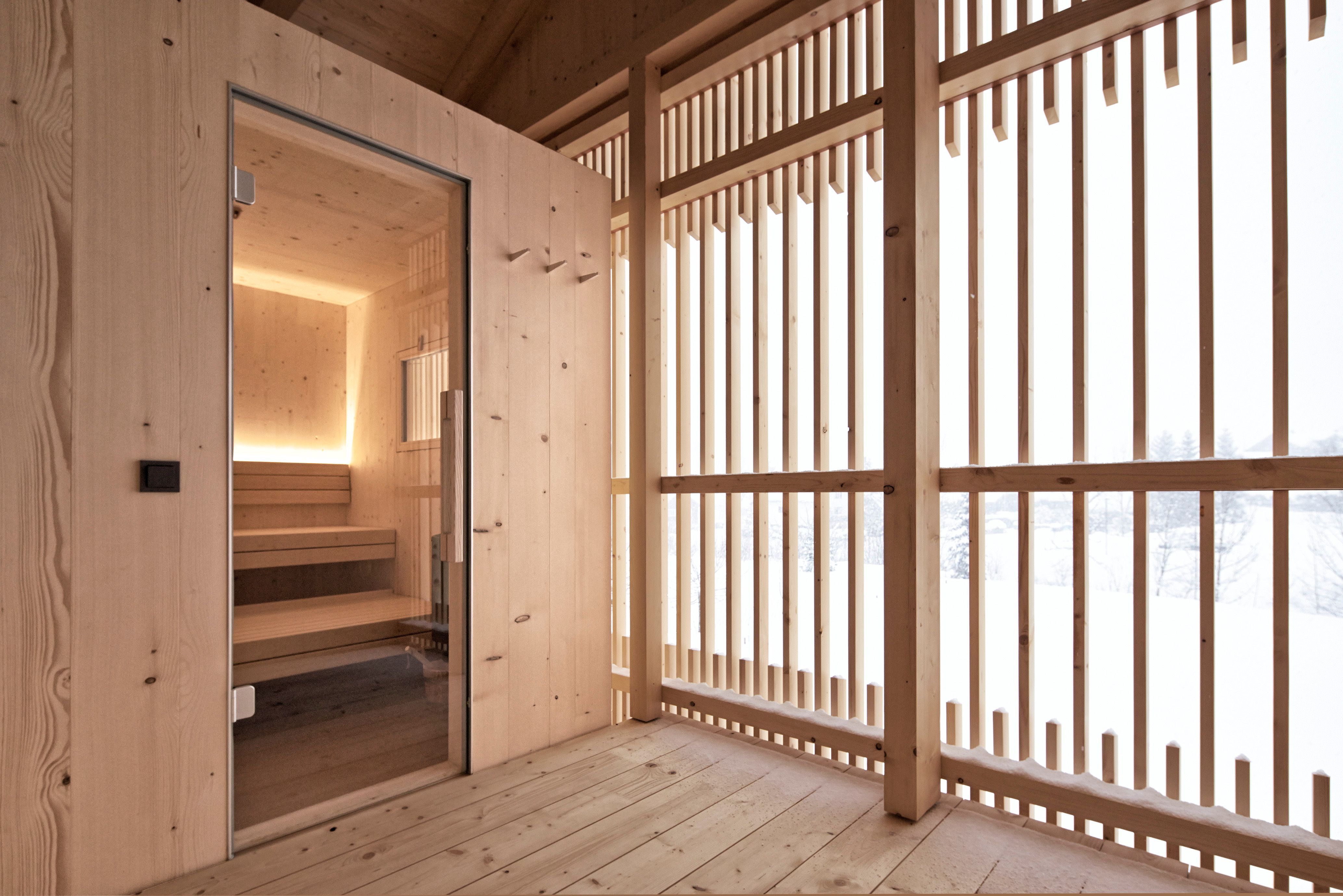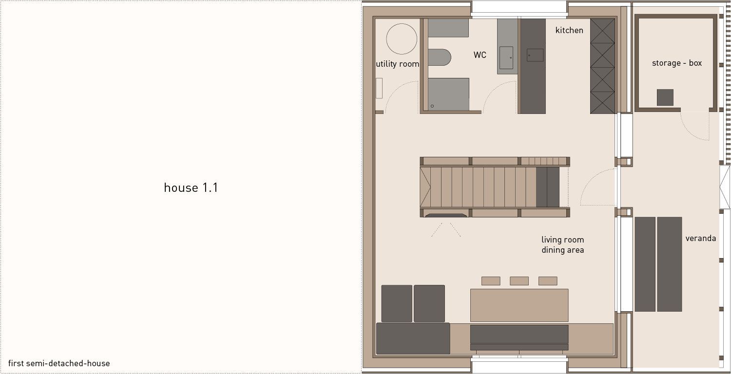 Das Haus 1.2 (maximale Auslastung 8 Personen) hat 97 m² zzgl. eines überdachten Außenbereichs mit Abstellraum (bzw.  Skiraum inkl. Schischuhwärmer). Auch dieses verfügt über einen großen Wohnraum mit Essbereich, eine Küche sowie ein Badezimmer mit Dusche und WC im EG. Im OG finden Sie 1 Doppelzimmer, 1 Drei- bis Vierbettzimmer, 1 Zusatzzimmer mit TV Chillecke (mit Schlafcouch für zwei Personen), ein Badezimmer mit Badewanne und WC sowie eine überdachte Veranda mit Sauna.