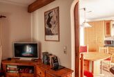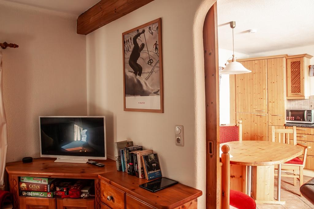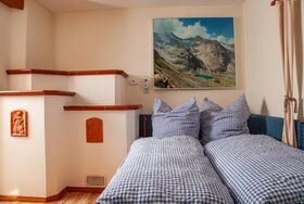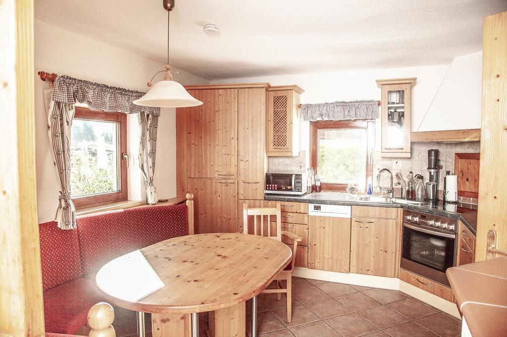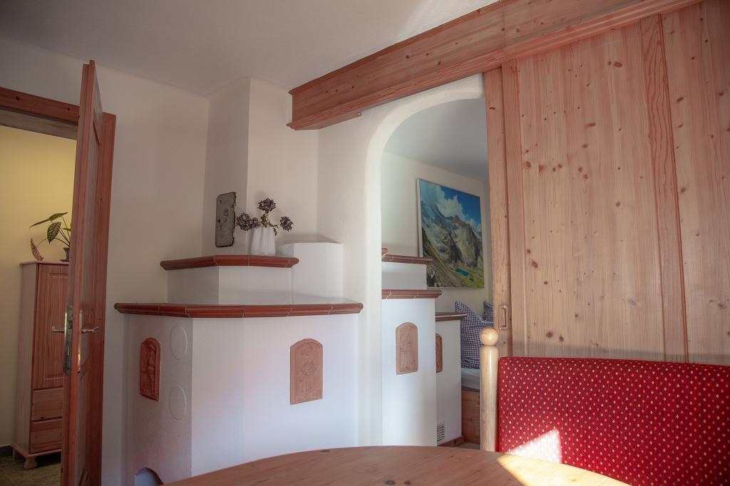 Unsere Ferienwohnung befindet sich im Erdgeschoss. Über einen Flur gelangen Sie in die schöne urige Wohnküche, ausgestattet mit jeglichem Komfort. Anschließend an die Wohnküche befindet sich, mit einer Schiebetür getrennt, die Wohnstube ausgestattet mit einer schönen Stubenbank, die mit wenigen Handgriffen zum Bett umfunktioniert werden kann. Hier bietet sich reichlich Platz für zwei Personen. Der Kachelofen verbindet die beiden Räume. Auf derselben Ebene befindet sich ein großzügiges Badezimmer ausgestattet mit einer Duschwanne, Waschbecken und WC und Waschtrockner.