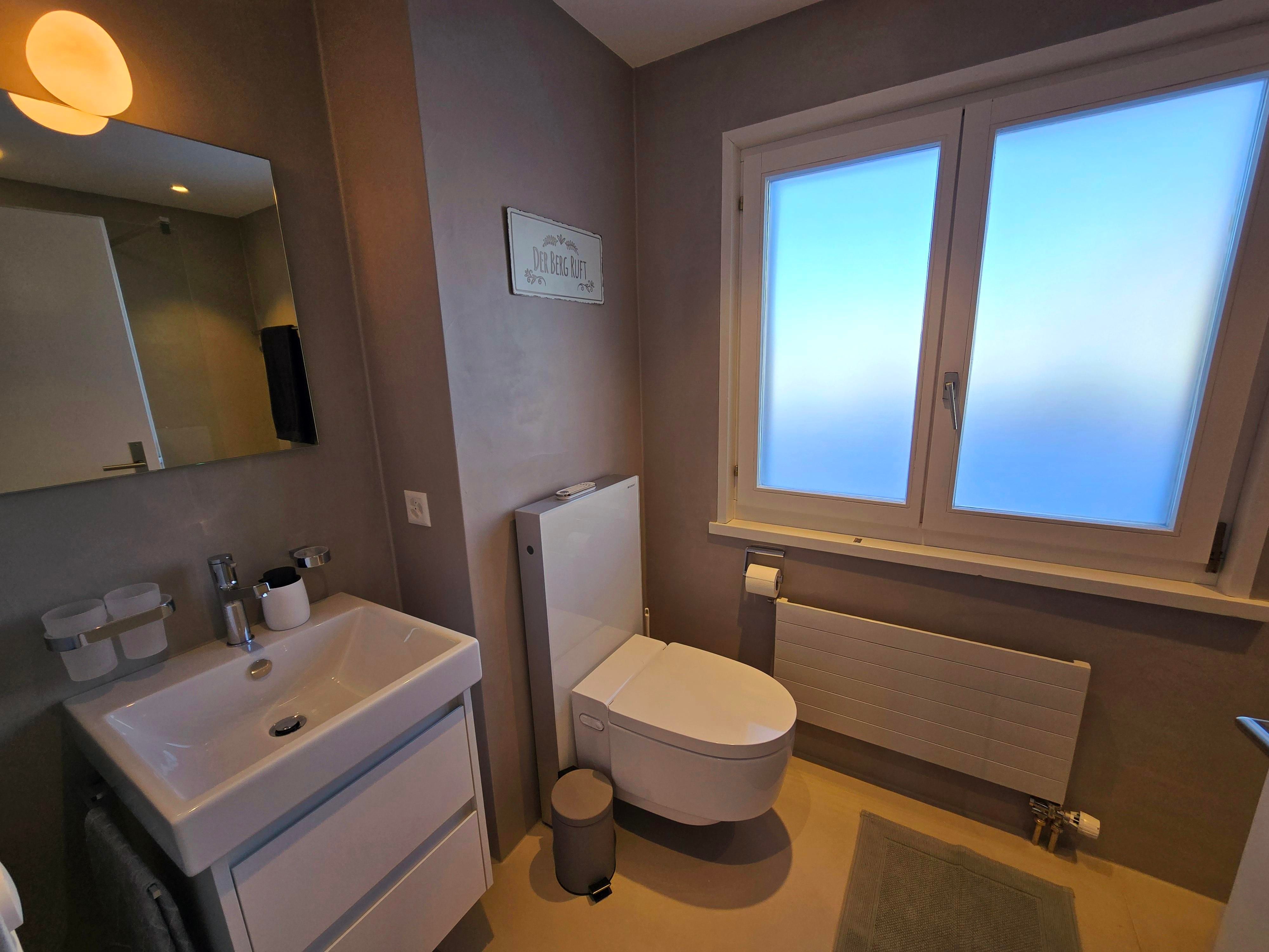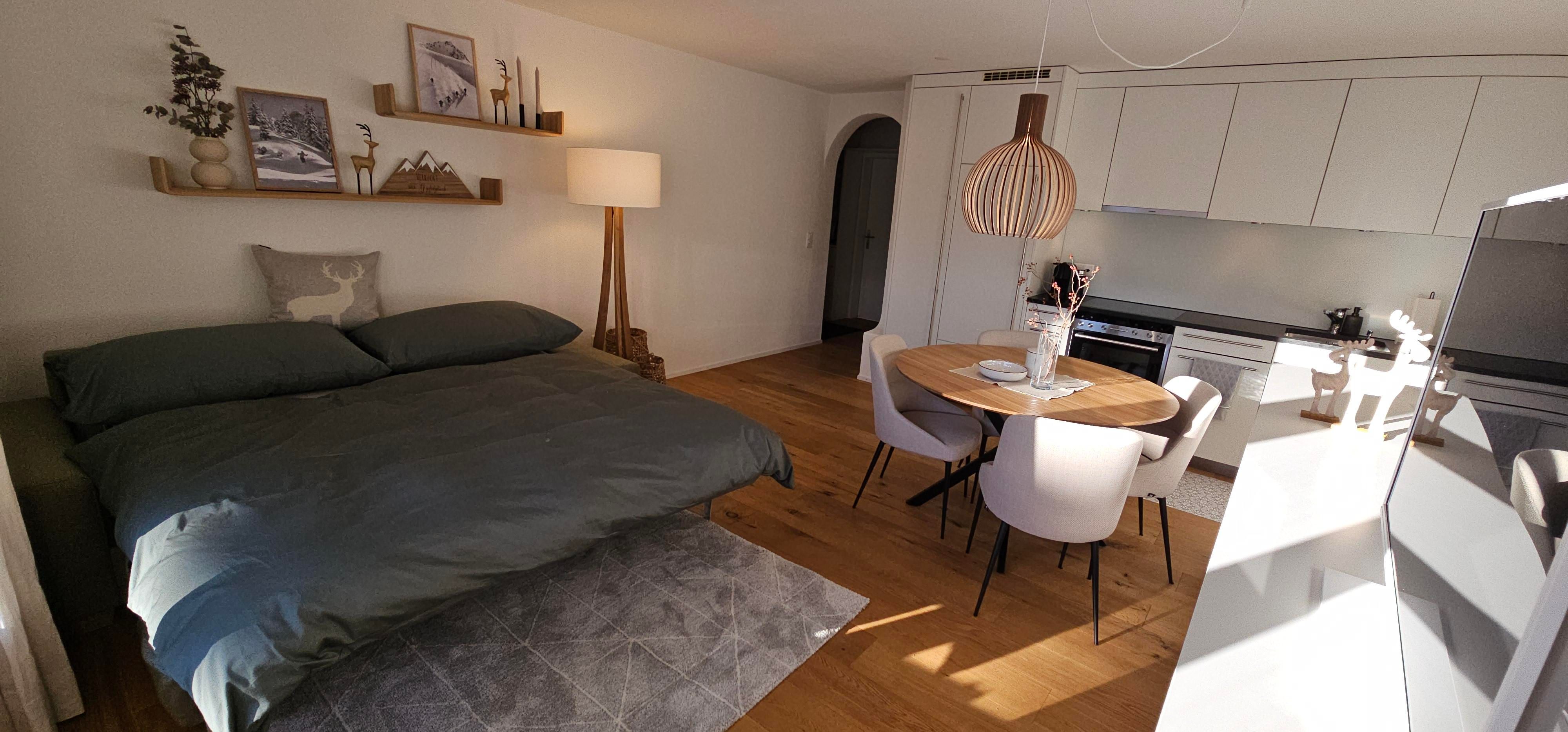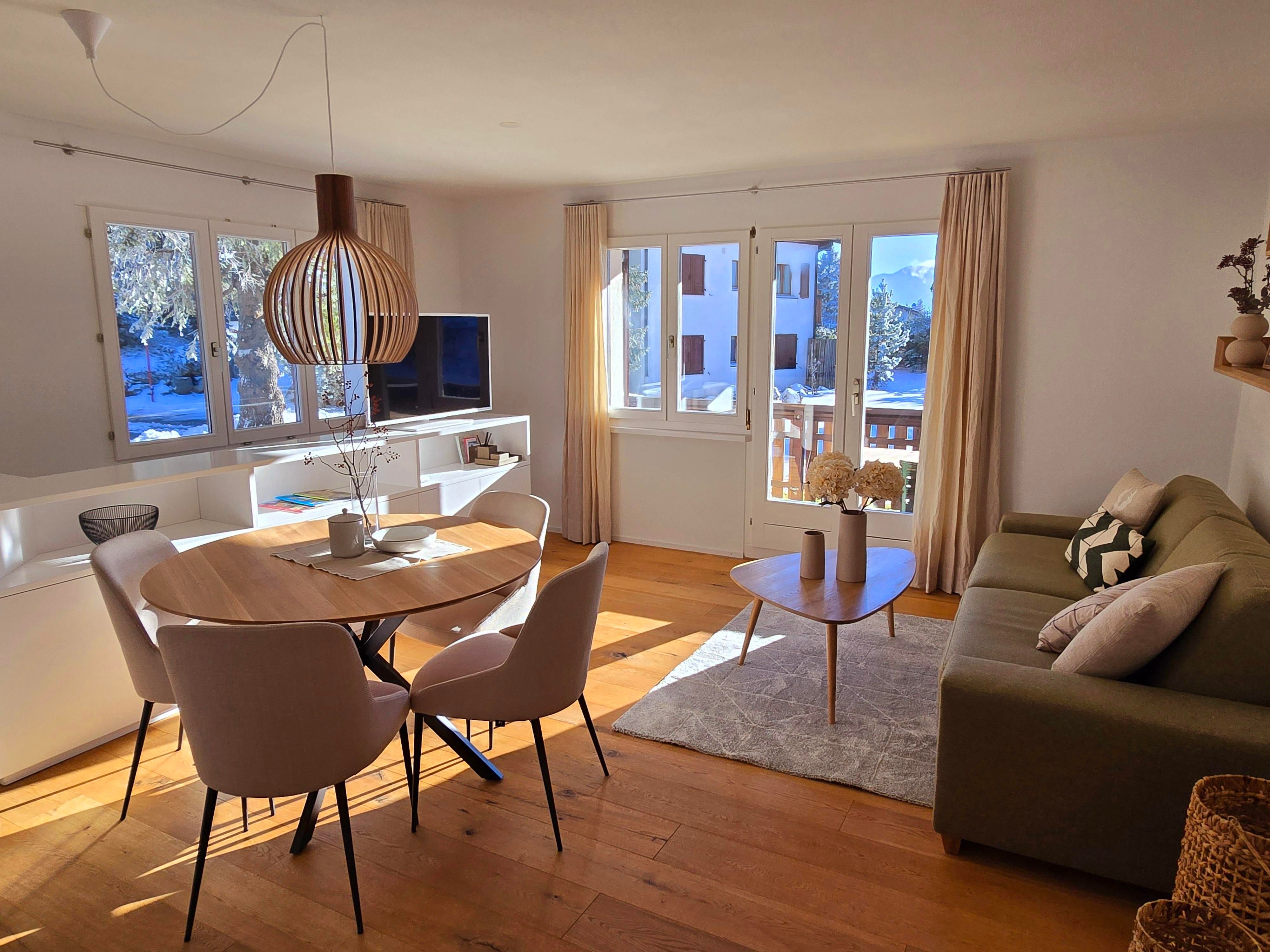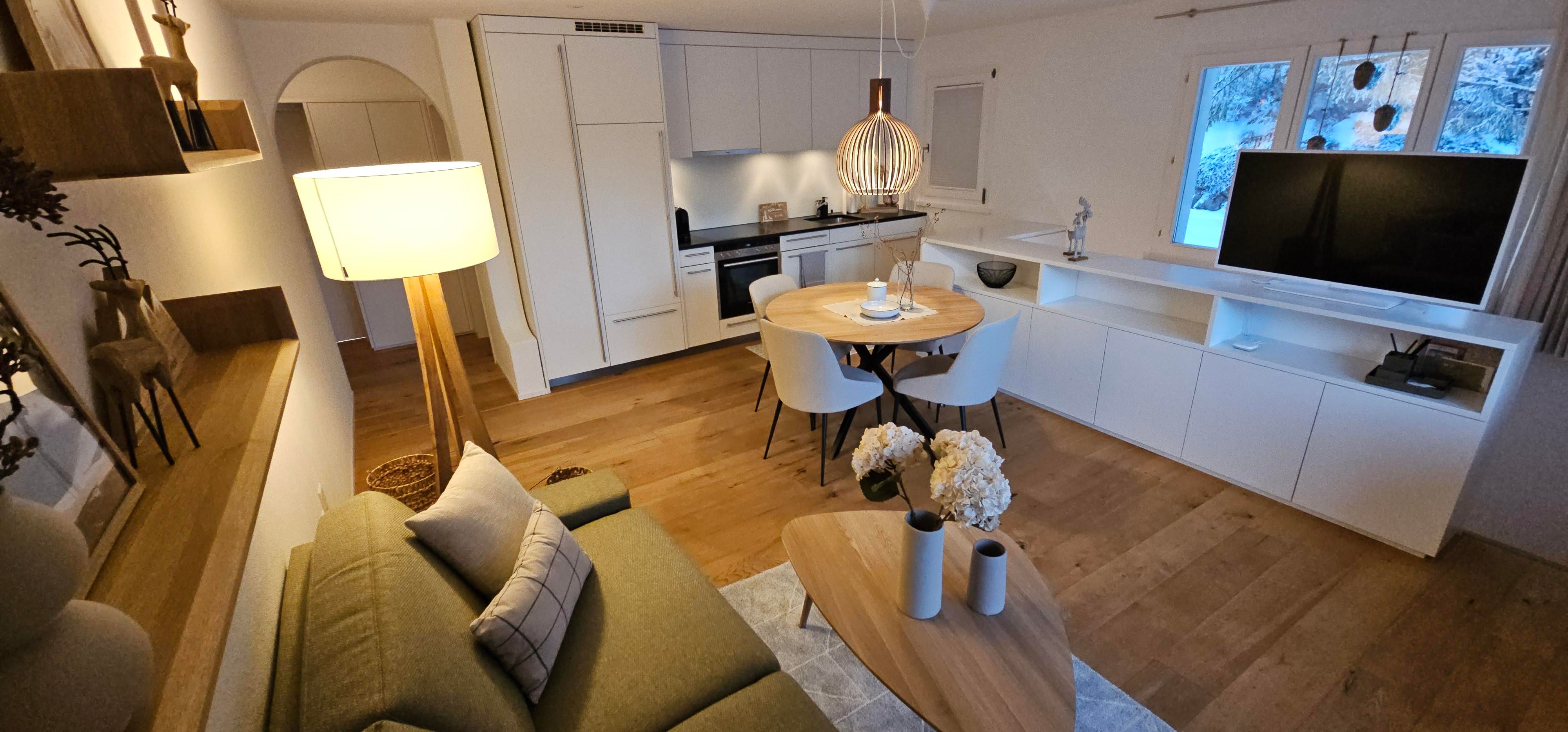 Die neu renovierte, luxuriöse 3.5 Zimmer Ferienwohnung bietet höchsten Komfort und eine schöne Ausstattung. Das helle, stilvoll eingerichtete Wohnzimmer verfügt über ein hochwertiges Bettsofa und schafft mit seiner grosszügigen Gestaltung eine gemütliche Atmosphäre zum Entspannen. Für Ihre Unterhaltung stehen ein grosser Fernseher und WLAN bereit. Die offene, moderne Küche ist bestens ausgestattet. Zwei grosszügige Schlafzimmer mit Doppelbetten sowie zwei Badezimmer. Eines mit Dusche/WC, eines mit Badewanne/Dusche/WC.