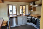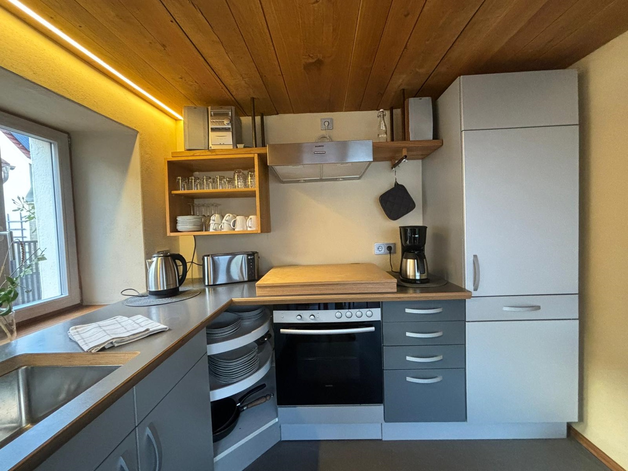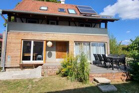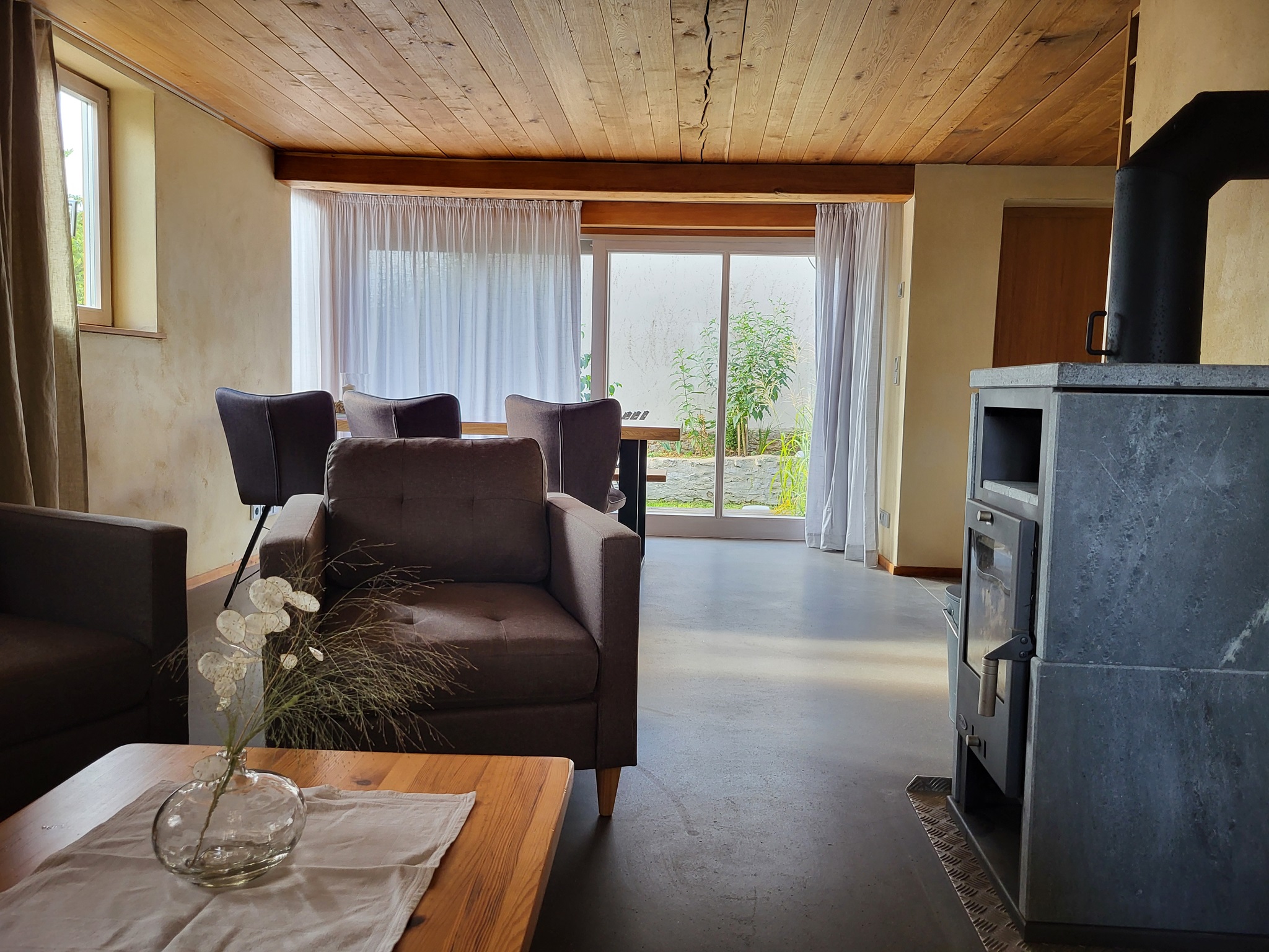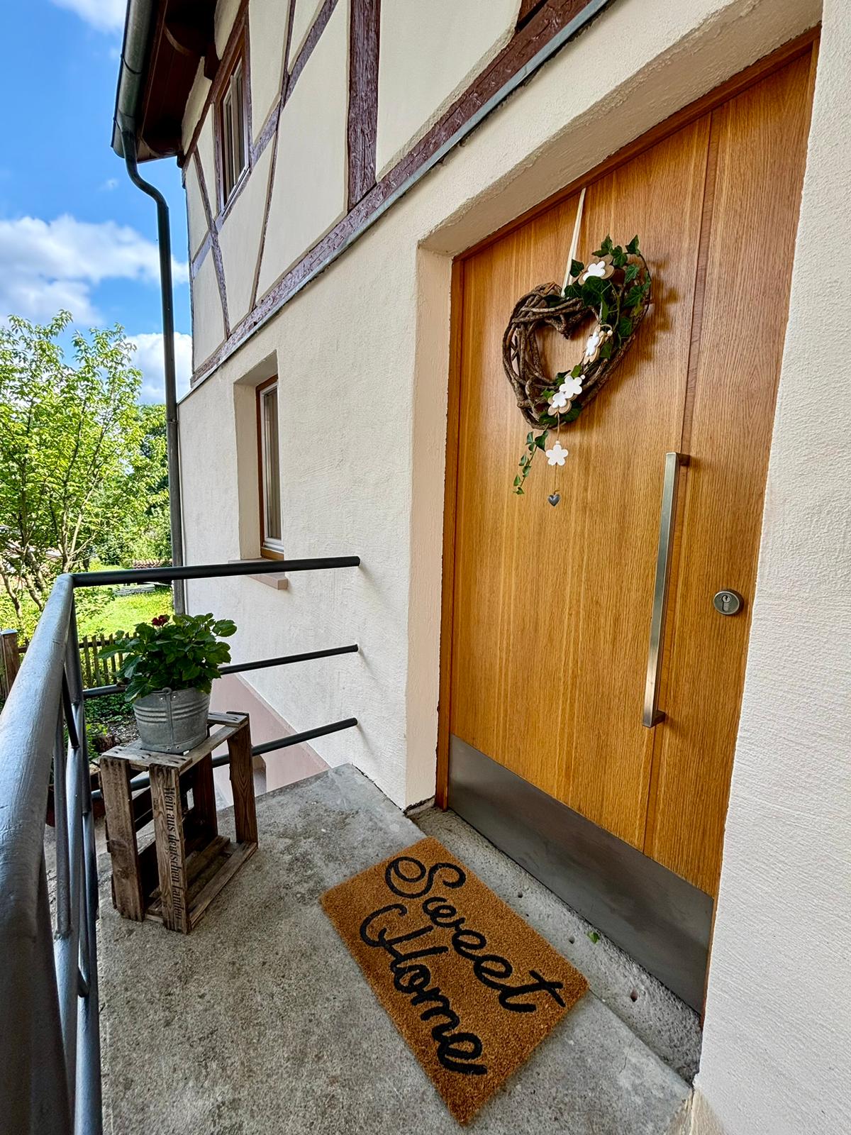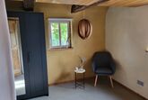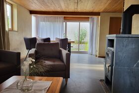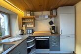 Im Erdgeschoss des historischen Fachwerkhauses befindet sich eine voll ausgestattete Küche, Esszimmer mit Blick auf den Garten, gemütliches Wohnzimmer mit Kaminofen sowie ein Bad (Dusche, WC, Föhn). Außerdem steht eine Waschmaschine zur Verfügung.