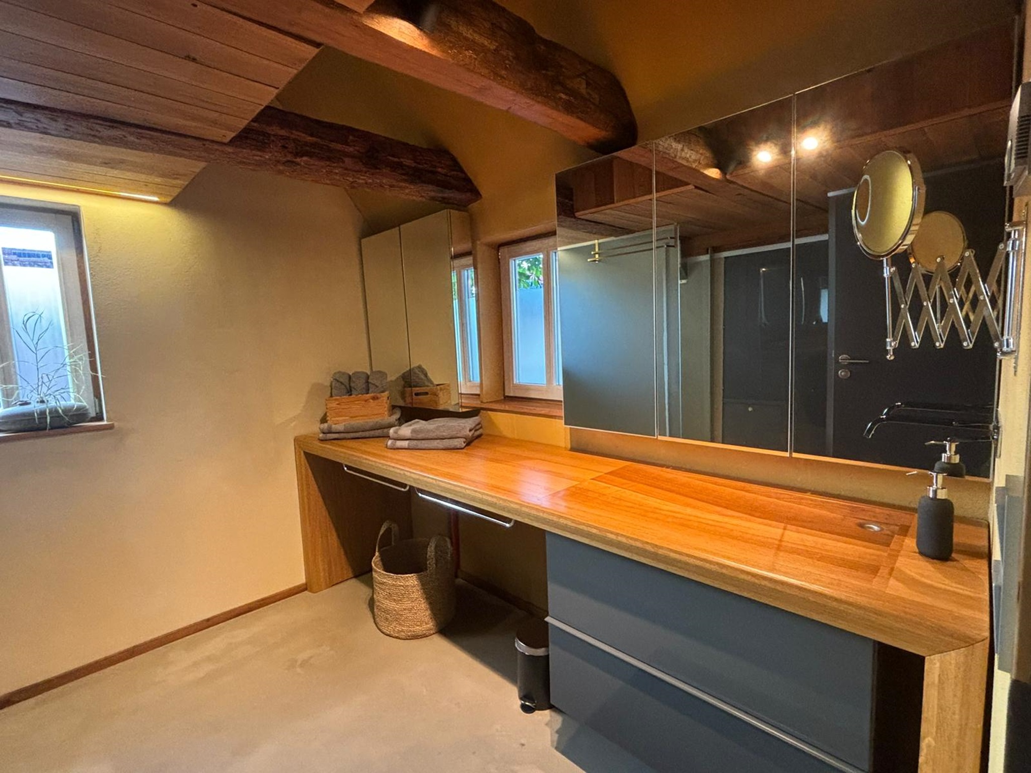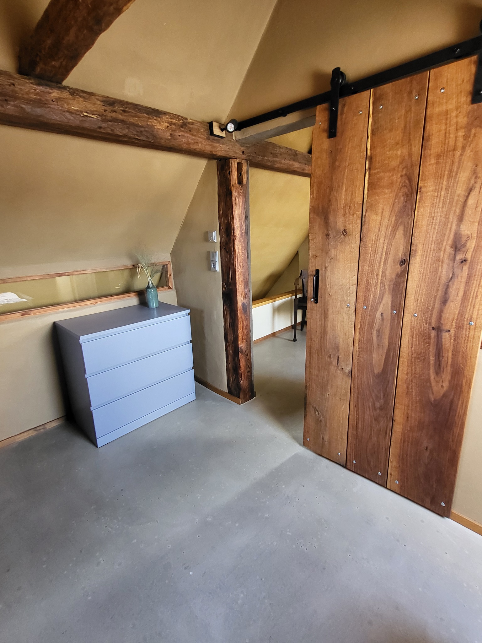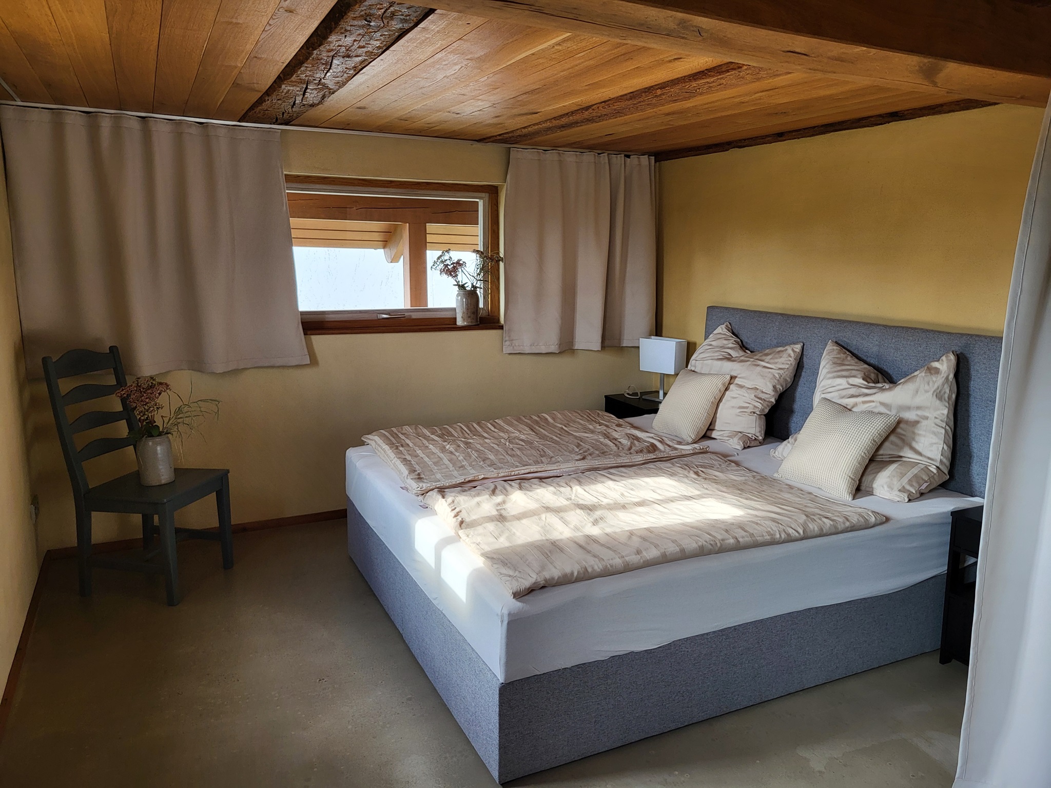 Im Dachgeschoss befinden sich zwei weitere Schlafzimmer (Doppelbett 180x200/ Einzelbett 90x200), welche durch die originalen Dachbalken eine besondere Atmosphäre bieten.