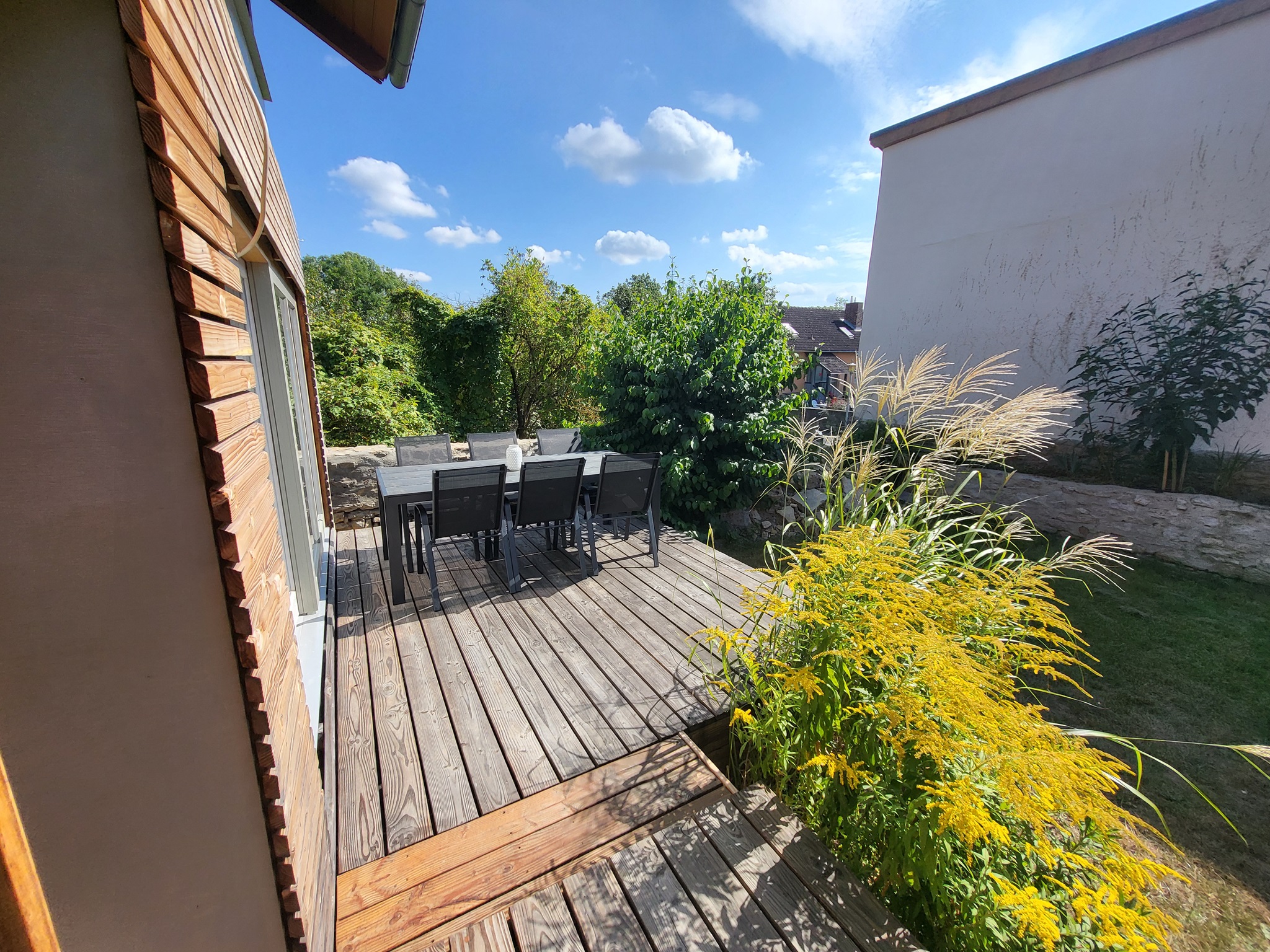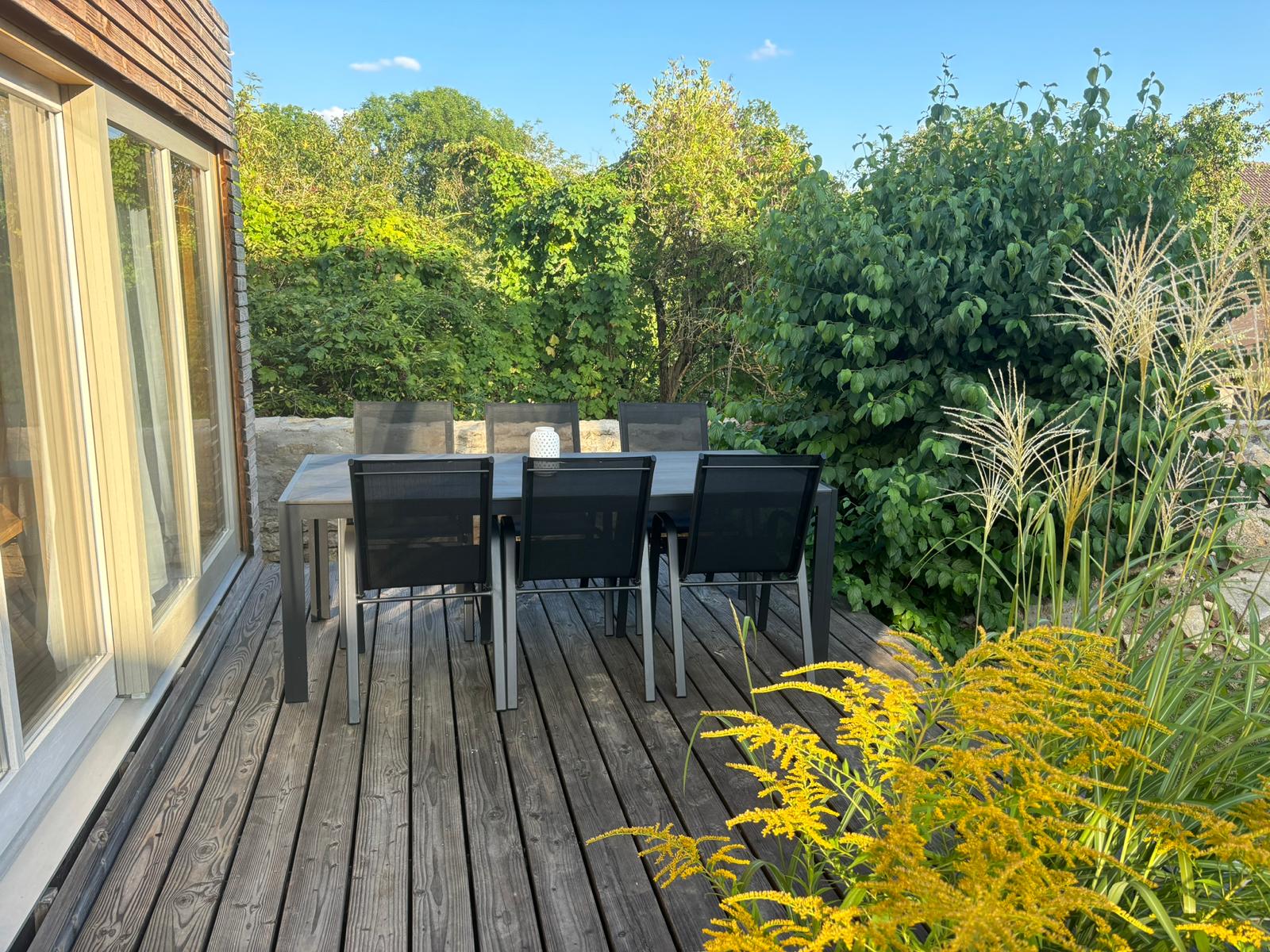 Der Außenbereich des Ferienhauses bietet eine gemütliche Terrasse mit Esstisch, ideal für gemeinsame Mahlzeiten im Freien. Für gemütliche Grillabende steht außerdem eine Grillmöglichkeit im Garten zur Verfügung.