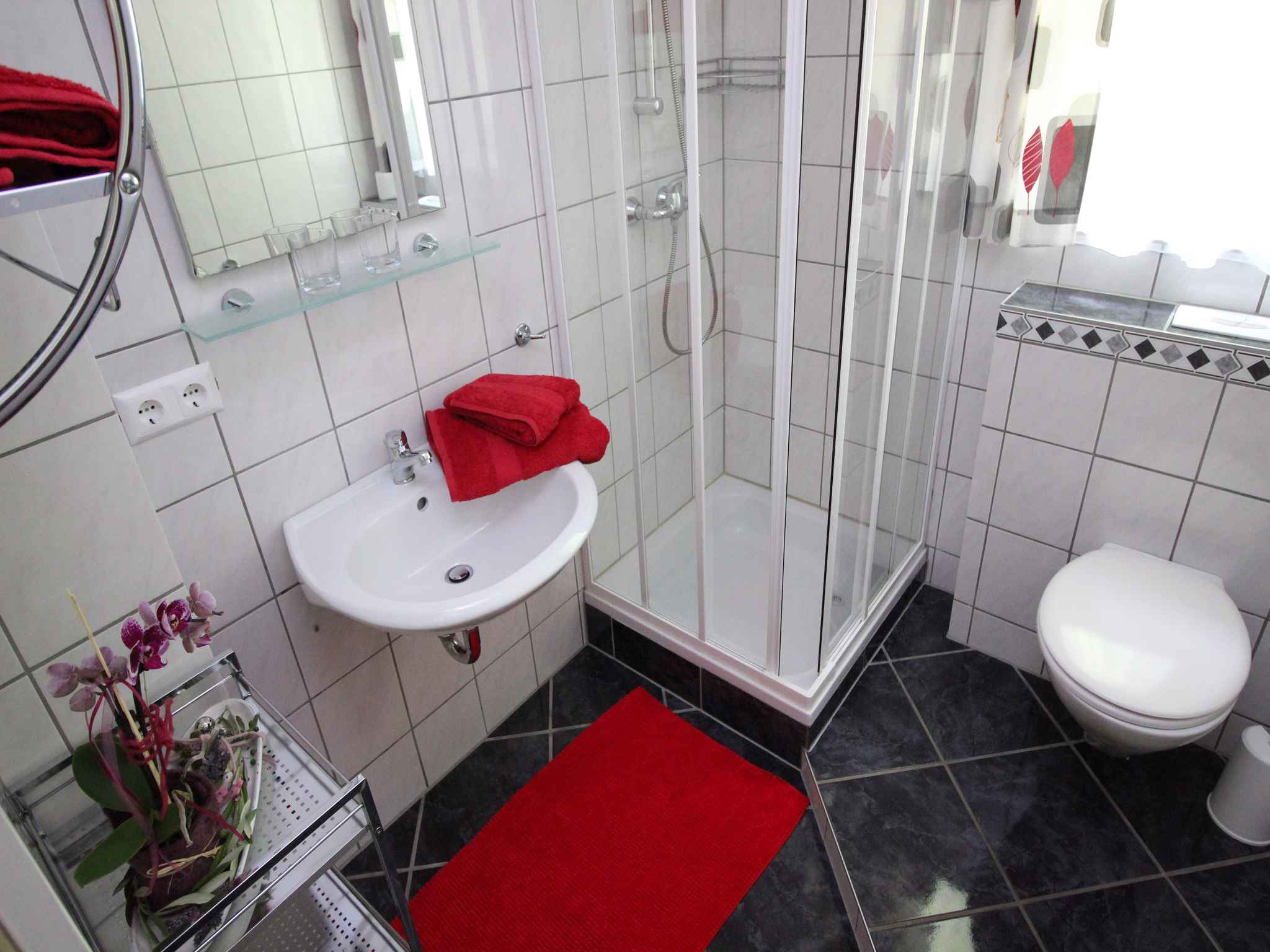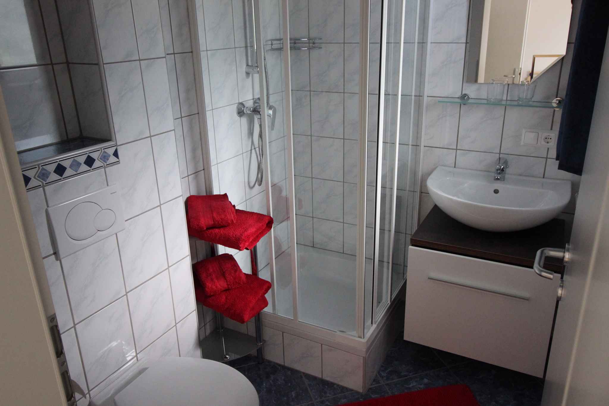 Ihre Ferienwohnung erstreckt sich über 1 Etage, 3 Zimmer (davon 2 Schlafzimmer), ist 75 qm groß und ist für maximal 6 Personen geeignet. An kälteren Tagen kann Ihre Ferienwohnung beheizt werden mit Zentralheizung. Der Eingang führt direkt in den Vorraum mit Garderobe. Die Zimmer teilen sich wie folgt auf: Wohnküche mit 1 Einzelbett. Schlafzimmer mit 1 Doppelbett. Sie haben Zugang zum Balkon. Schlafzimmer mit 1 Doppelbett und 1 Einzelbett. Küche in der Wohnküche mit Essecke, TV, Geschirrspüler, Elektroherd (Cerankochfeld, 4 Platten), Backofen, Dunstabzugshaube, Kühlschrank (Eisfach), Mikrowelle, Kaffeemaschine, Toaster und elektrischem Wasserkocher. 2 Bäder jeweils mit Dusche und WC. Darüber hinaus ist Ihre Ferienwohnung mit WLAN- Internetzugang ausgestattet. TV- bzw. Rundfunksender können per Kabel empfangen werden.