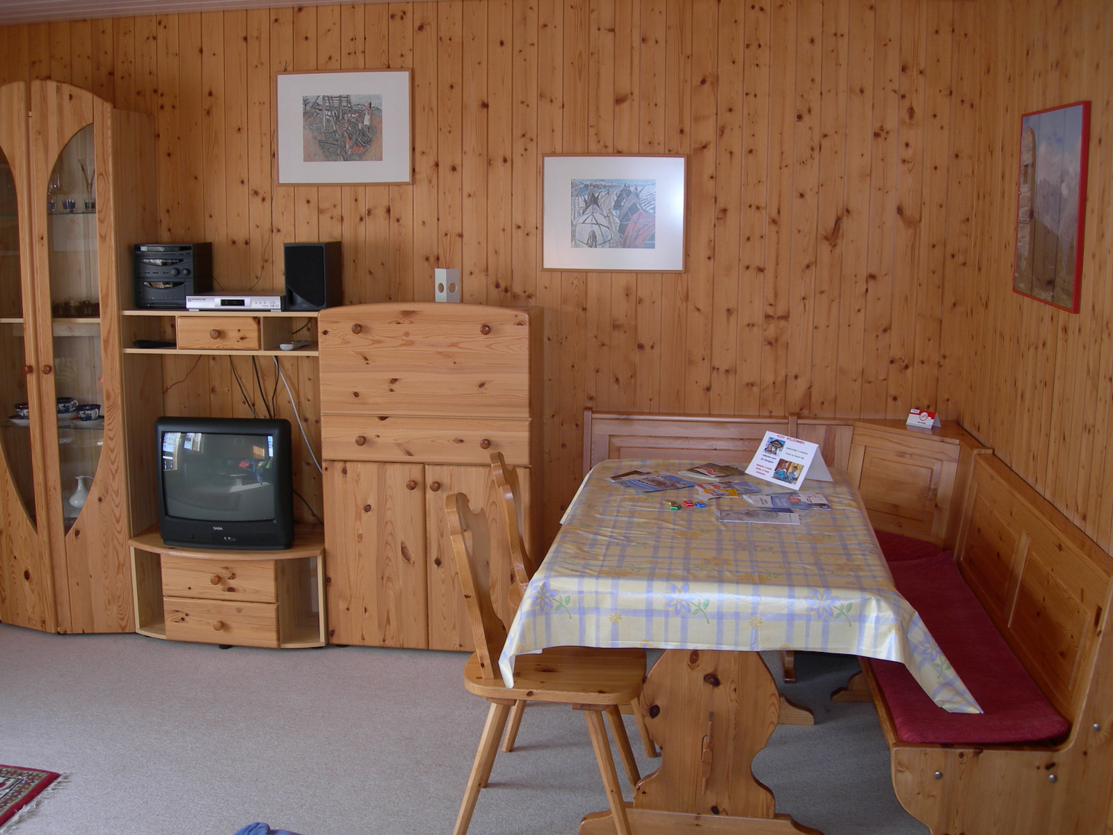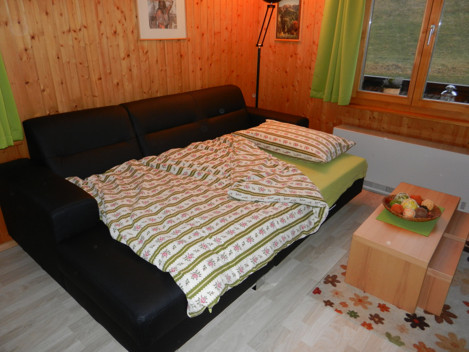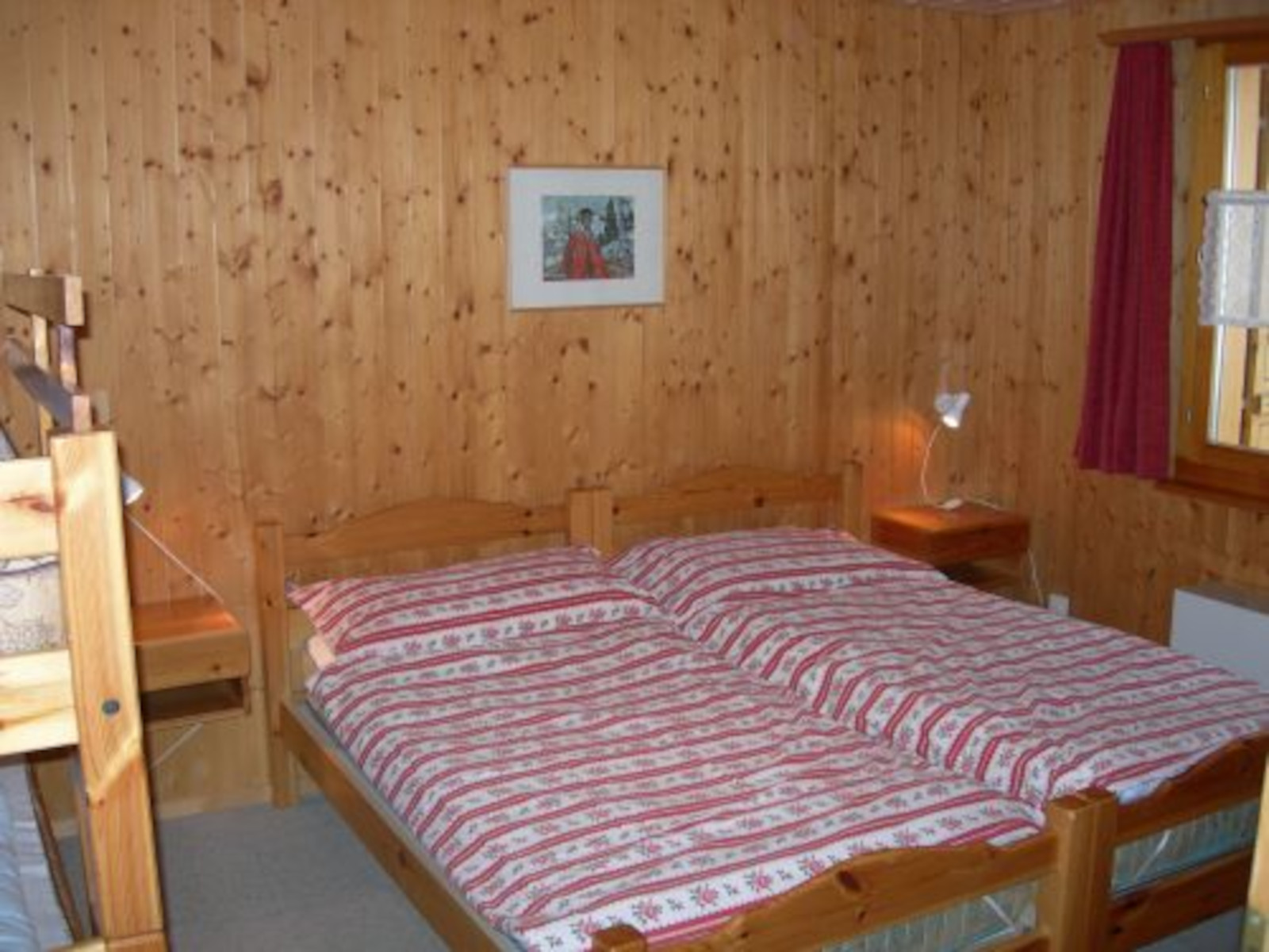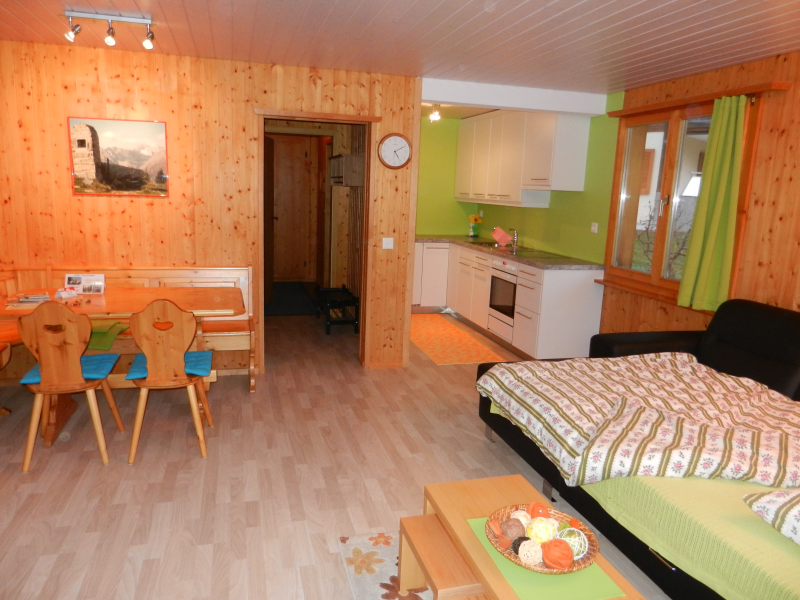 Im Schlafzimmer befindet sich 1 Doppelbett und 1 Kajütenbett, und ein grosser Schiebetürschrank der genügend Platz bietet. Die Bettwäsche ist vorhanden und im Preis inklusiv. Wohnzimmer:
