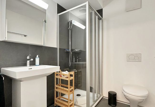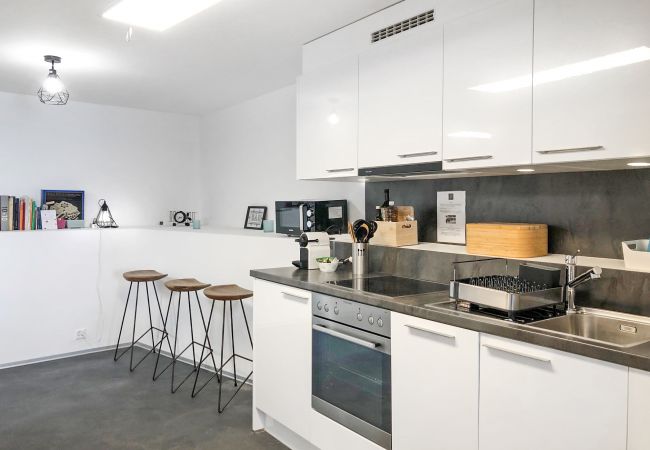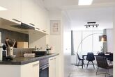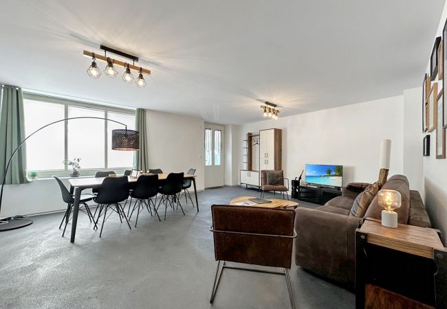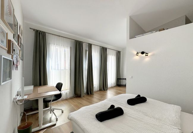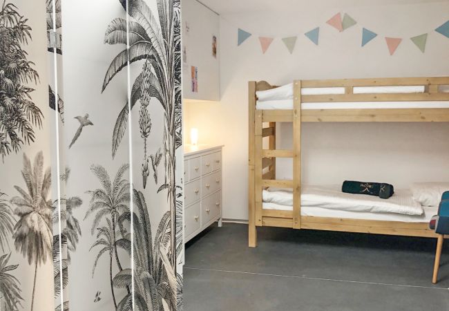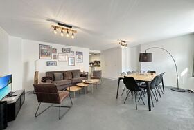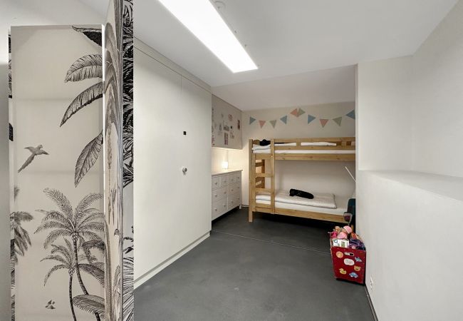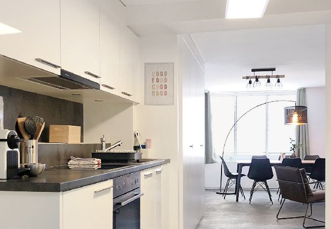 Der Wohnzimmer -Teil der Wohnung ist wie ein Loft aufgebaut: eine voll ausgestattete Küche mit zum Wohnzimmer offenem Barbereich mit Flachbildfernseher und Doppelschlafsofa (160x200), aber auch ein offener Schlafbereich mit ein Etagenbett, das zwei Einzelbetten bietet.