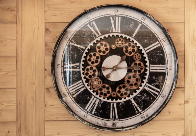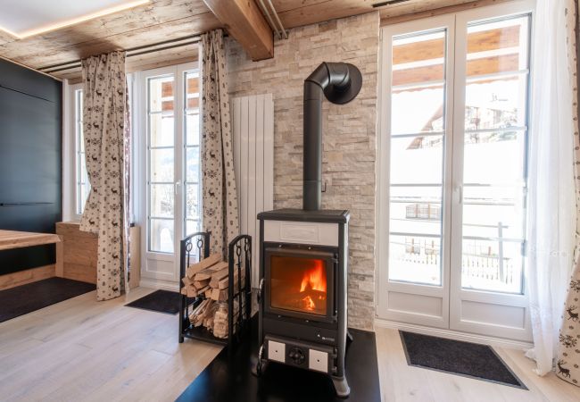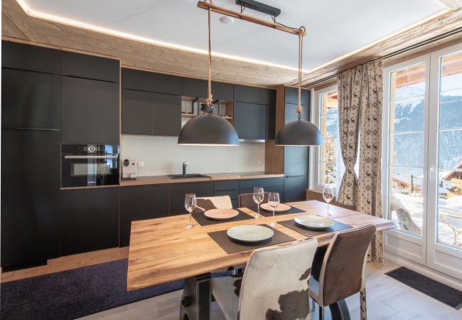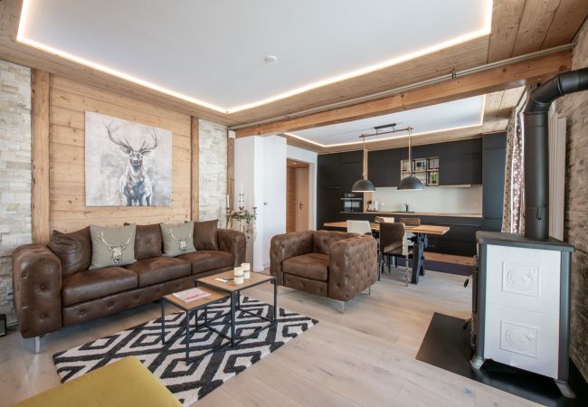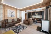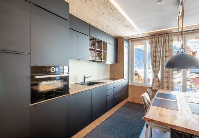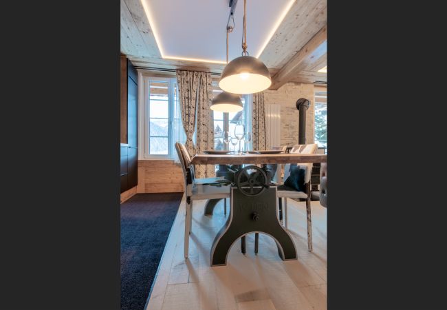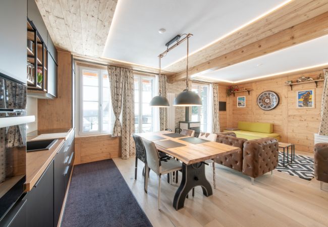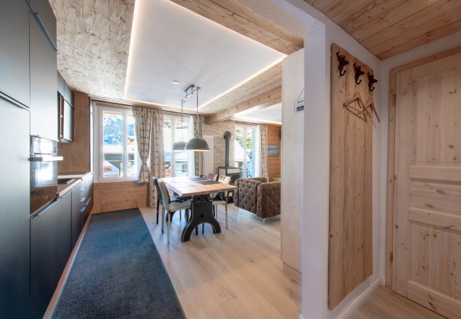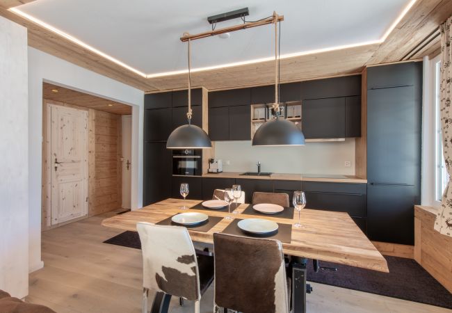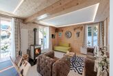 Die gemütliche Wohn-Ess-Küche bietet einen einzigartigen authentischen Raum mit traditionellen Holzbalken, Naturmaterialien und Fenstern im Chalet-Stil, kombiniert mit einer hochmodernen, coolen Küche.