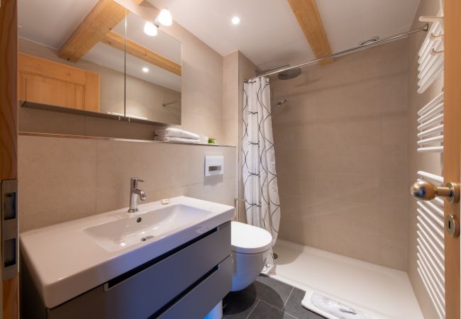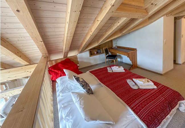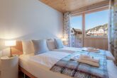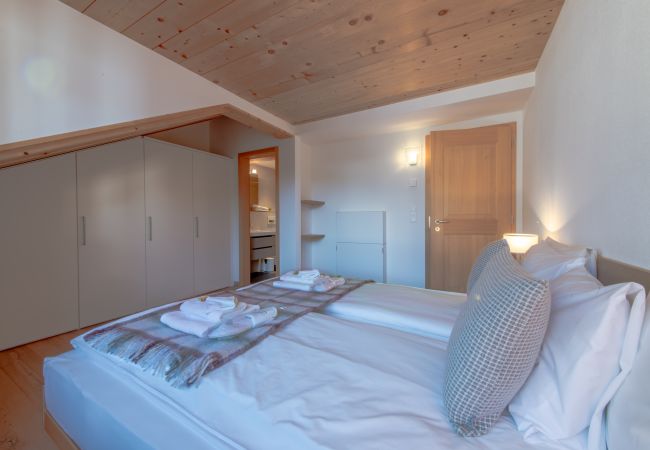 Das Chalet Belmont Penthouse bietet ein stilvolles Schlafzimmer mit Kingsize-Bett (180x200 cm) (auch möglich als zwei Einzelbetten (je 90x200 cm)), das über ein eigenes Duschbad verfügt.