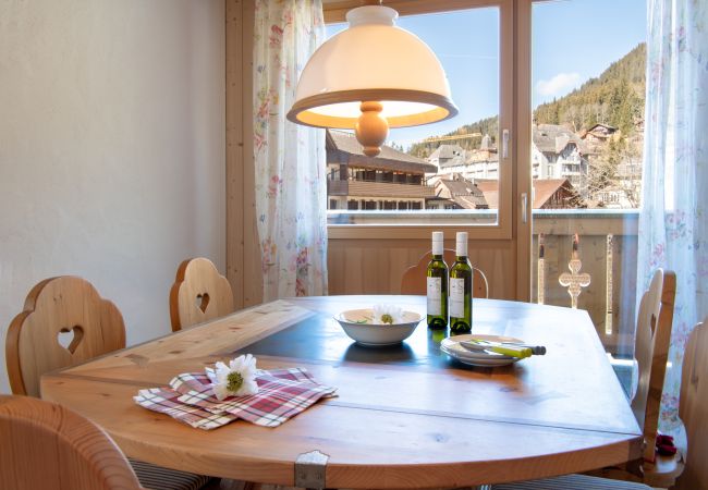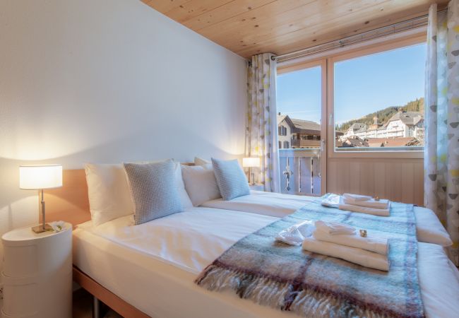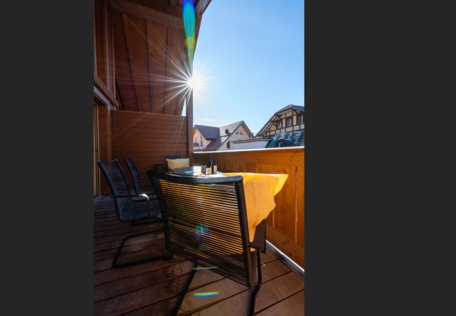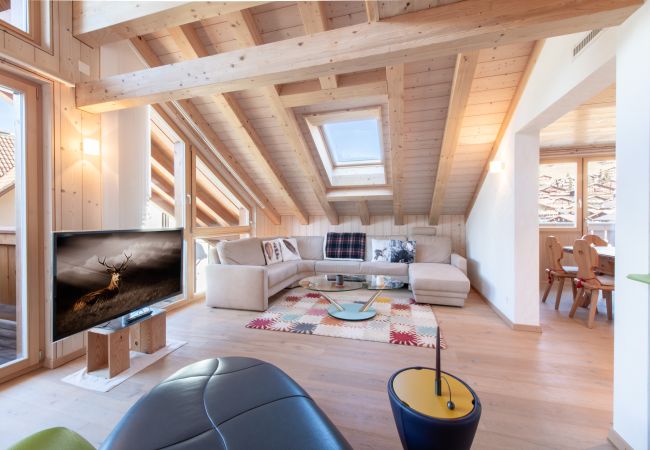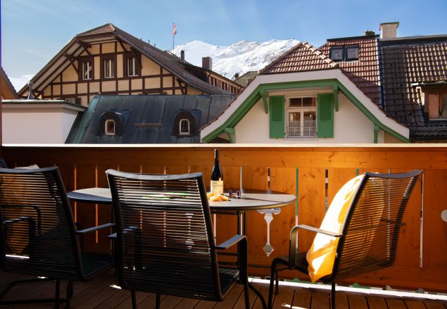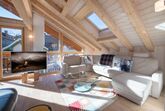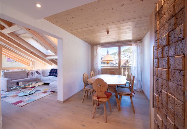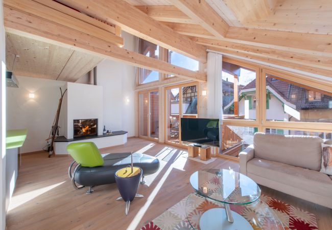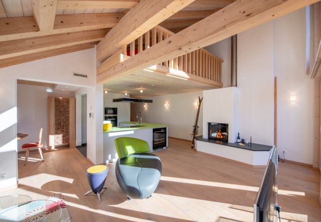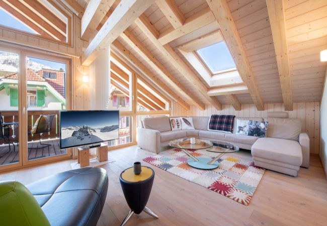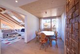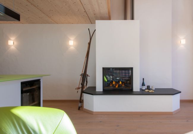 Der geräumige offene Wohn- und Essbereich verfügt über Fenster mit Doppelausrichtung und einen Kamin und öffnet sich zu einem nach Süden ausgerichteten Balkon, der auf die Wengen Hauptstraße blickt.