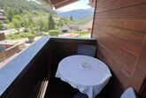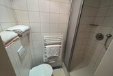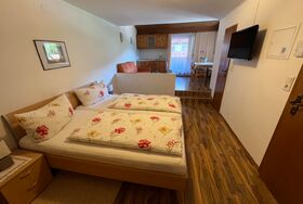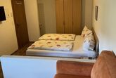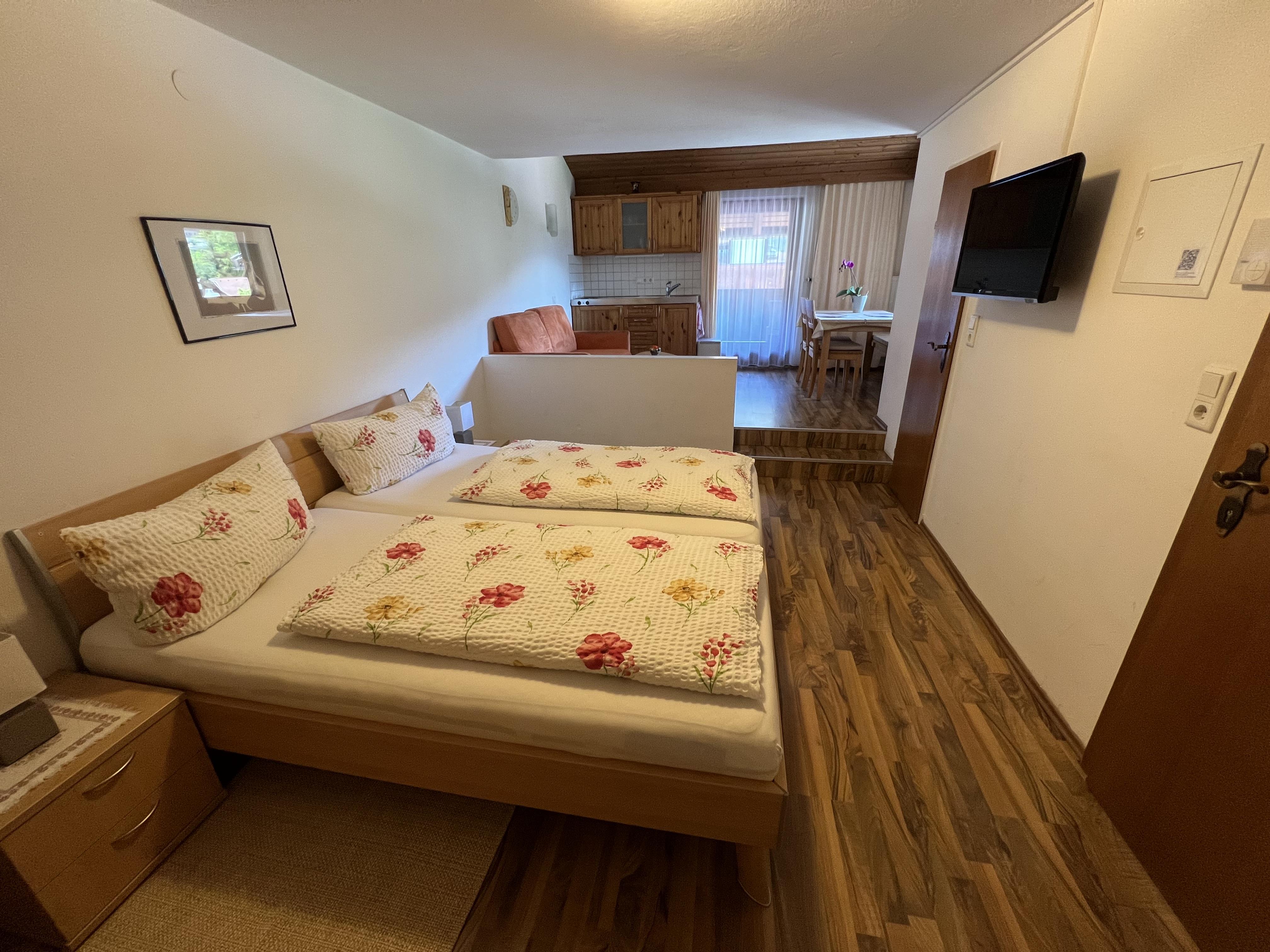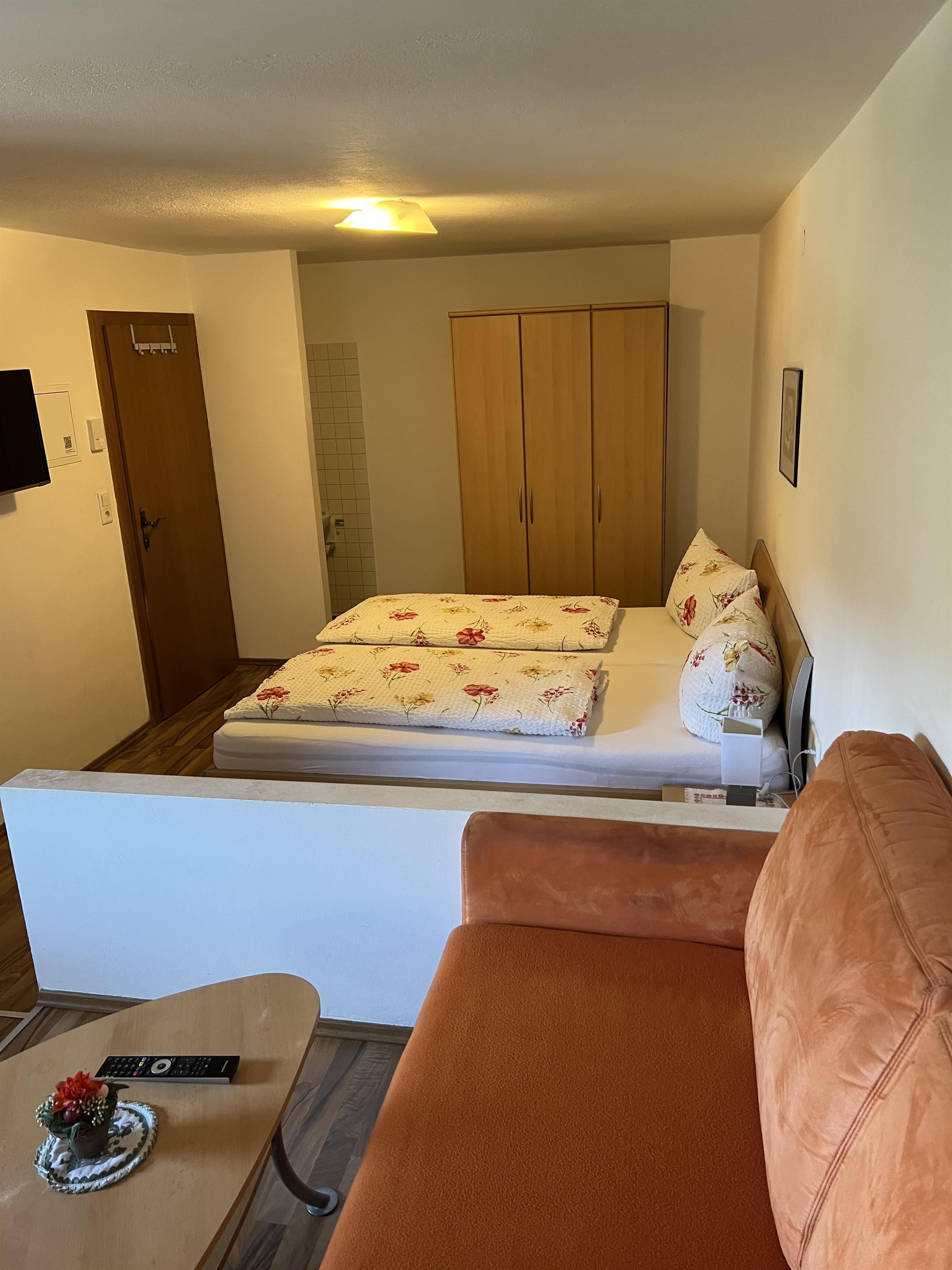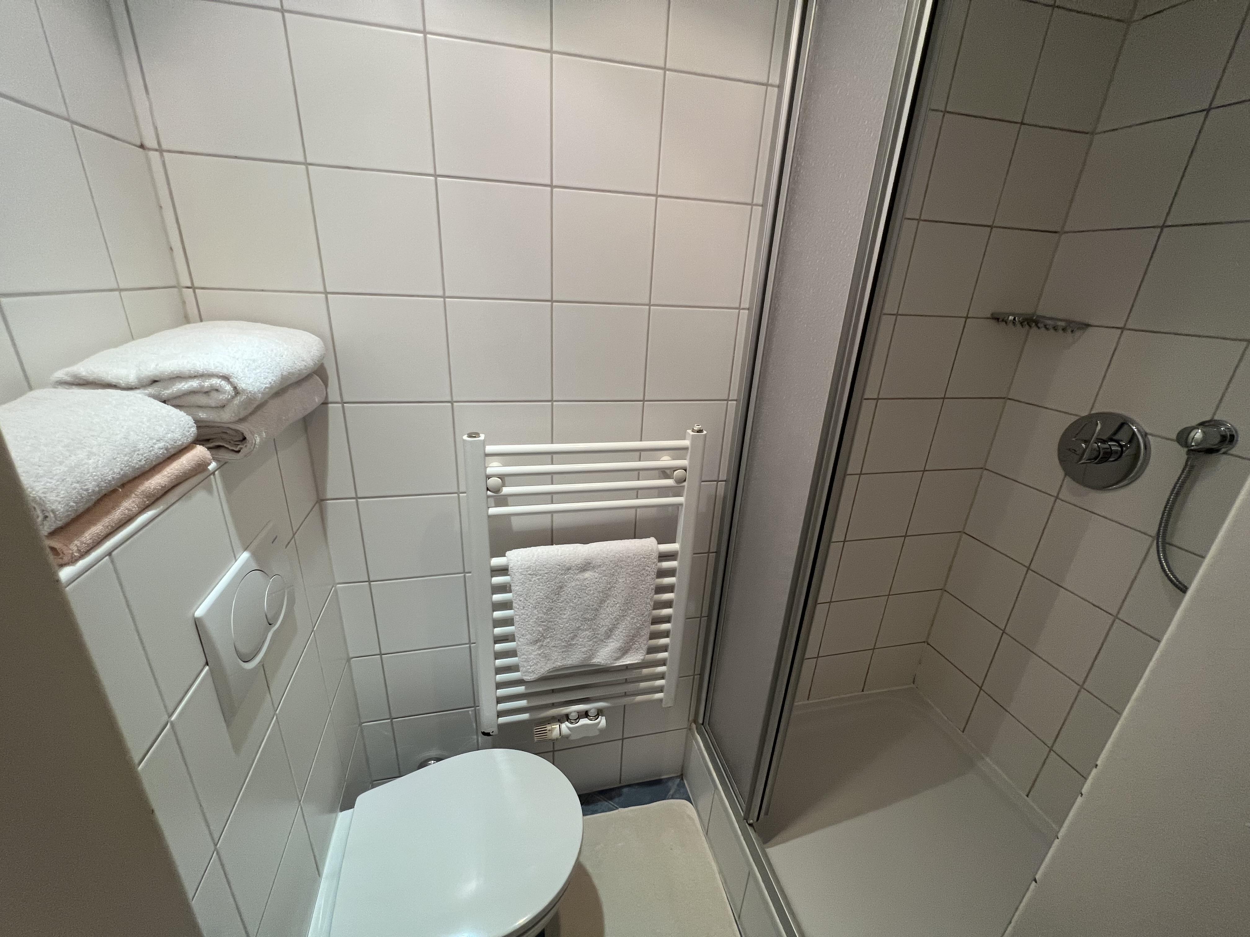 Das mit Dusche und WC ausgestattete Doppelzimmer ist durch einen offenen Durchgang mit dem gemütlichen Wohnbereich verbunden.