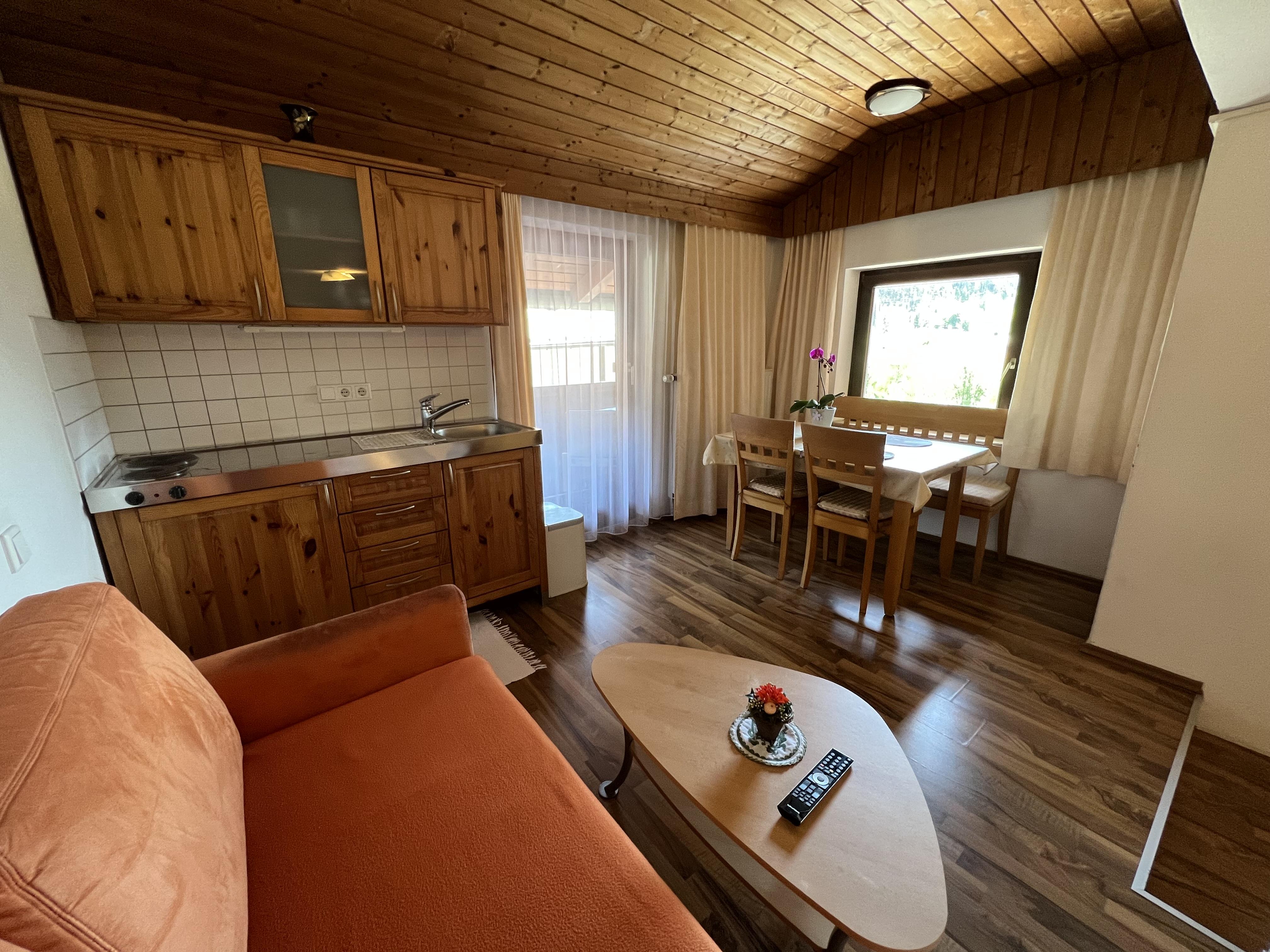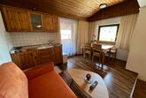 Hier finden Sie Küche, Essplatz, Sofa mit Bettfunktion und SAT-TV.
