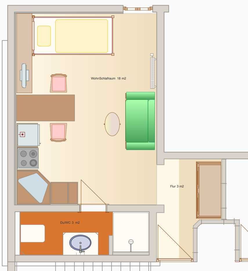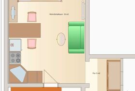 Die FeWo ist ausgestattet mit einer Auszugcouch, Essplatz und Kueche mit Spüle, Herd und Kuehlschrank mit Gefrierfach.