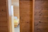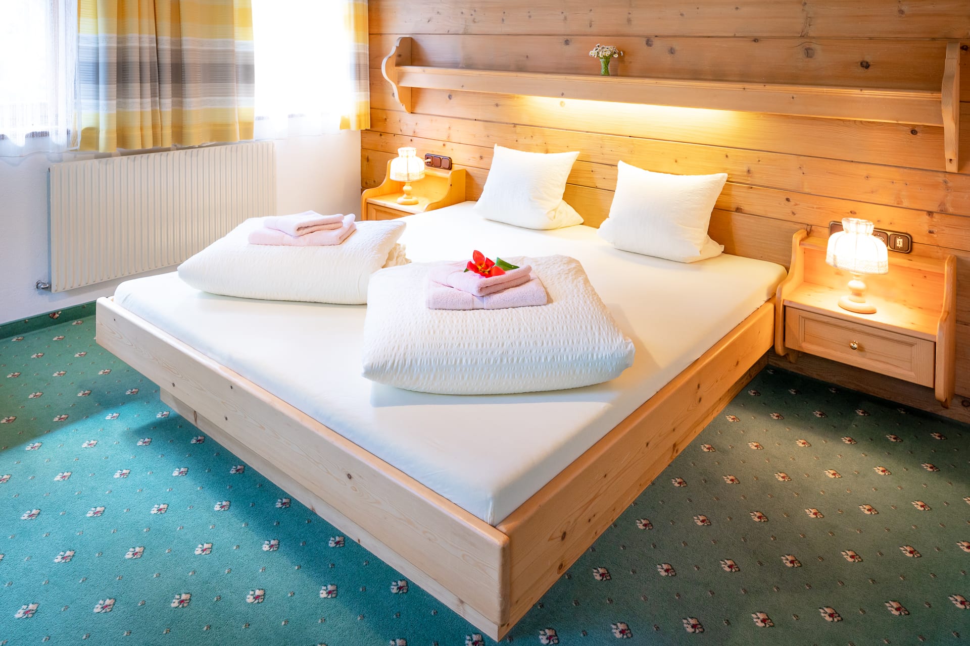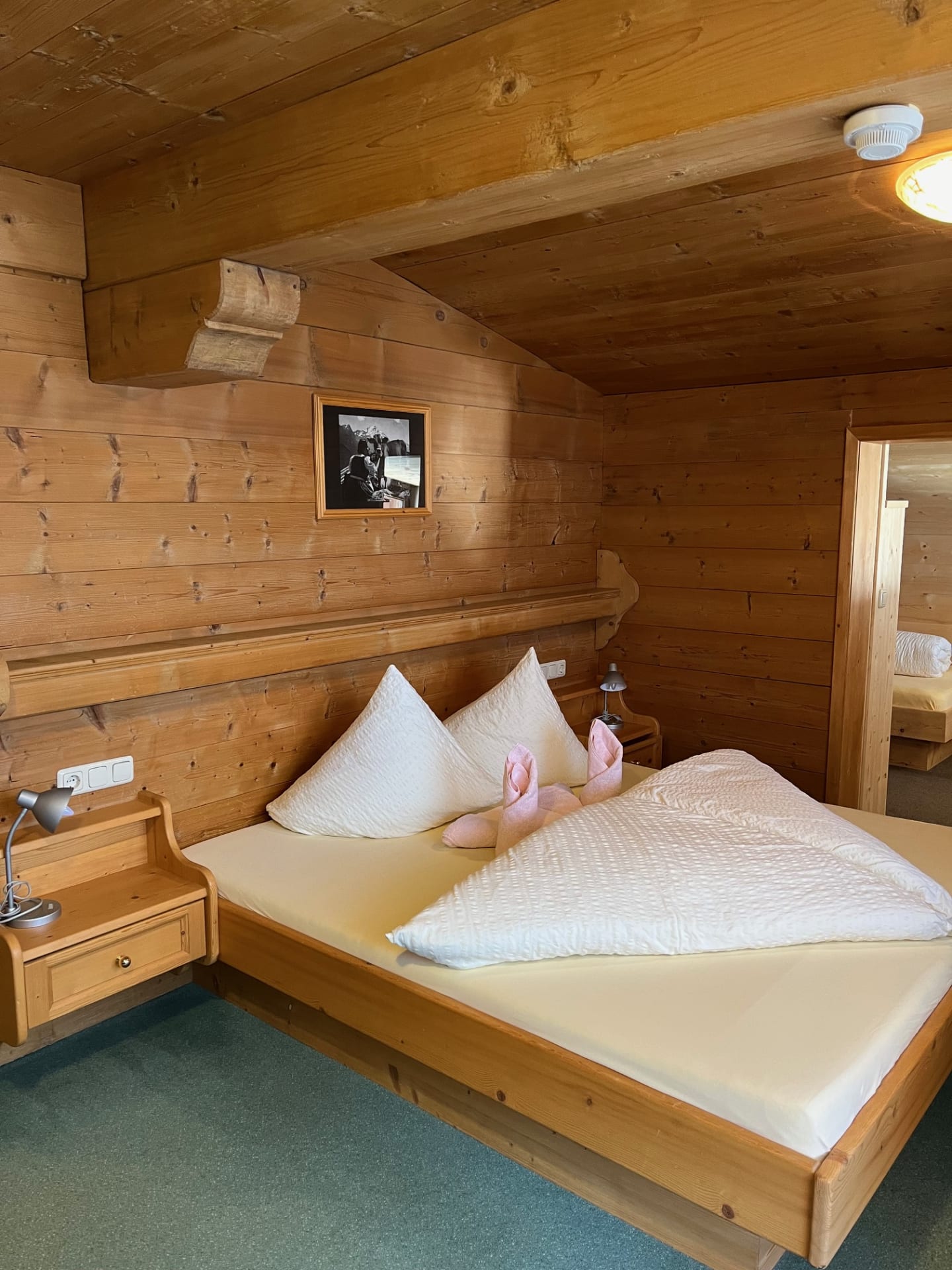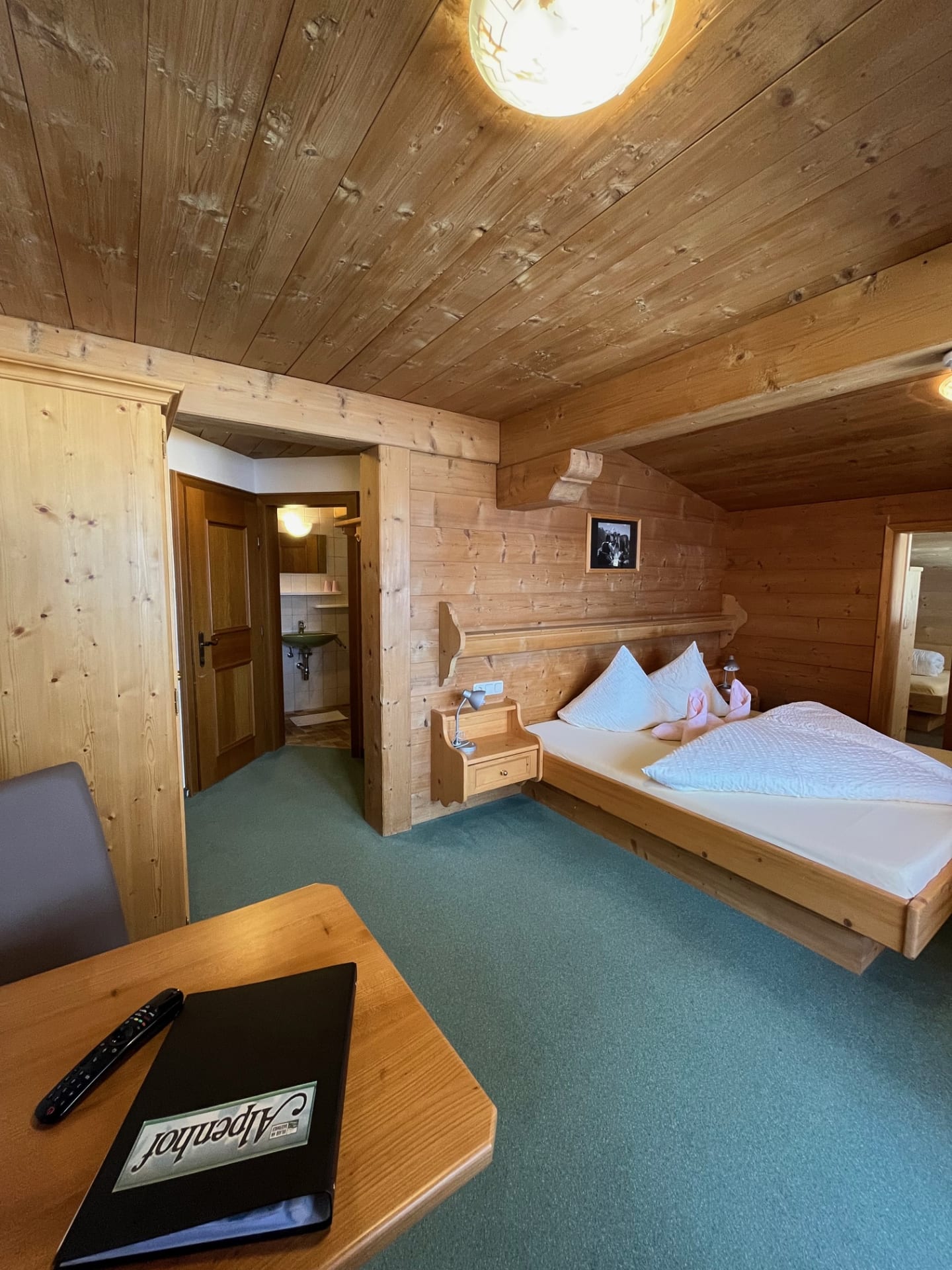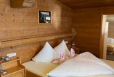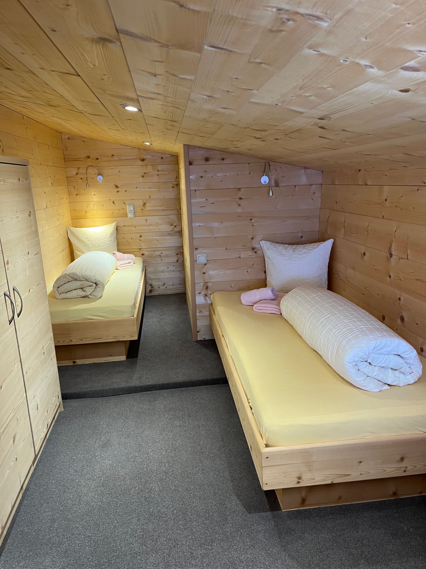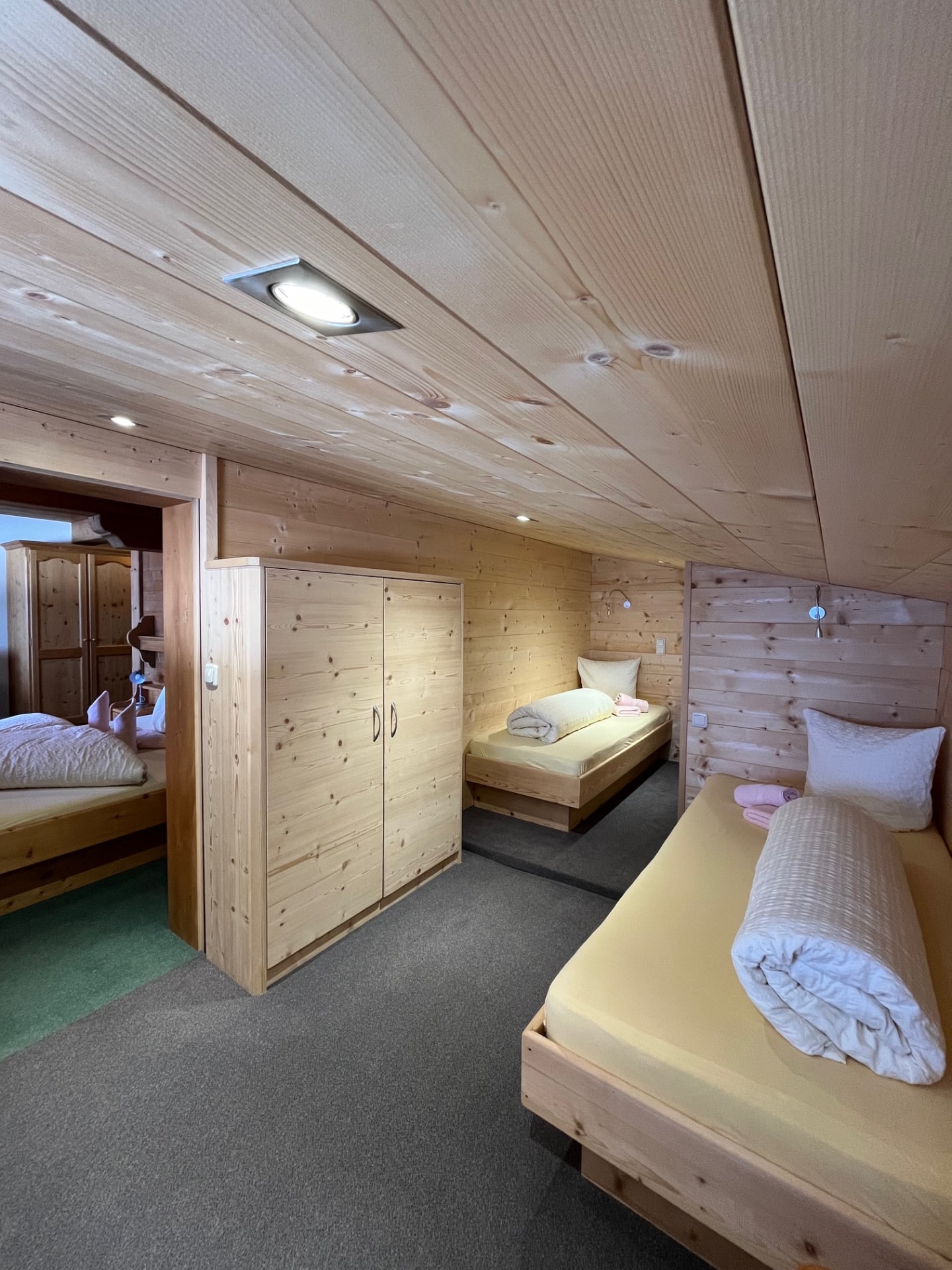 Die Erwachsenen wohnen im rustikalen Doppelzimmer mit eigenem Balkon, die Kinder beziehen die Räuberhöhle mit 2 Einzelbetten, welche durch eine Schiebetüre vom Elternzimmer getrennt ist. Dachgeschoßzimmer