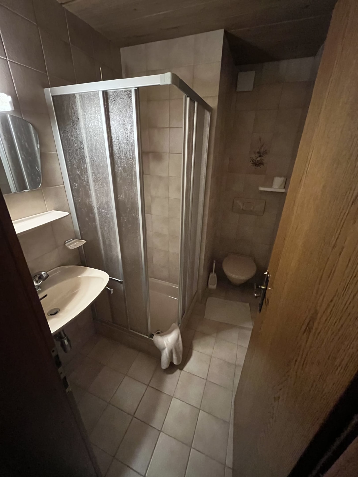 Doppelzimmer mit Balkon und separatem Schlafzimmer (Stockbett). Dusche/WC befindet sich zwischen den beiden Räumen, von beiden Seiten begehbar und abschließbar.