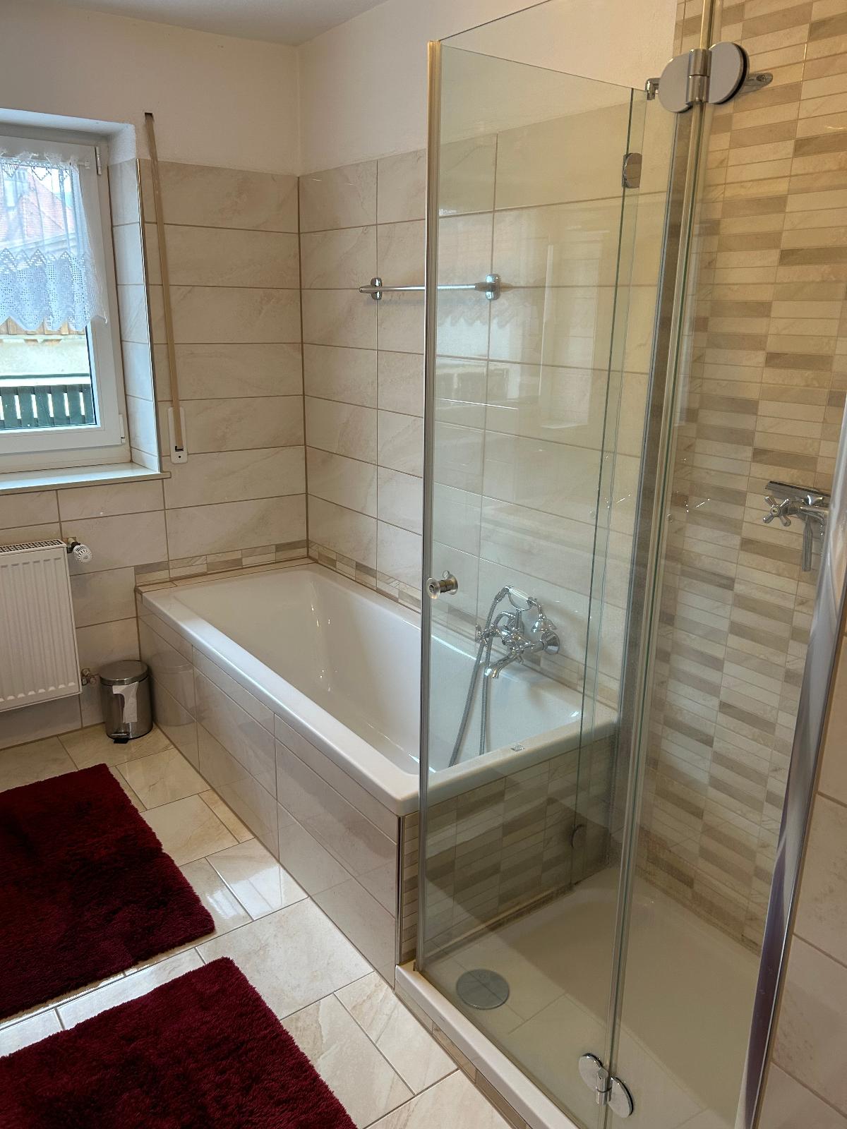 Badezimmer verfügt über Dusche, Badewanne und WC. WC extra vorhanden. Ein privater PKW-Parkplatz steht nur auf