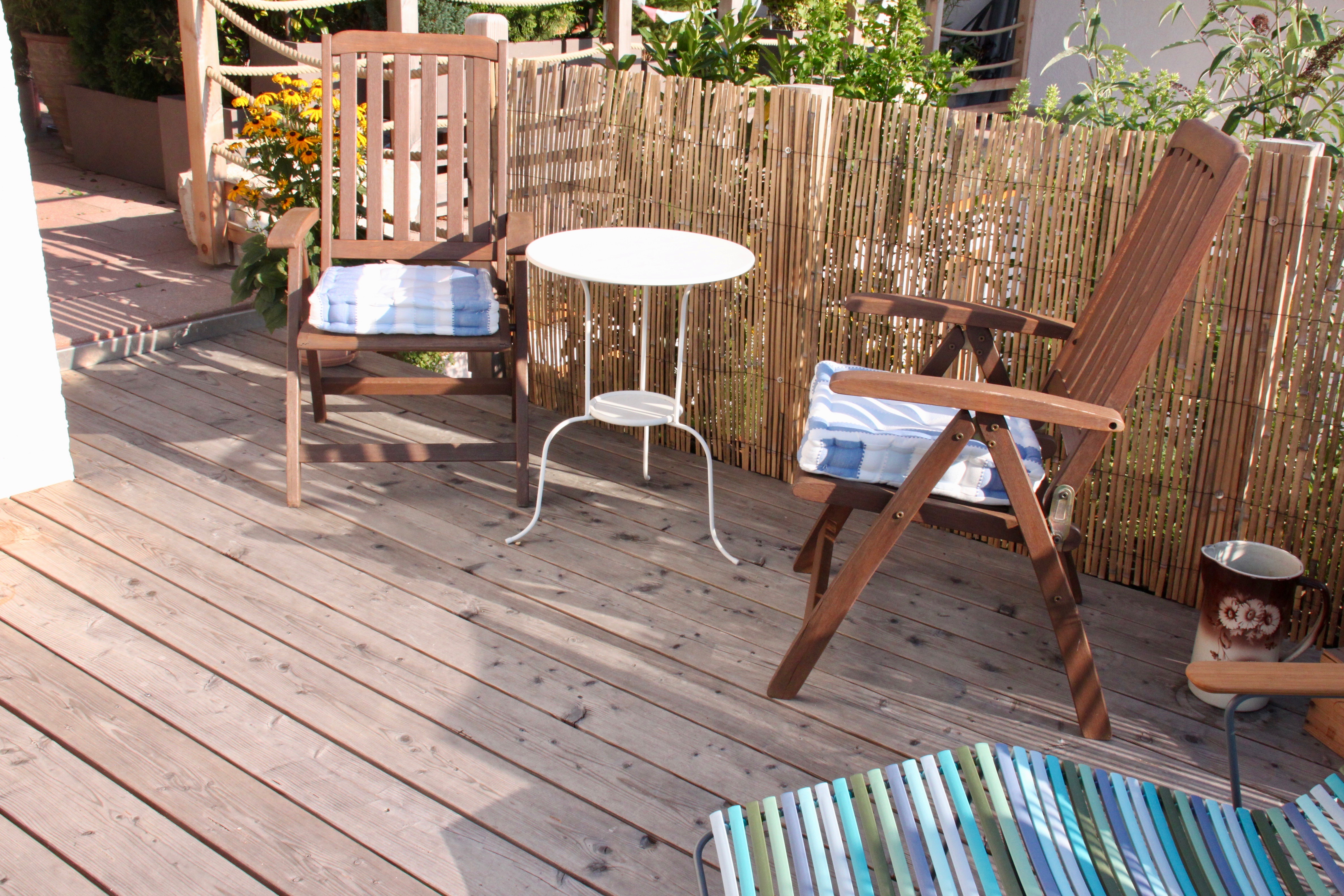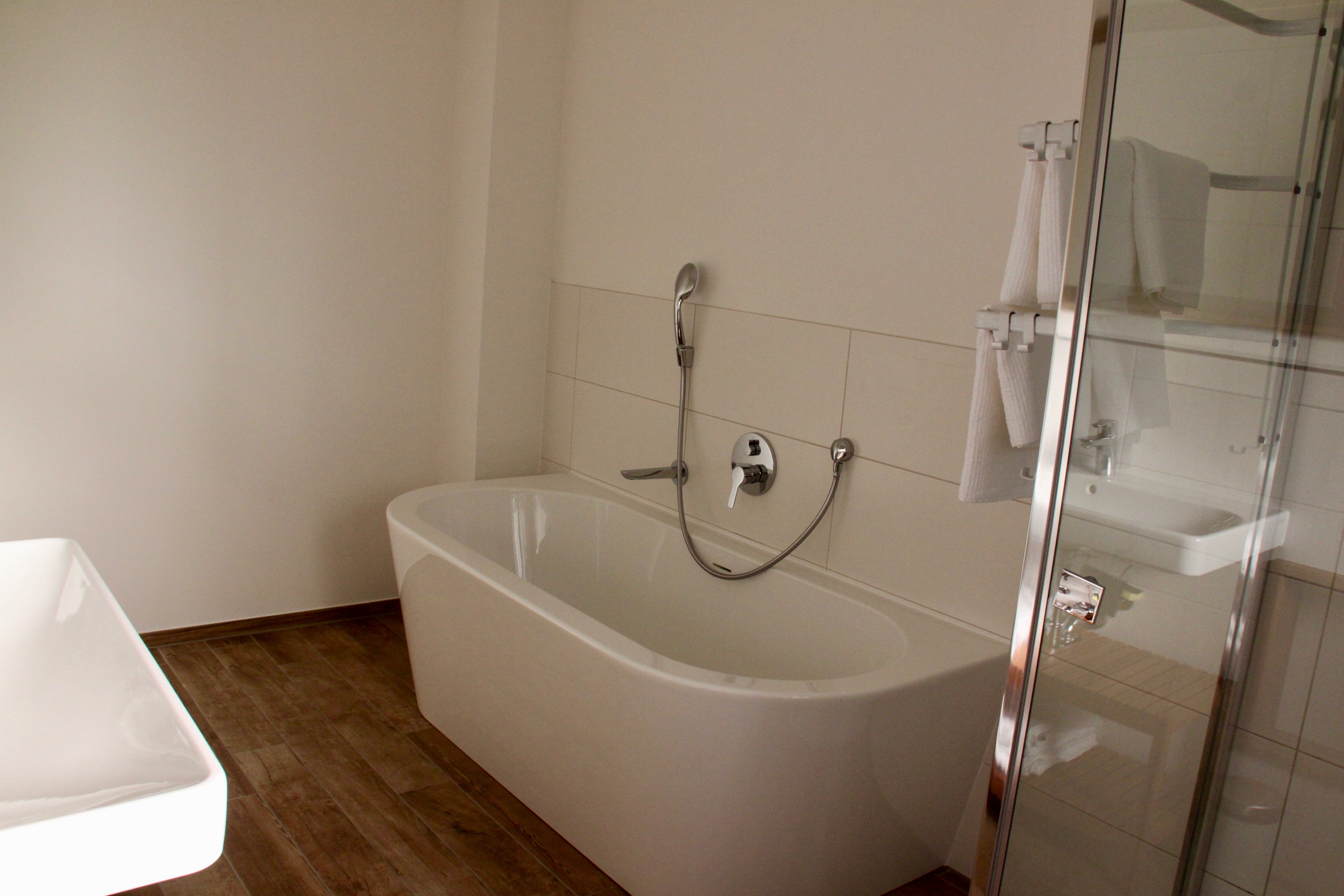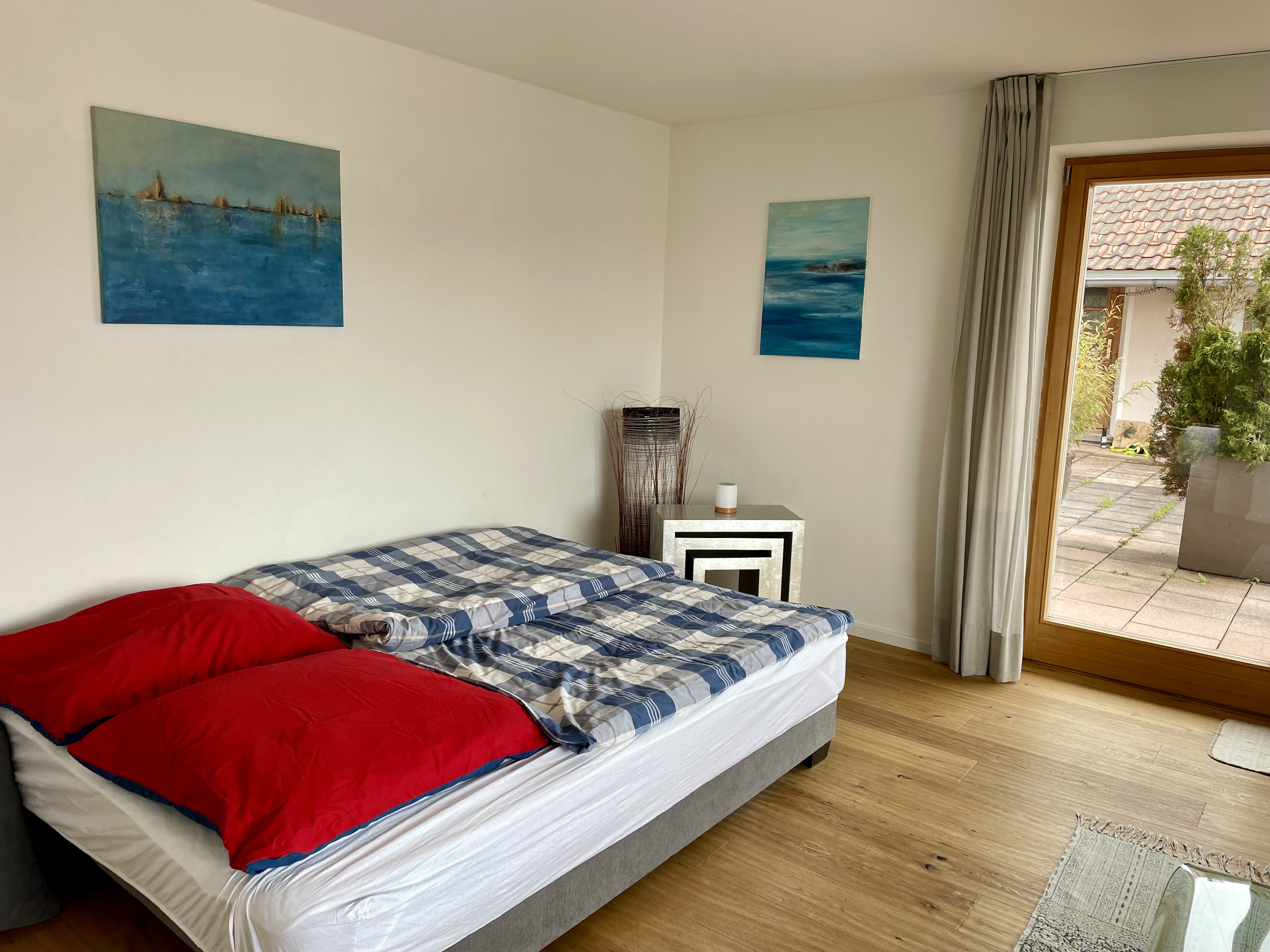 Die etwas größere Ferienwohnung hat zwei Schlafzimmern (neues Boxspringbett, zwei Einzelbetten) plus Schlaf-Wohnzimmer mit neuer komfortabler Boxspring-Schlafcouch (2 Personen), eine große Küche mit luxuriöser Ausstattung und wohnlichem Essbereich. Die sonnige Terrasse (30qm) lädt mit gemütlichen Terrassenmöbeln zum Lesen, Entspannen und draußen Essen ein. Das Bad ist mit Badewanne, Dusche und WC ausgestattet. Ein separates WC ist zusätzlich vorhanden.