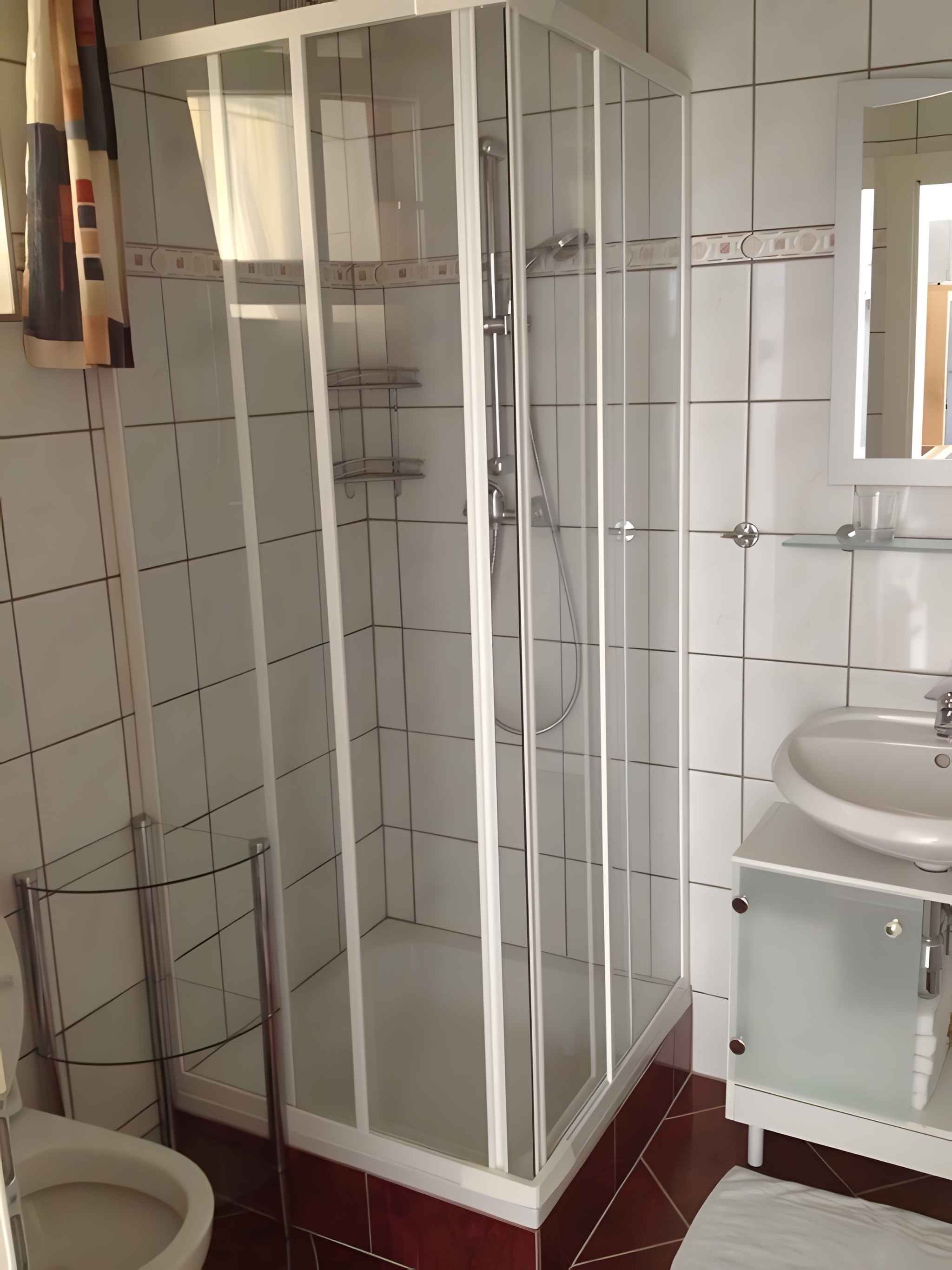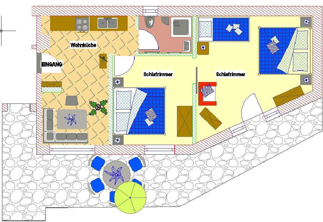 Ihre Ferienwohnung erstreckt sich über 1 Etage, 3 Zimmer (davon 2 Schlafzimmer), ist 72 qm groß und ist für maximal 5 Personen geeignet. An kälteren Tagen kann Ihre Ferienwohnung beheizt werden mit Zentralheizung. Der Eingang ist im Erdgeschoss und führt direkt in den Flur mit Garderobe. Die Zimmer teilen sich wie folgt auf: Wohnküche mit TV. Schlafzimmer mit 1 Doppelbett. Sie haben Zugang zur Terrasse. Schlafzimmer mit 1 Doppelbett und 1 Einzelbett. Sie haben Zugang zur Terrasse. Küche mit Geschirrspüler, Elektroherd (Cerankochfeld, 4 Platten), Kühlschrank (Eisfach), Mikrowelle, Kaffeemaschine, Toaster und elektrischem Wasserkocher. Bad mit Dusche und WC. Darüber hinaus ist Ihre Ferienwohnung mit WLAN- Internetzugang ausgestattet. TV- bzw. Rundfunksender können per Kabel empfangen werden.