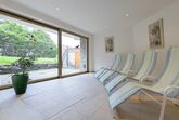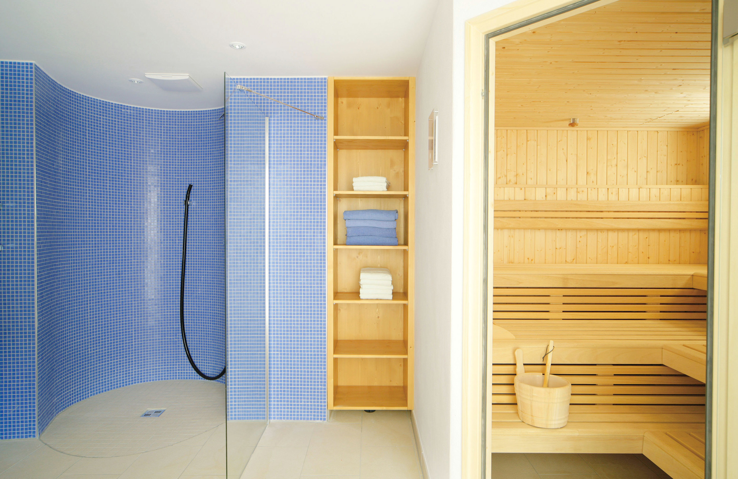 Ein Saunabereich mit finnischer Sauna, Erlebnisduschen sowie Ruheraum mit Südterrasse laden zur Entspannung ein.