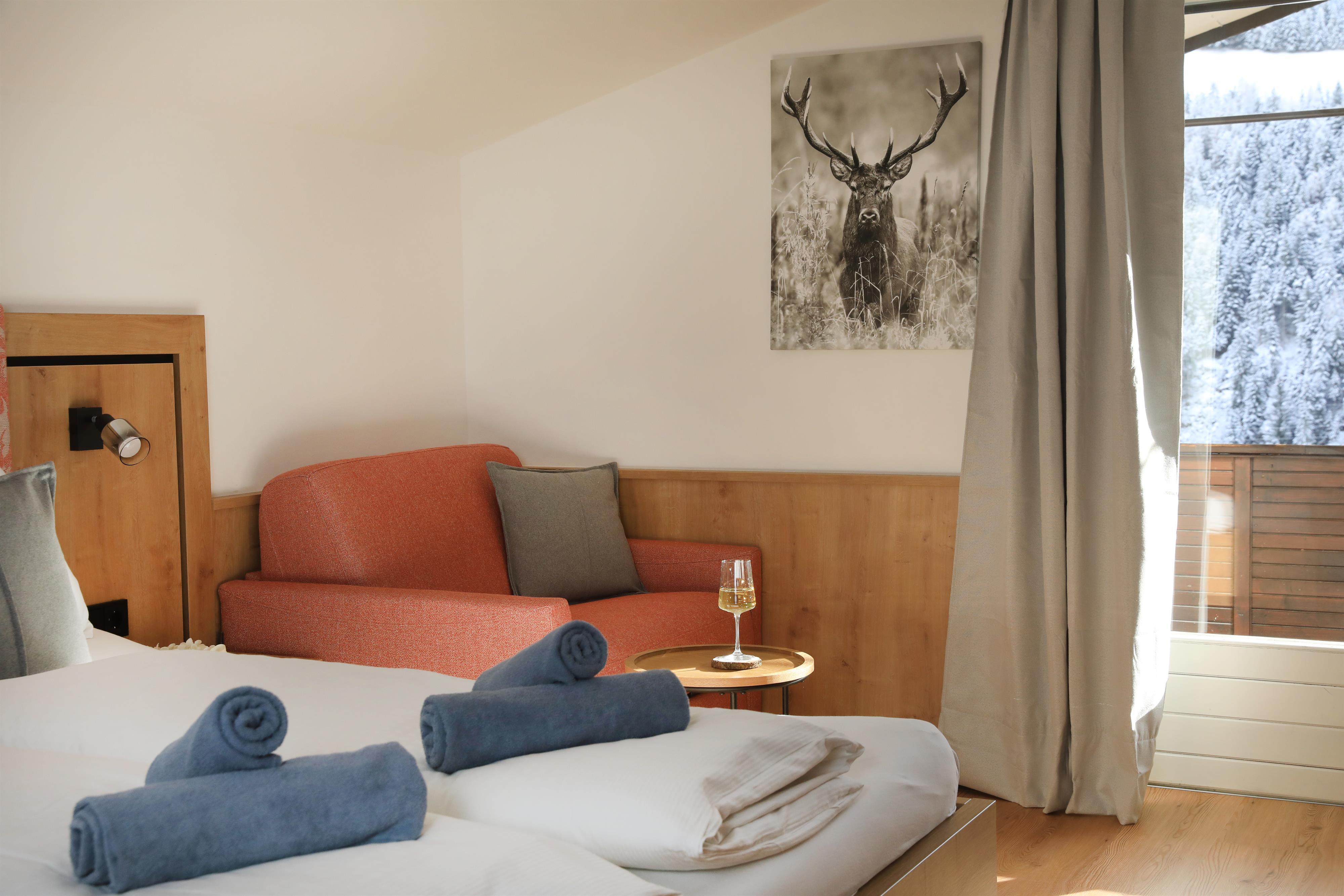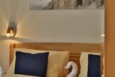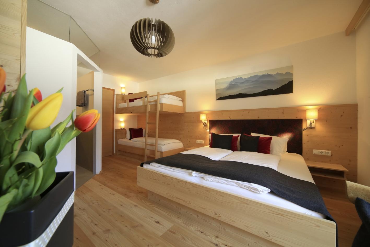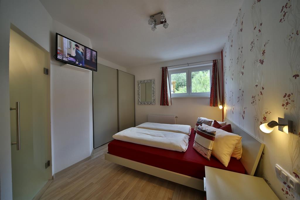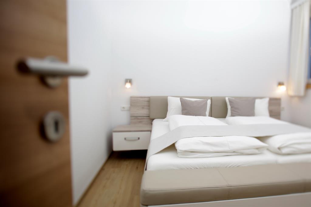 Modernes Schlafzimmer mit Vorraum Bad und direktem Zugang zum Garten. Die Ausstattung mit all den Extras, die Sie in unseren Doppelzimmern vorfinden, werden Sie schätzen.