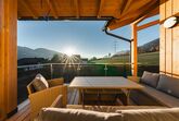 The living area invites you to relax with a large dining table, cosy seating area and direct access to the 22 m² panoramic terrace – here you can enjoy breakfast with a view of the Alps or the sunset over the peaks of Ski Amadé in the evening.