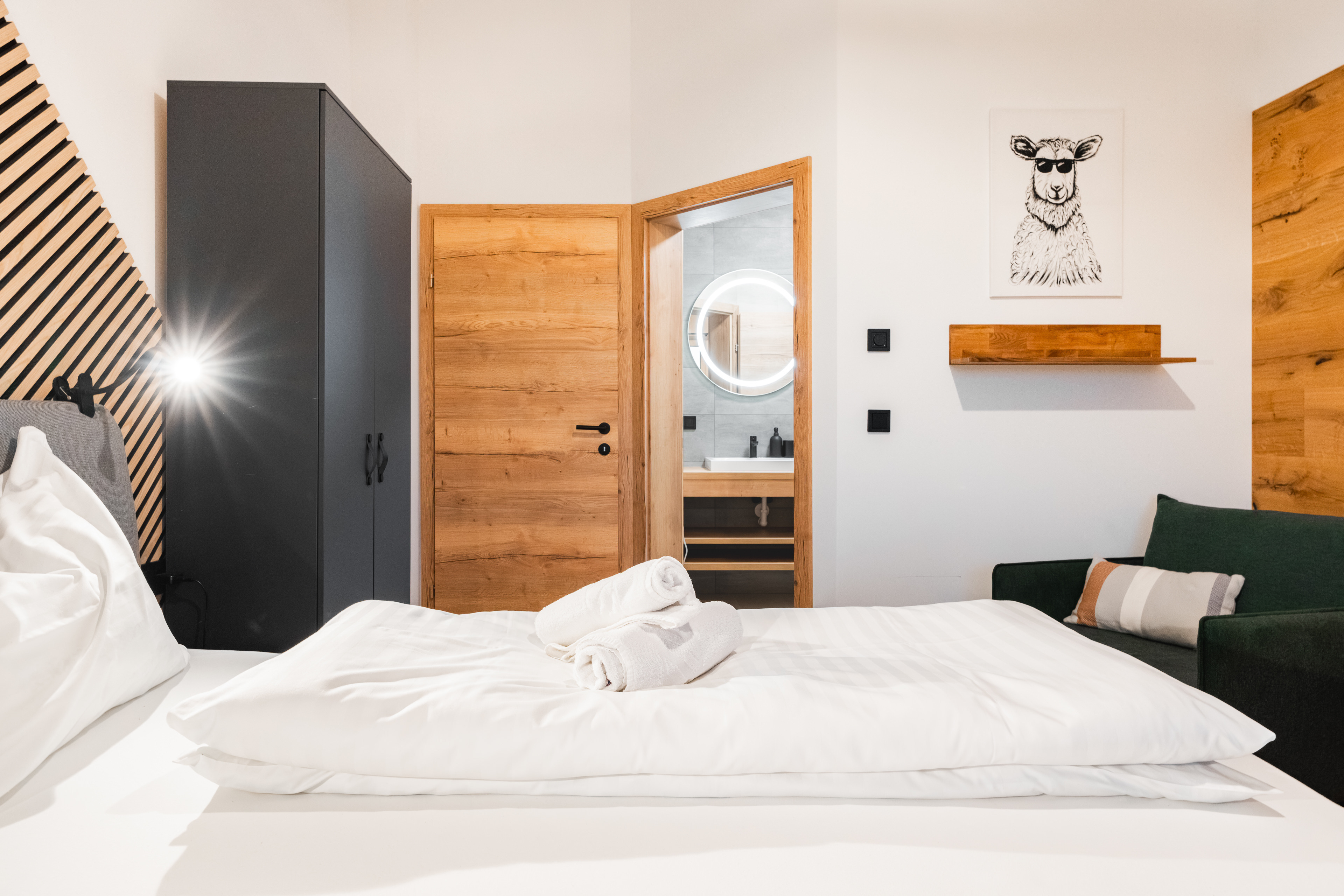 Das moderne Apartment Aich Amadé bietet auf 88 m² höchsten Komfort für Familien und Gruppen bis zu 8-10 Personen. Drei Schlafzimmer (3× Doppelbett, 1× Etagenbett) und zwei ausziehbare Sofas.
