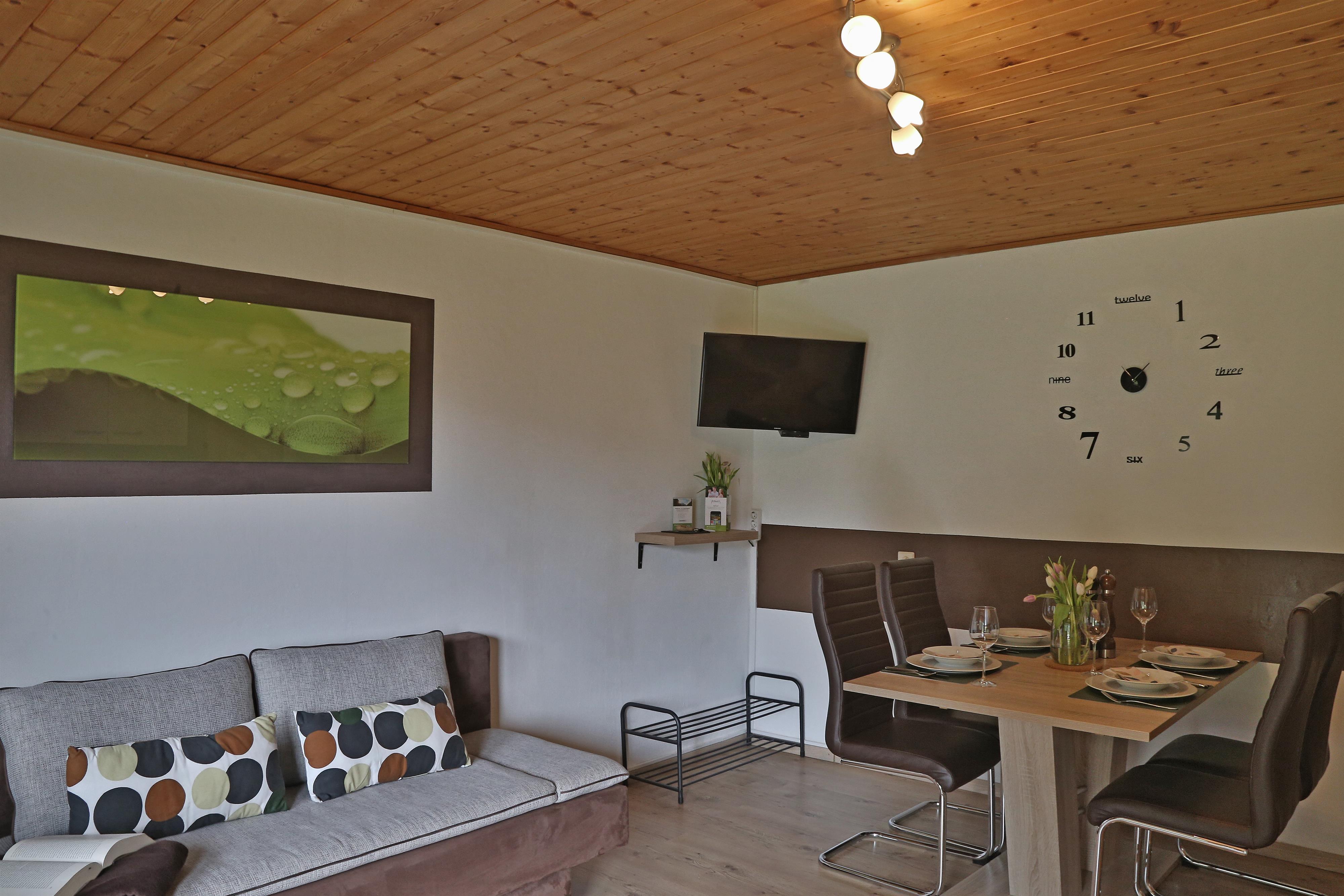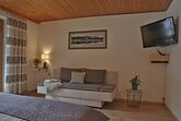 Dieses großzügige Apartment im ersten Stock mit Balkon bietet komfortablen Platz für bis zu sechs Personen. Auf der ausziehbaren Couch können zwei weitere Gäste untergebracht werden.