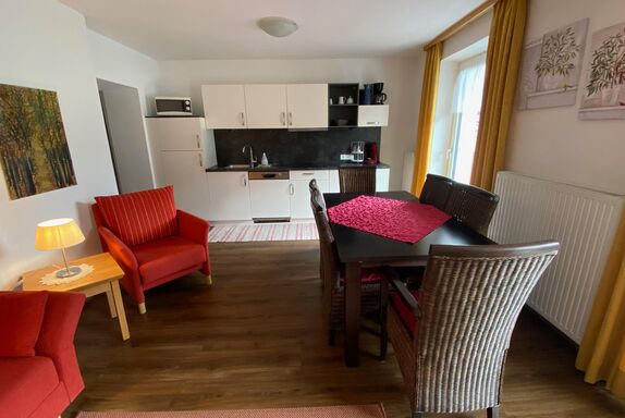 65 m² bestehend aus: 2 Doppelzimmer mit Boxspringbetten und Verbindungstür, 1Wohnzimmer mit schöner Couch (erweiterbar zum vollwertigen Doppelbett), 2 Sat/TV. Weiters verfügt die Wohnung über eine komplett ausgestattete Wohnküche mit Minibackofen, Geschirrspüler, Gefrierschrank und schöne Esstisch. Das Badezimmer ist neu renoviert mit ebenerdiger Dusche/WC. Alle Wohnbereiche sind mit Parkett ausgelegt.