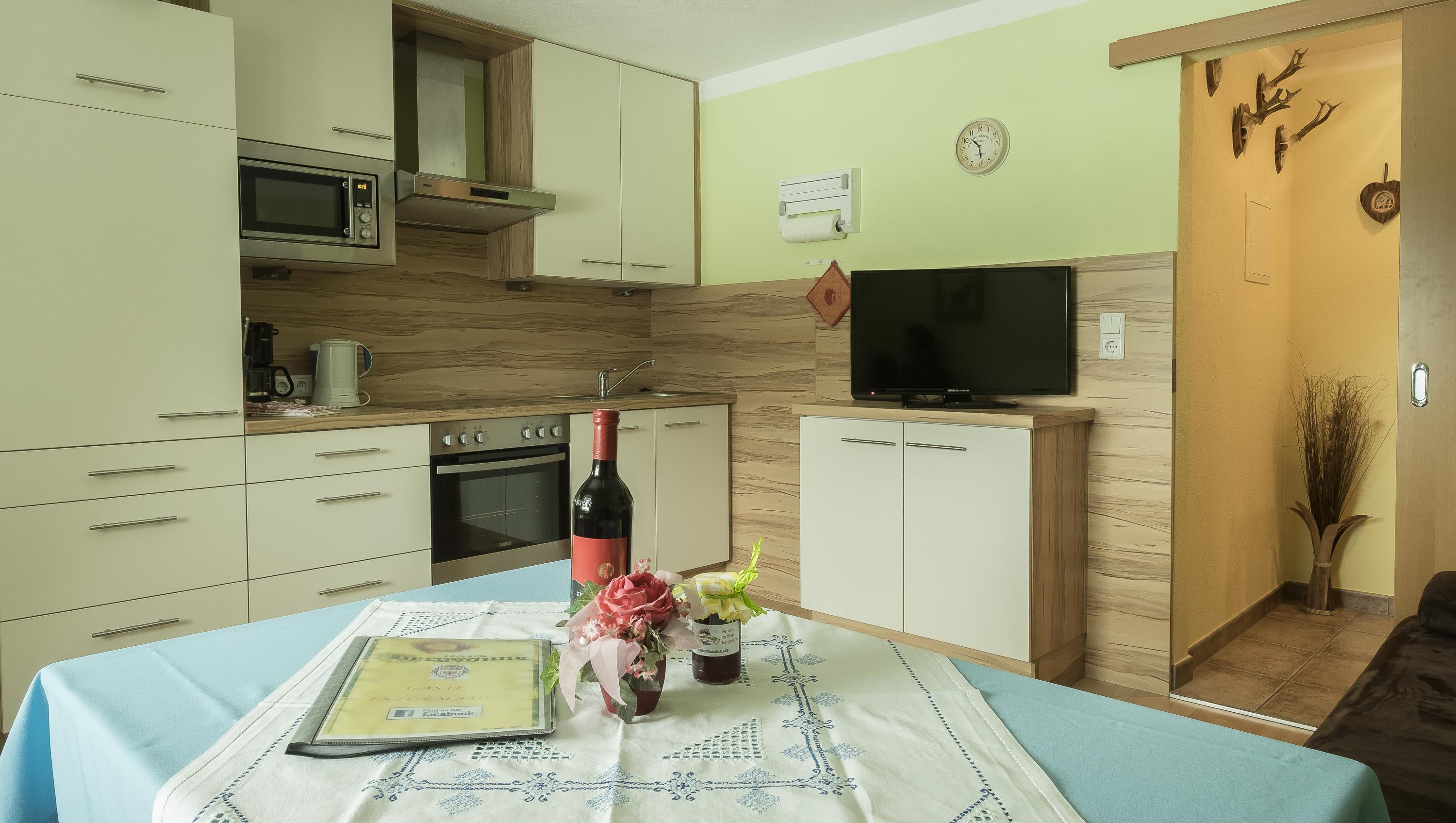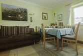 Wohnküche mit Essecke und gemütlichem Sofa und 2 Schlafzimmer.