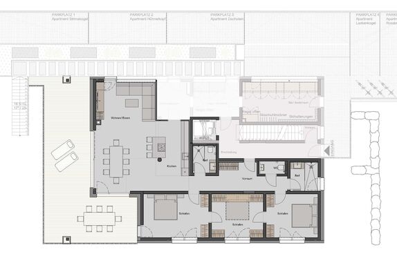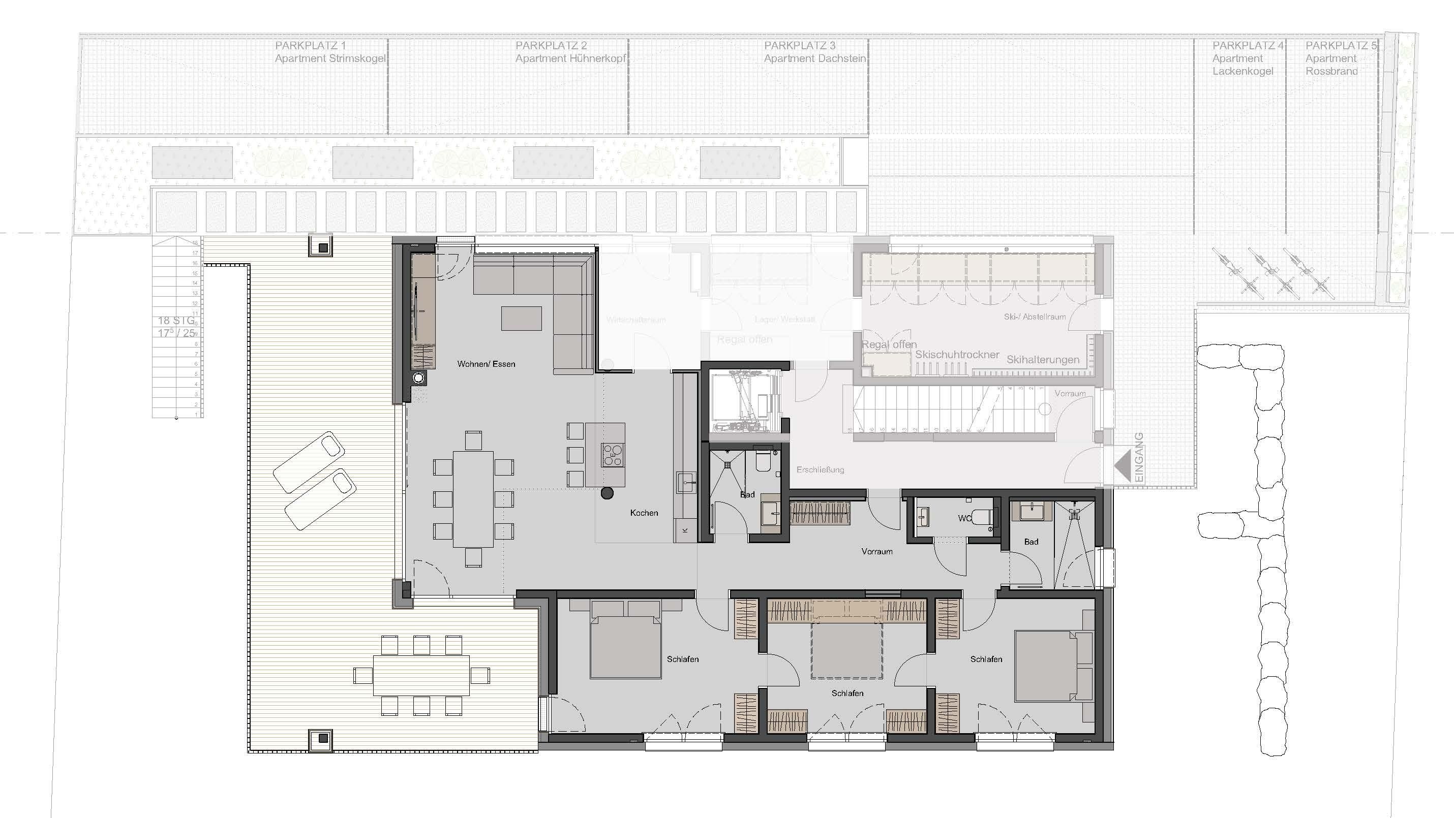 Tanners Paradise liegt im Erdgeschoss und bietet dir auf 160 m2 6 bis 8 Betten in 3 großzügigen Schlafzimmern. Die offene Wohnküche und die riesige Sonnenterrasse lassen keine Wünsche offen.