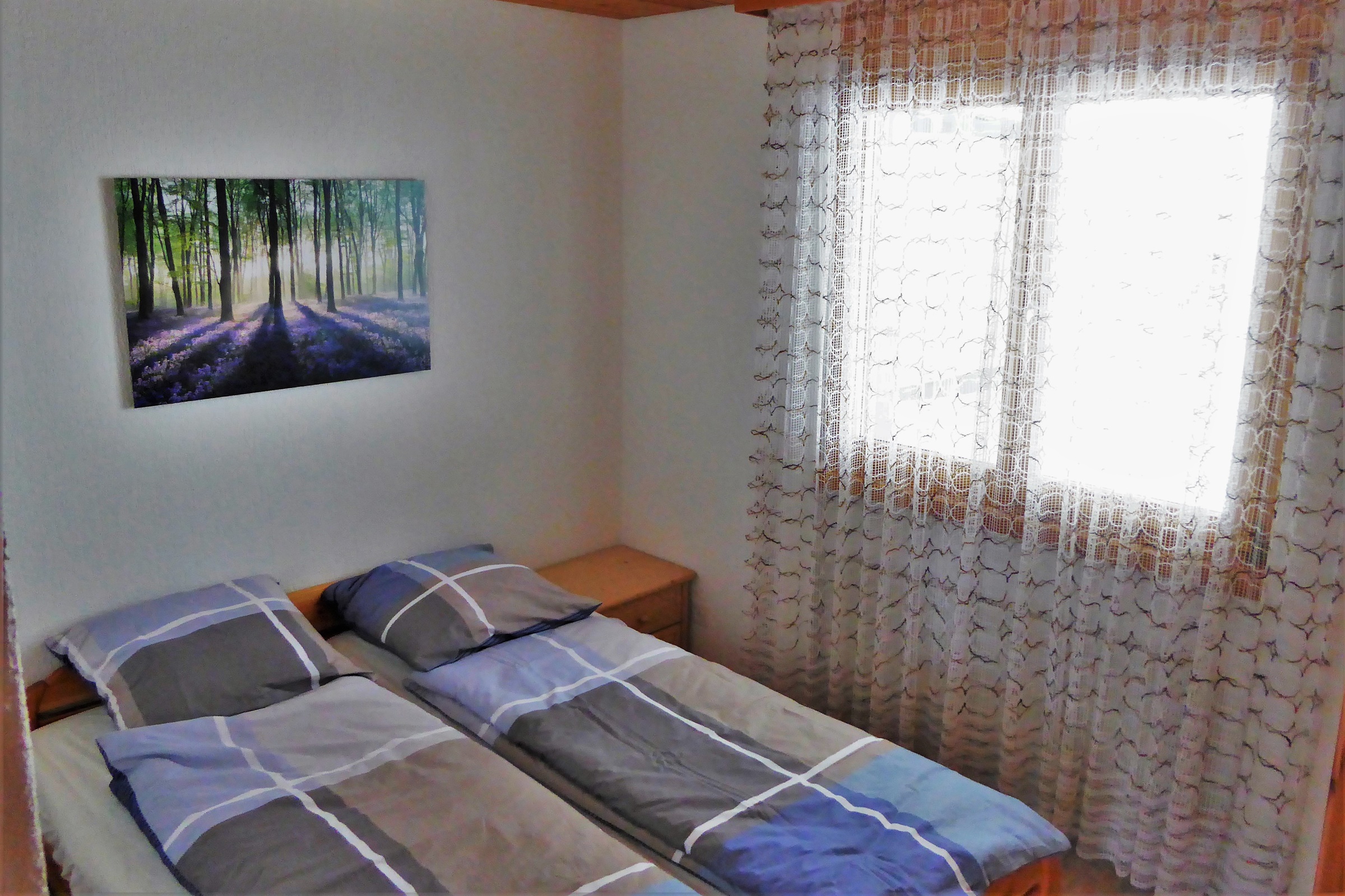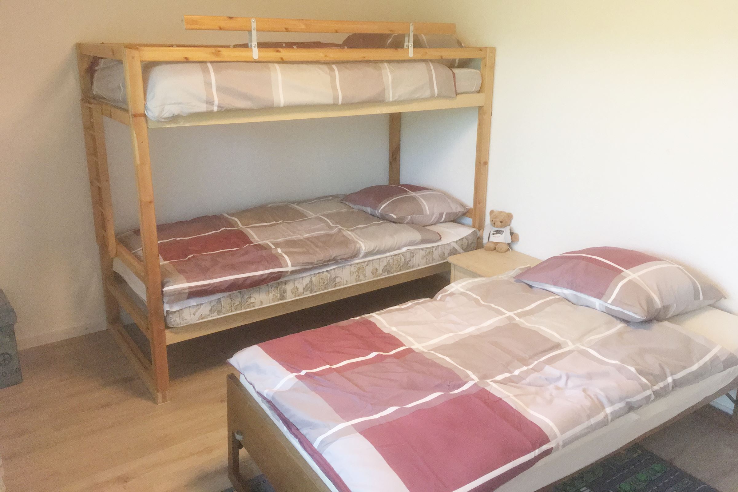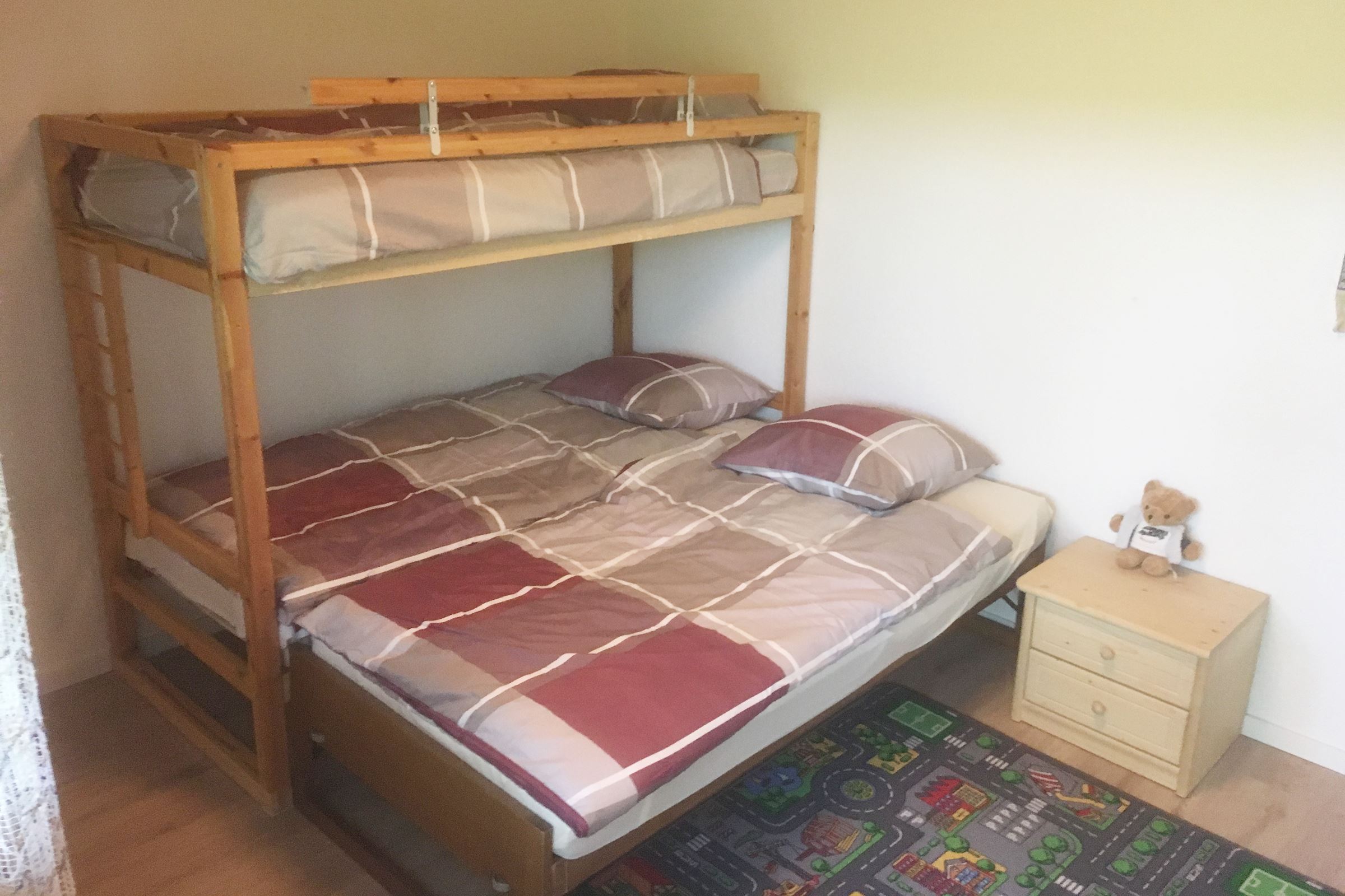 Die Ferienwohnung verfügt über zwei Schlafzimmer, eines mit Doppelbett, eines mit Kajütenbett und Auszugbett