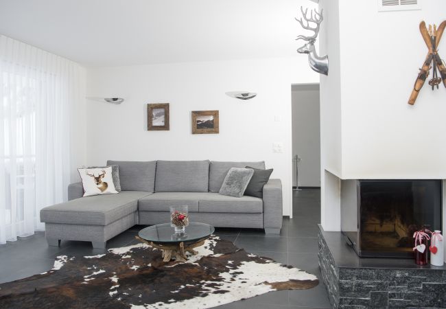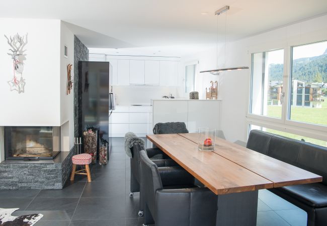 Der lichtdurchflutete Wohnbereich mit offenem Kamin schafft eine warme und einladende Atmosphäre, ideal zum Entspannen nach einem aktiven Tag in den Bergen. Geniessen Sie bei einem Glas Wein den Blick auf die verschneite Bergwelt und fühlen Sie sich rundum zuhause.