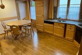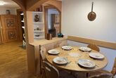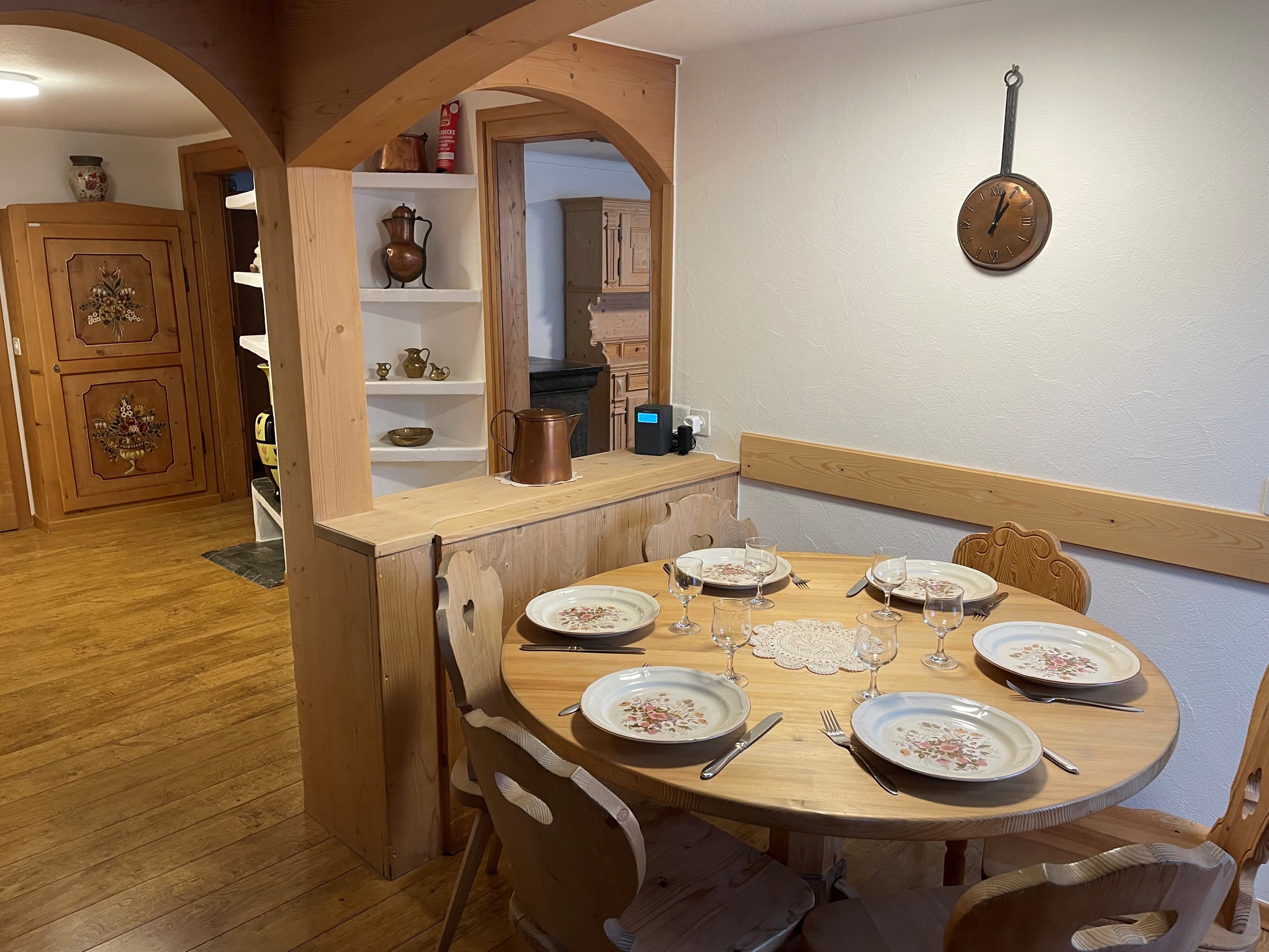 Die Küche ist vollumfänglich ausgestattet und verfügt über einen Kochherd aus Glaskeramik. Ein Backofen, ein Wasserkocher, ein Kühlschrank sowie eine Geschirrspülmaschine sind in der Küche eingerichtet. Ausserdem gibt es einen Radio sowie eine Nespresso-Maschine, die Kapseln werden jedoch nicht zur Verfügung gestellt. Ein Raclette-Ofen sowie ein Fondue-Caquelon sind verfügbar. Die Küchenwäsche ist vorhanden und im Preis inbegriffen. Der Essbereich hat einen runden Tisch mit sechs Stühlen. Ein Babystuhl ist vorhanden. Der Bodenbelag ist aus Laminat. Gartensitzplatz