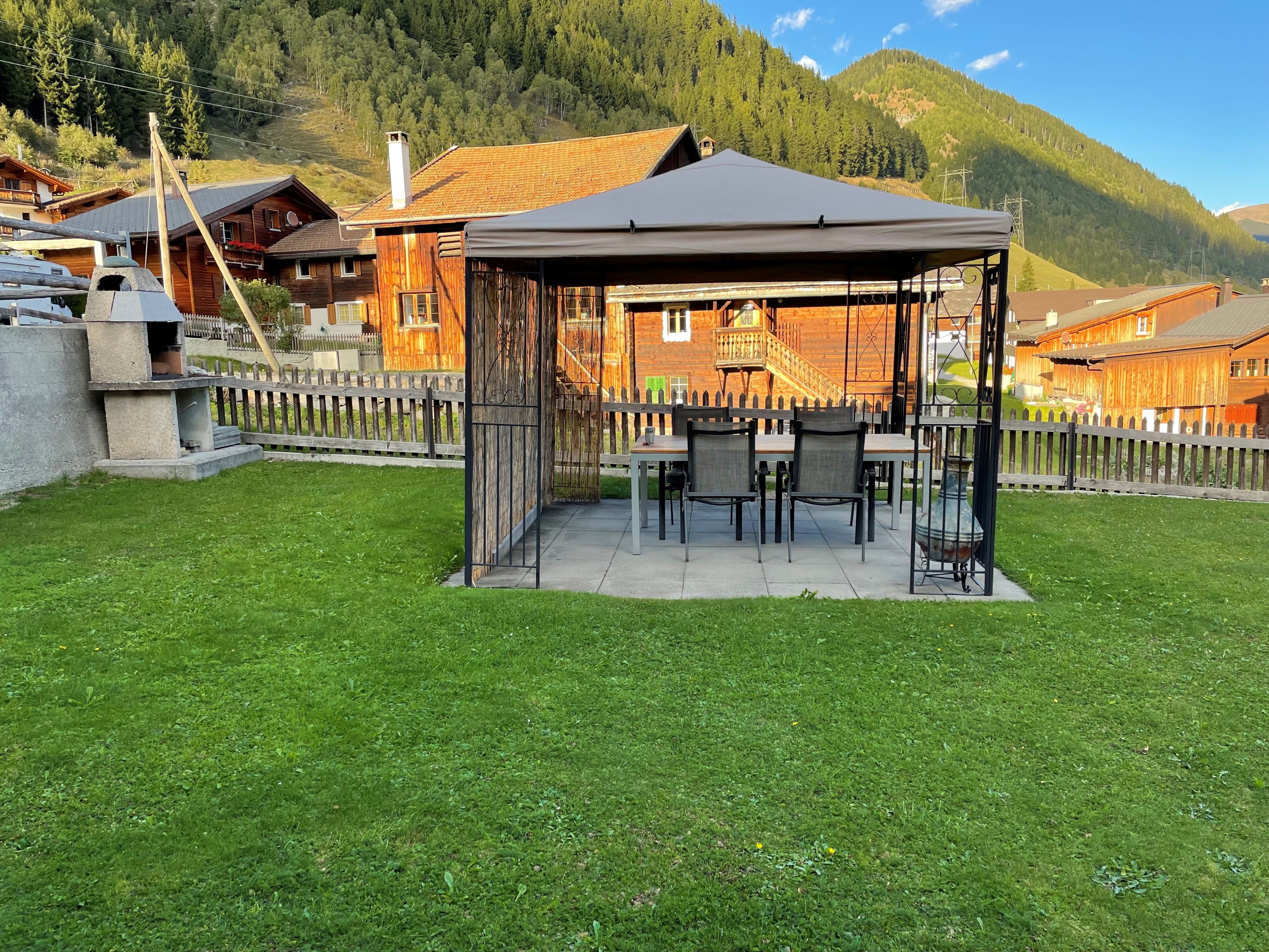 Im Sommer kann in Absprache mit dem Vermieter der Gartensitzplatz mit Holzgrill benutzt werden. Er besteht aus einem Pavillon mit einem Tisch und sechs Stühlen.