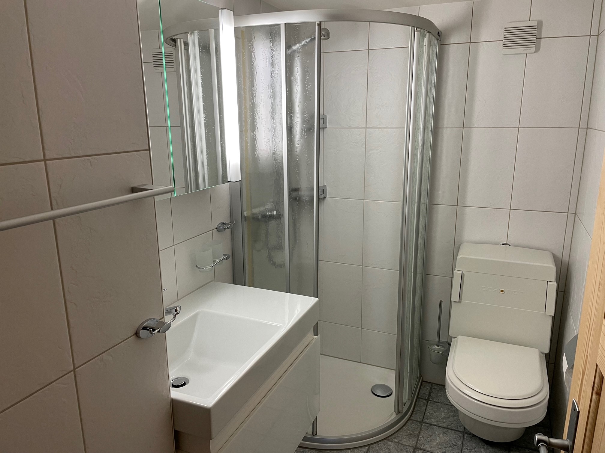 Das Badezimmer ist mit einem Waschbecken, einer Toilette (Closomat) sowie einer Dusche ausgestattet. Hand- und Badetücher werden zur Verfügung gestellt. Wohnzimmer