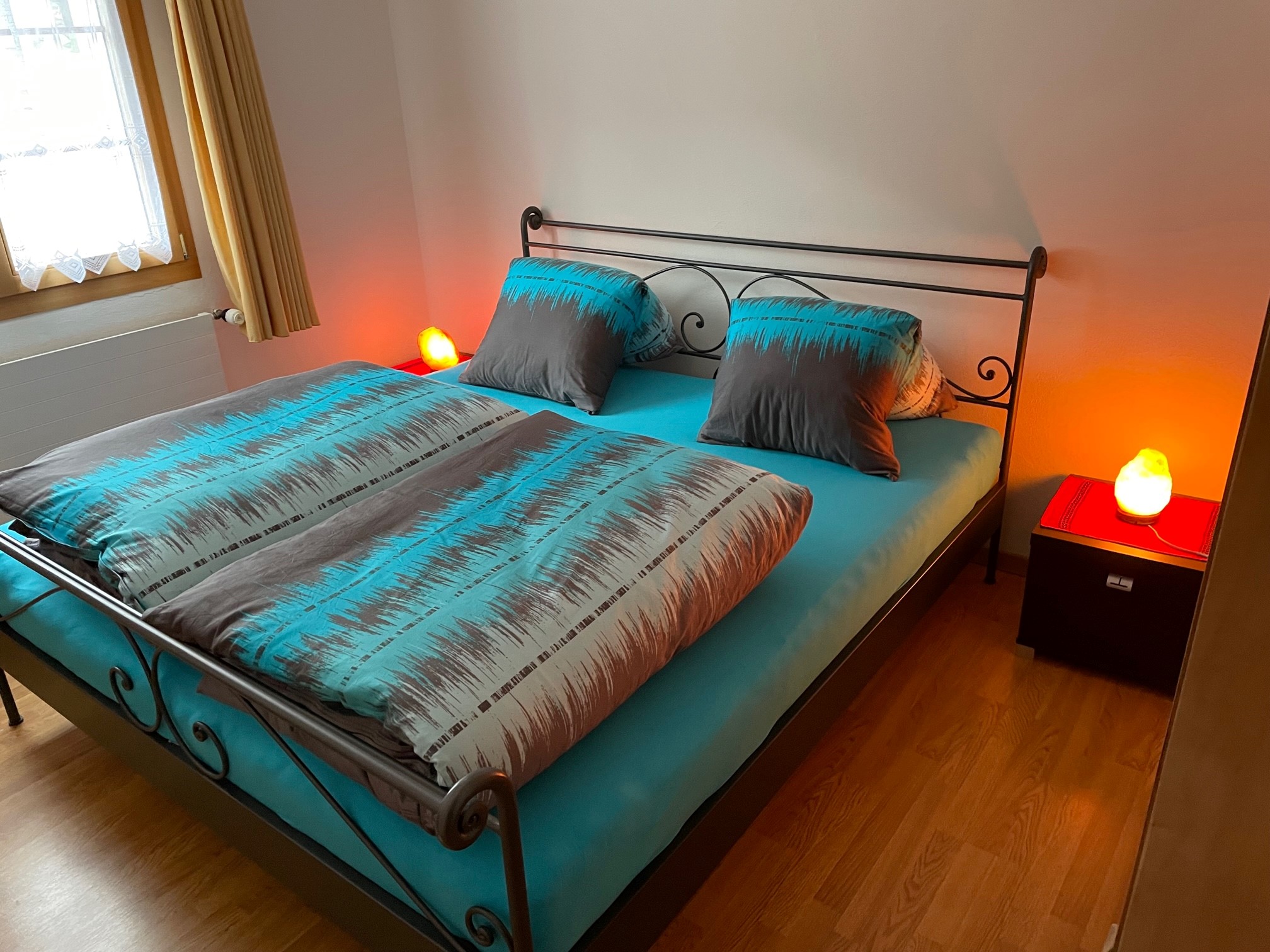 Zwei Schlafzimmer verfügen jeweils über ein Doppelbett. Eines dieser Schlafzimmer besitzt einen Balkon. Das kleinere dritte Schlafzimmer ist mit einem Etagenbett für Kinder oder Erwachsene ausgestattet. Ein Babybett ist vorhanden und die Schlafzimmer werden jeweils von der Vermieterin frisch bezogen. Badezimmer
