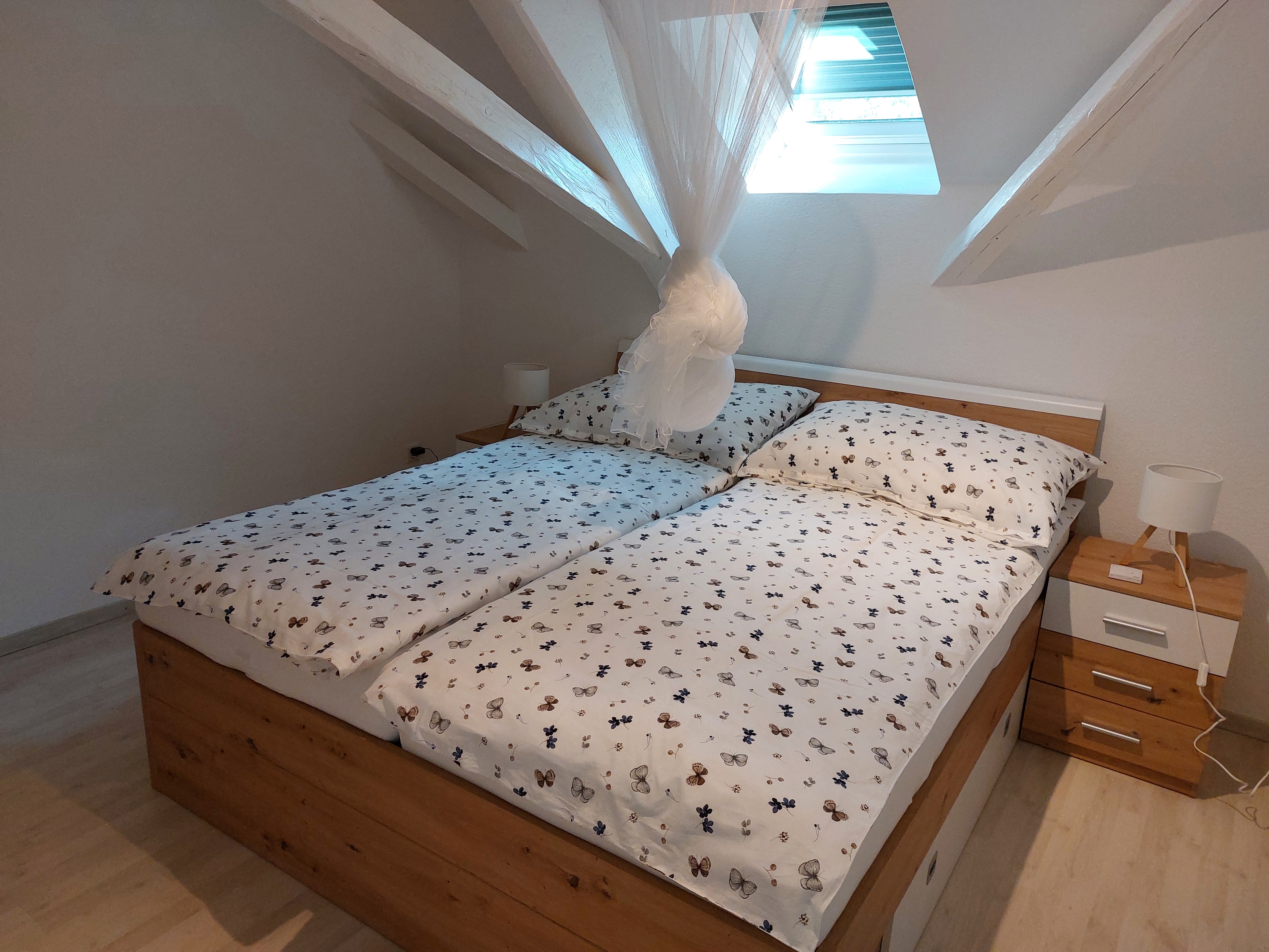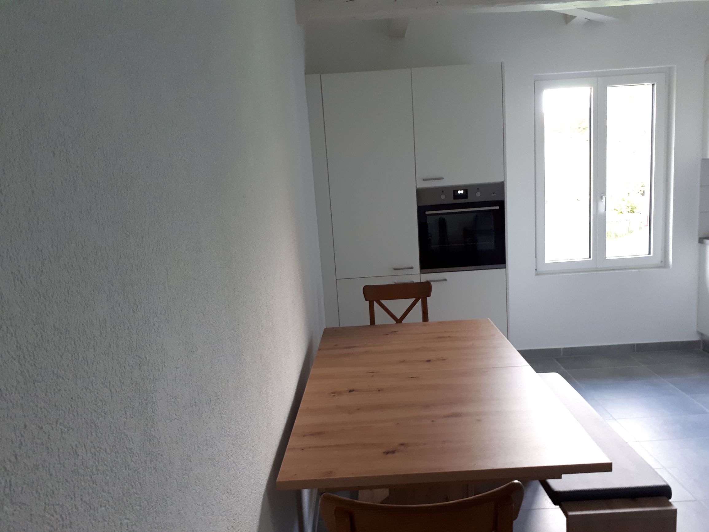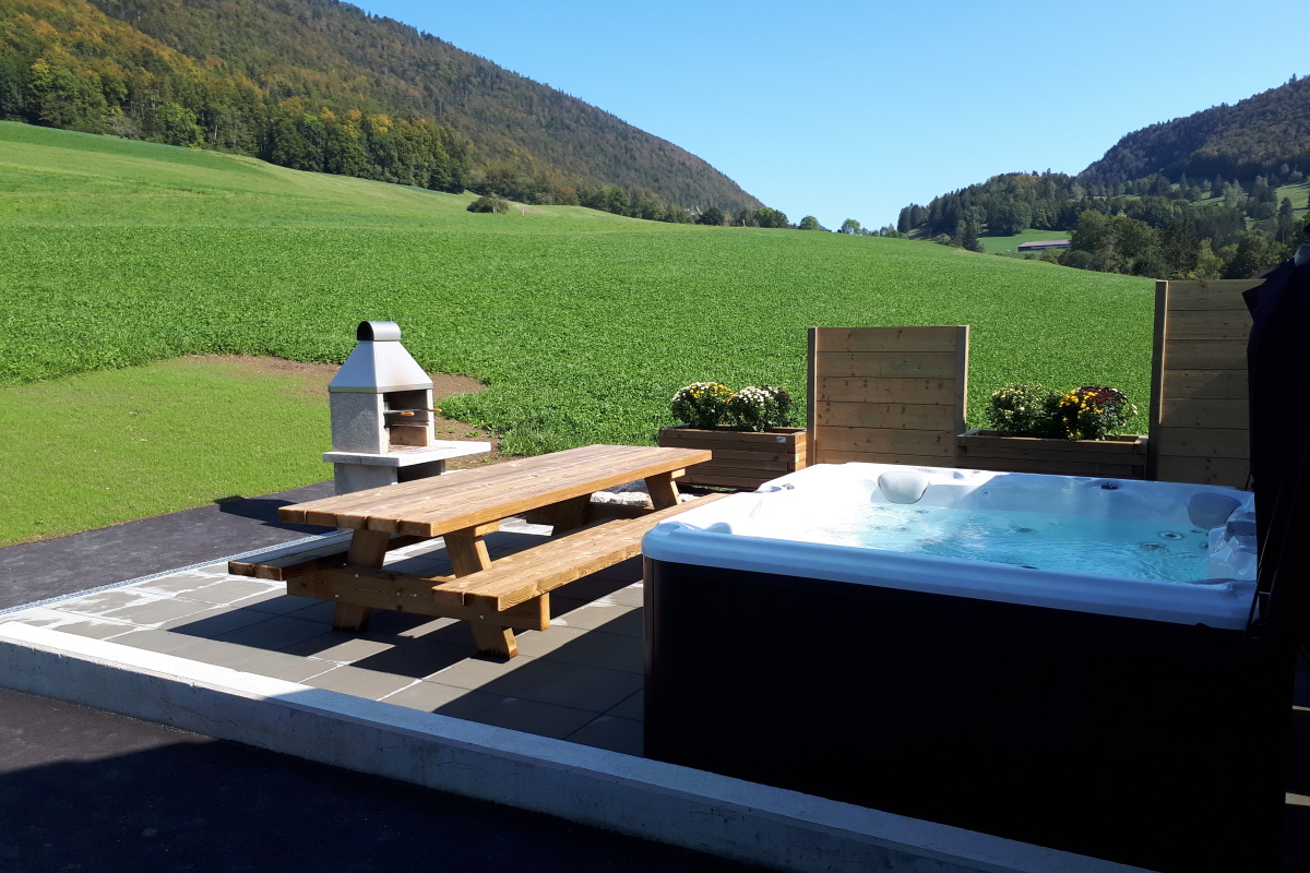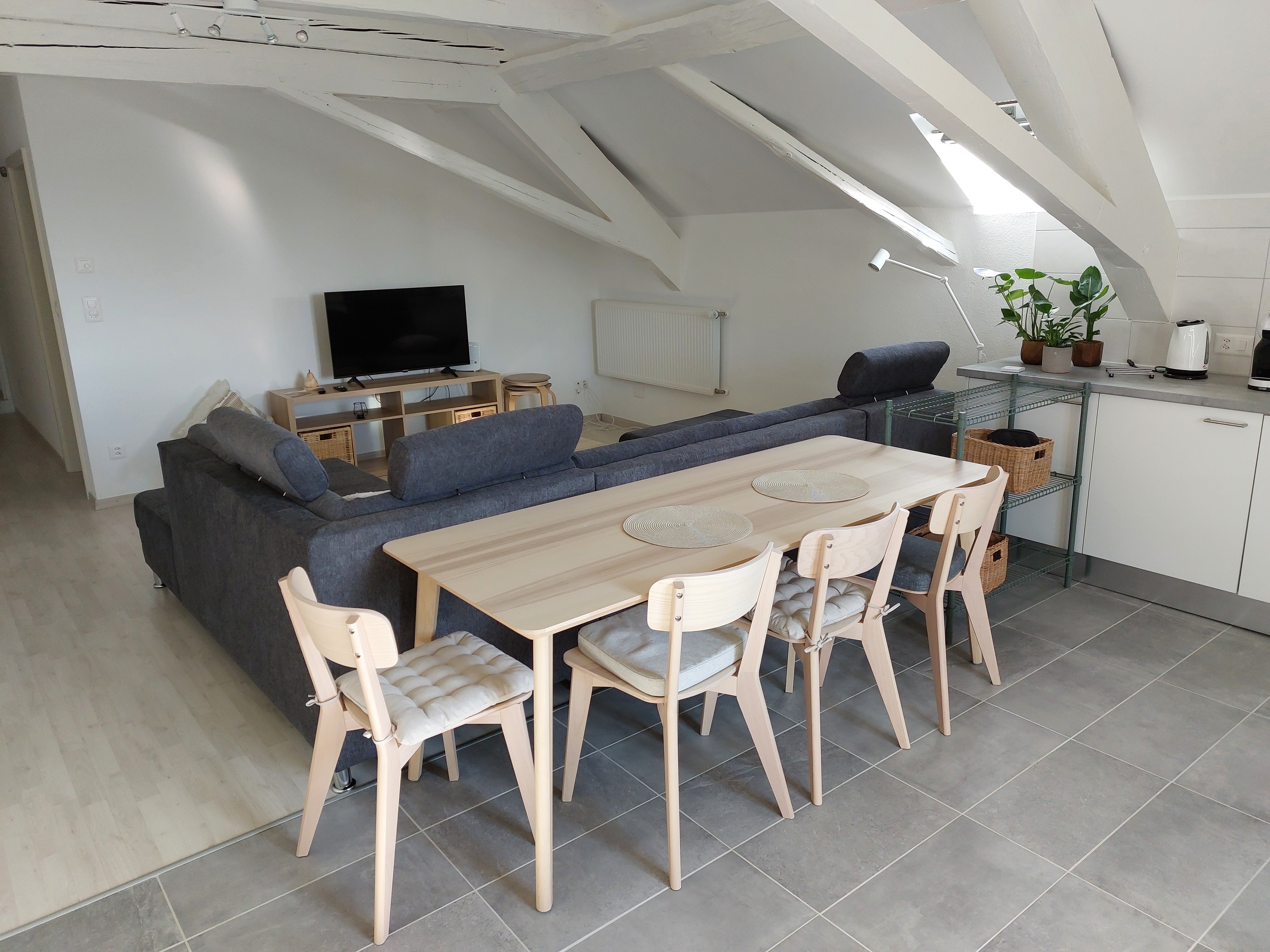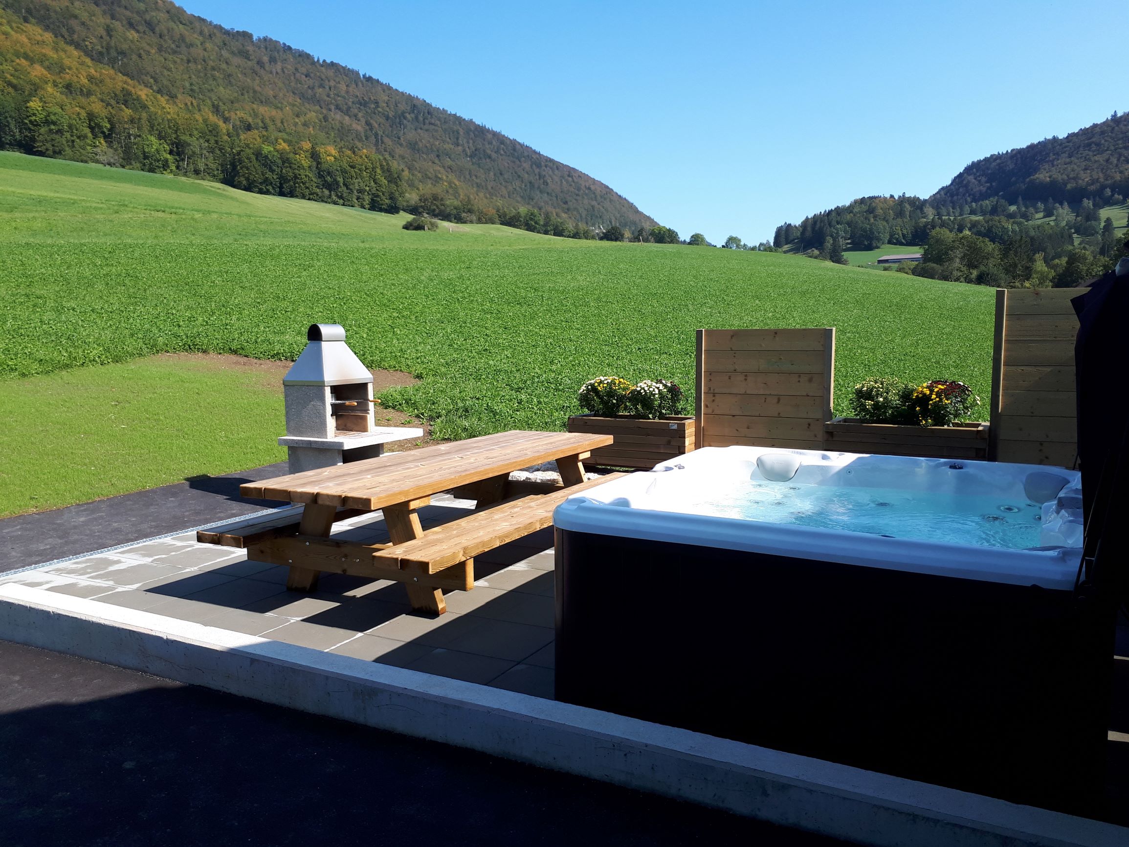Neues 2,5-Zimmer-Apartment (70m²) im Dachgeschoss eines renovierten Bauernhauses, am Dorfrand in ruhiger Umgebung und mitten in der Natur. Es verfügt über ein großes Zimmer mit Wohnzimmer und Schlafsofa sowie eine moderne Küche, ein Schlafzimmer für 2 Personen und ein Badezimmer mit Badewanne und WC. Die große Terrasse ist mit Gartenmöbeln, Grill und Whirlpool ausgestattet und bietet einen atemberaubenden Blick auf den Mont-Raimeux.