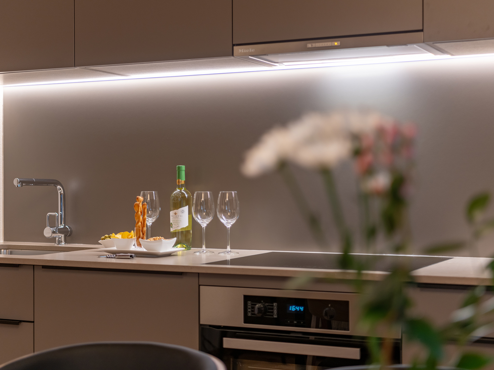 Spülmaschine, Induktions-Herd mit 4 Platten und Dampfabzug, Backofen, Kühlschrank mit Gefrierfach - alles Miele-Geräte -, Kaffee-Kapselmaschine, Toaster, Wasserkocher, Geschirr/Gläser/Küchenzubehör für 4 Personen.