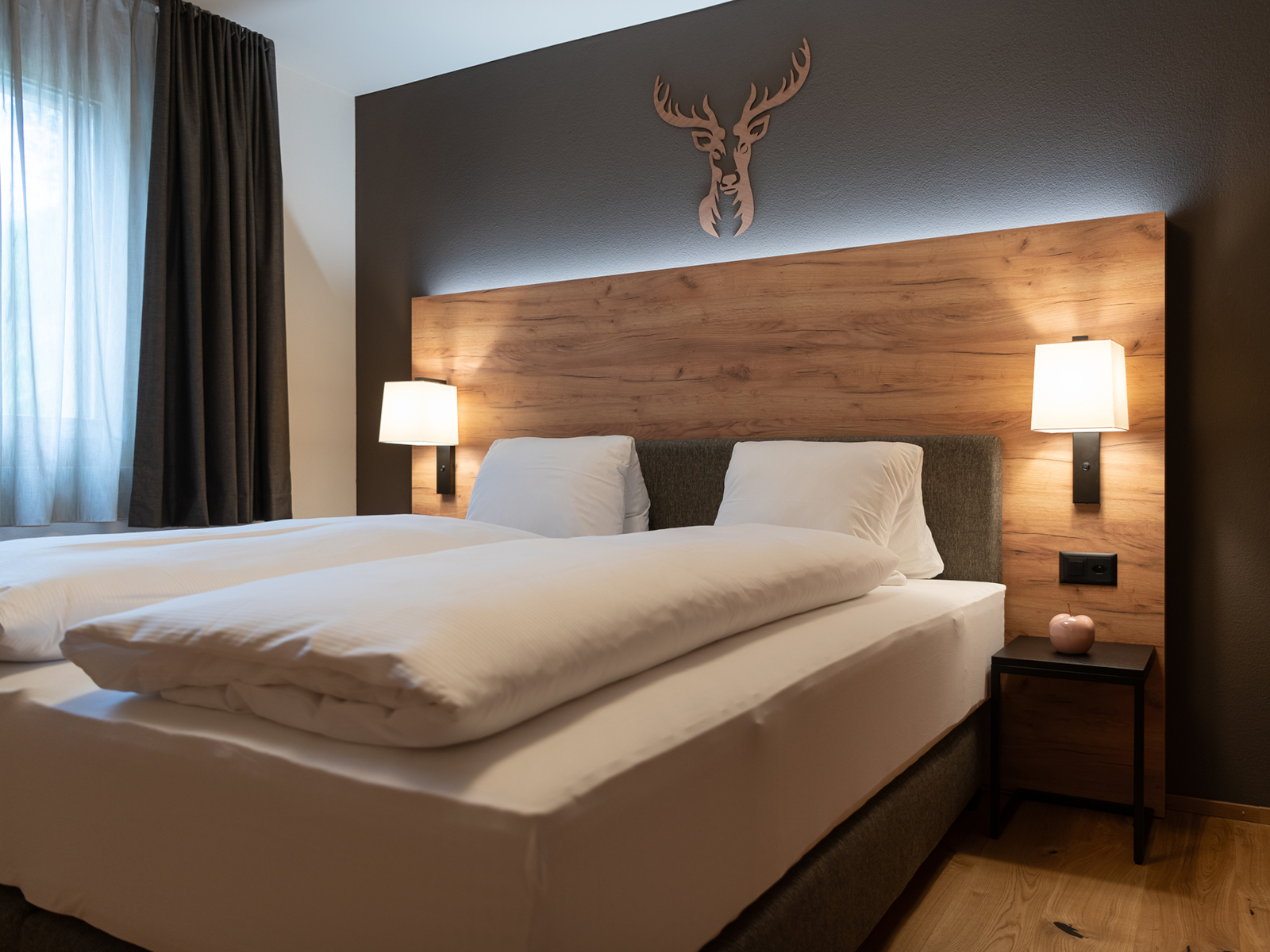 1 Schlafzimmer mit einem Boxspring - Doppelbett (90x200cm, 2 Matratzen - jede Matratze ist drehbar mit 2 Härtegraden soft/hard, hochwertige Aerelle Kissen und Duvets) und grossem 50 Flatscreen-TV, ebenfalls mit Streaming-Möglichkeit per QR-Code
