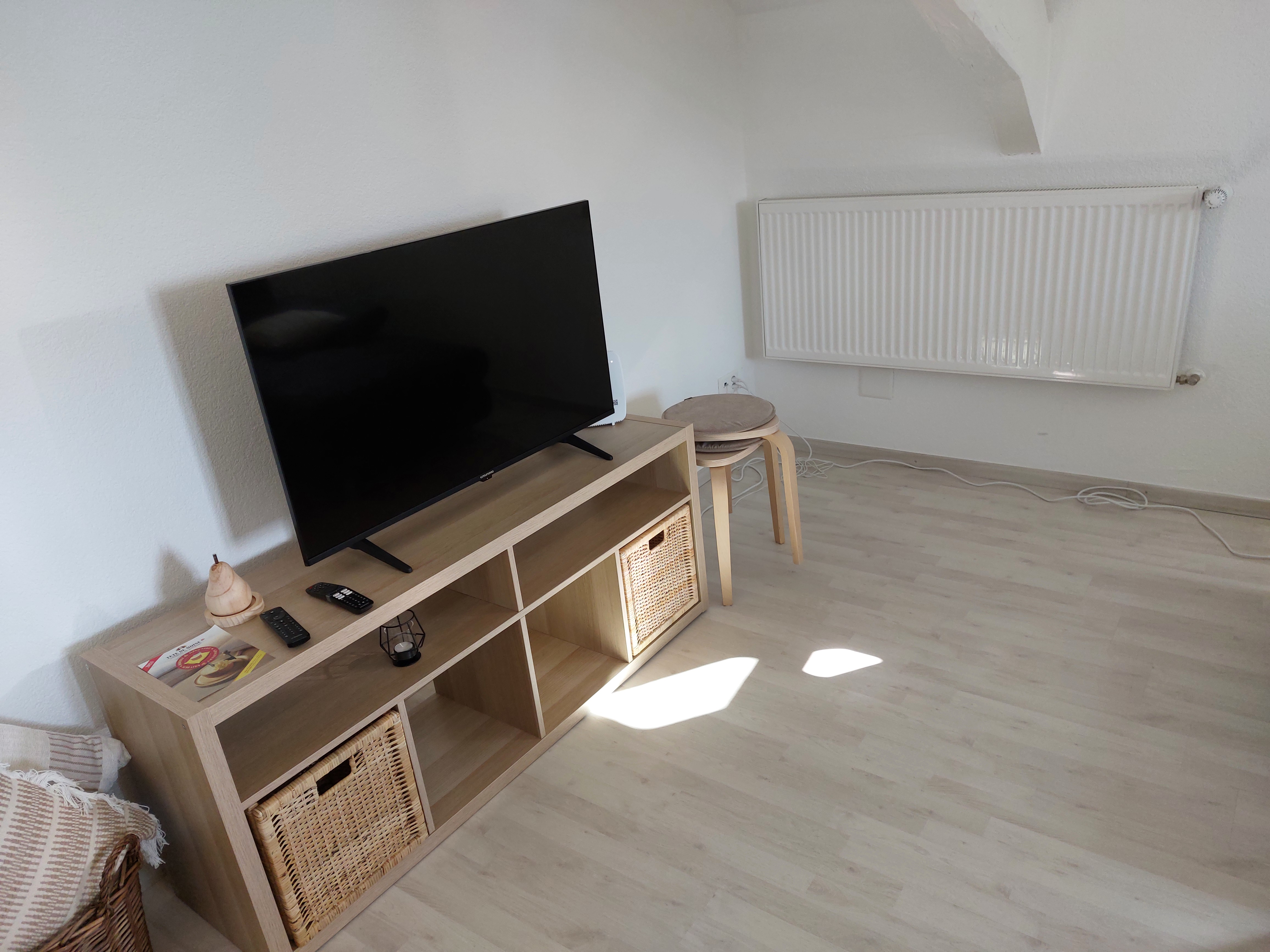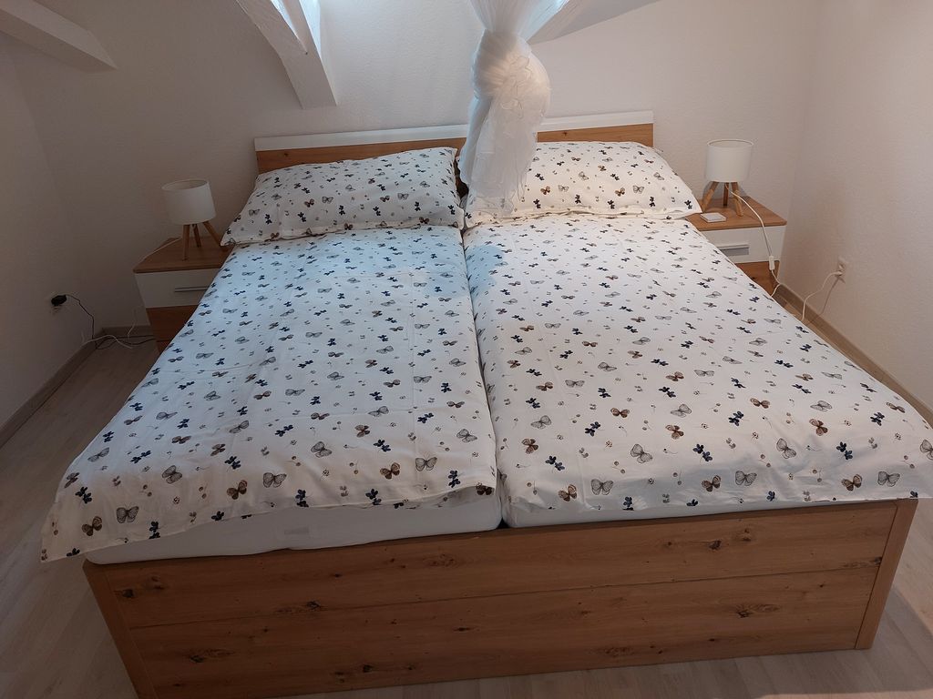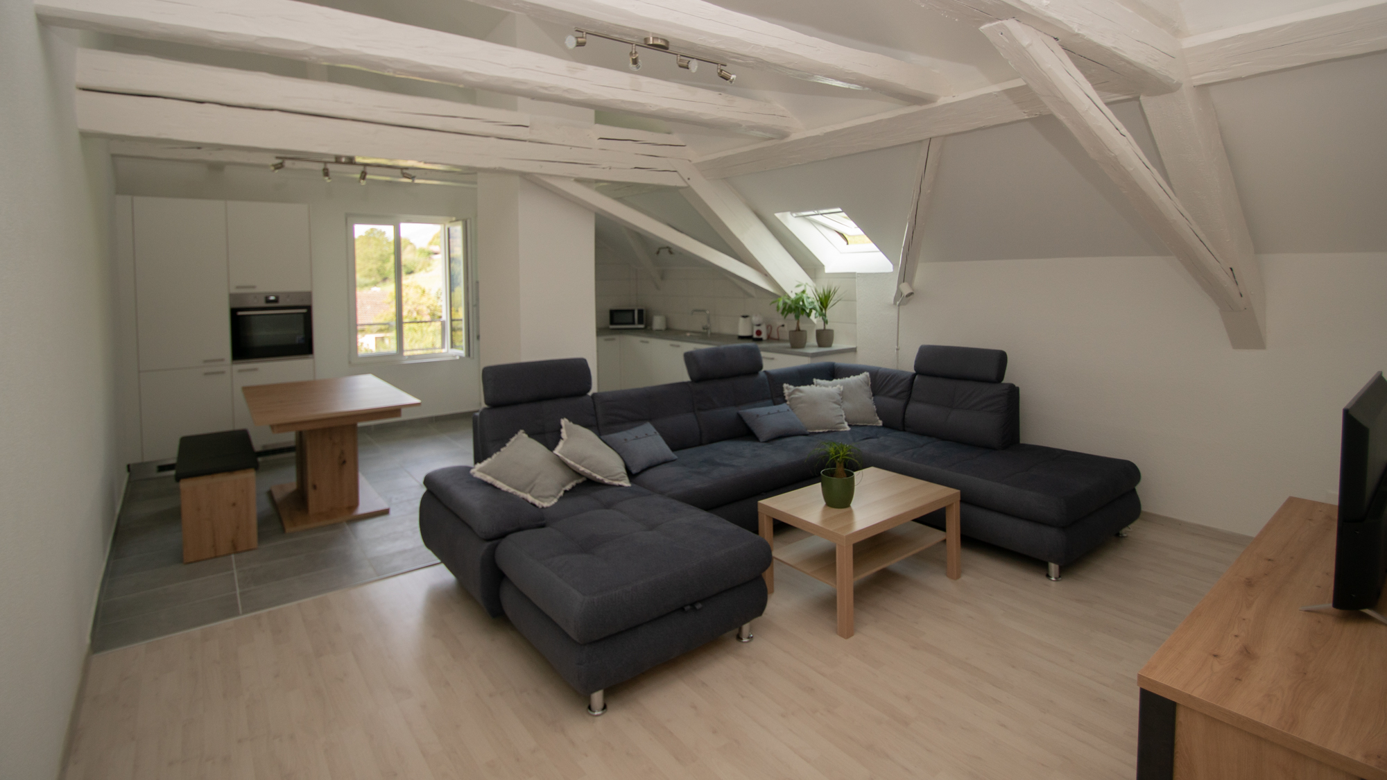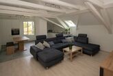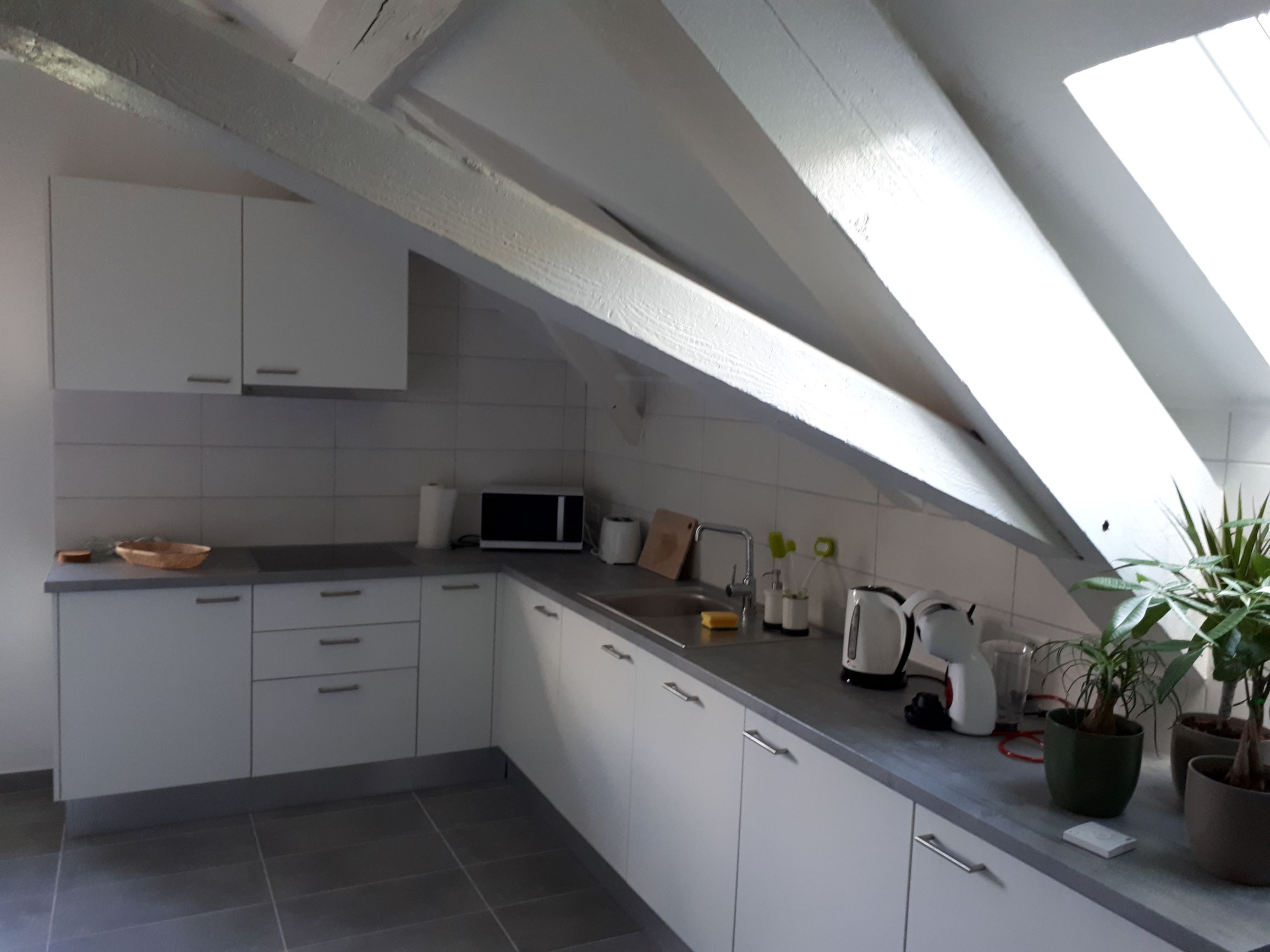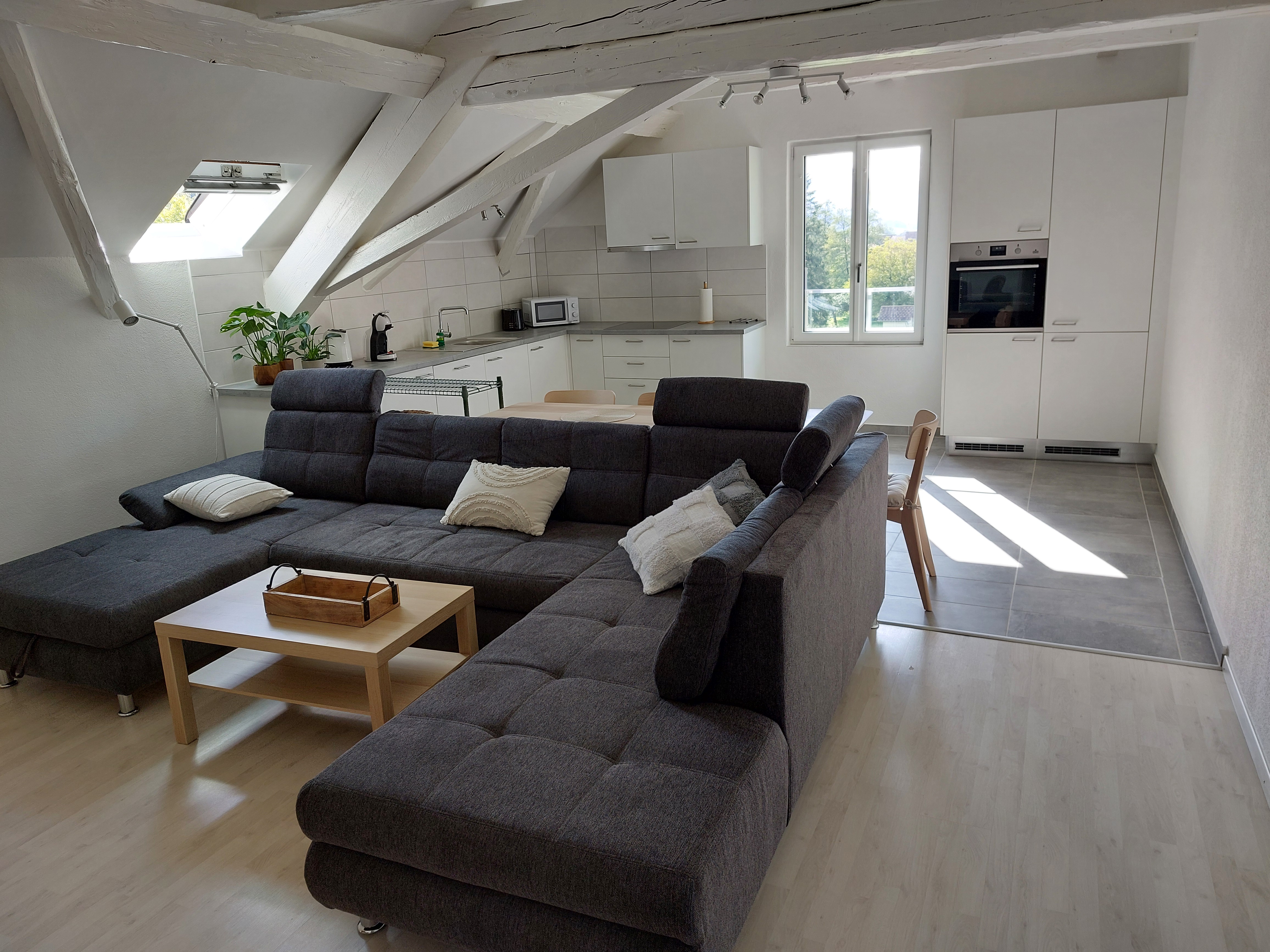 Neues 2,5-Zimmer-Apartment (70m²) im Dachgeschoss eines renovierten Bauernhauses, am Dorfrand in ruhiger Umgebung und mitten in der Natur. Es verfügt über ein großes Zimmer mit Wohnzimmer und Schlafsofa sowie eine moderne Küche. Das Apartment hat ein Schlafzimmer für 2 Personen (Bettwäsche inklusive) und ein geräumiges Badezimmer mit Badewanne und WC (Handtücher vorhanden). Eine große private Terrasse mit Whirlpool, Holztisch, Bank, Feuerschale und Grillutensilien steht zur Verfügung. Genießen Sie von der Terrasse einen herrlichen Blick auf die umliegende Natur. Ein Tischfußball steht im Flur zur Verfügung.
