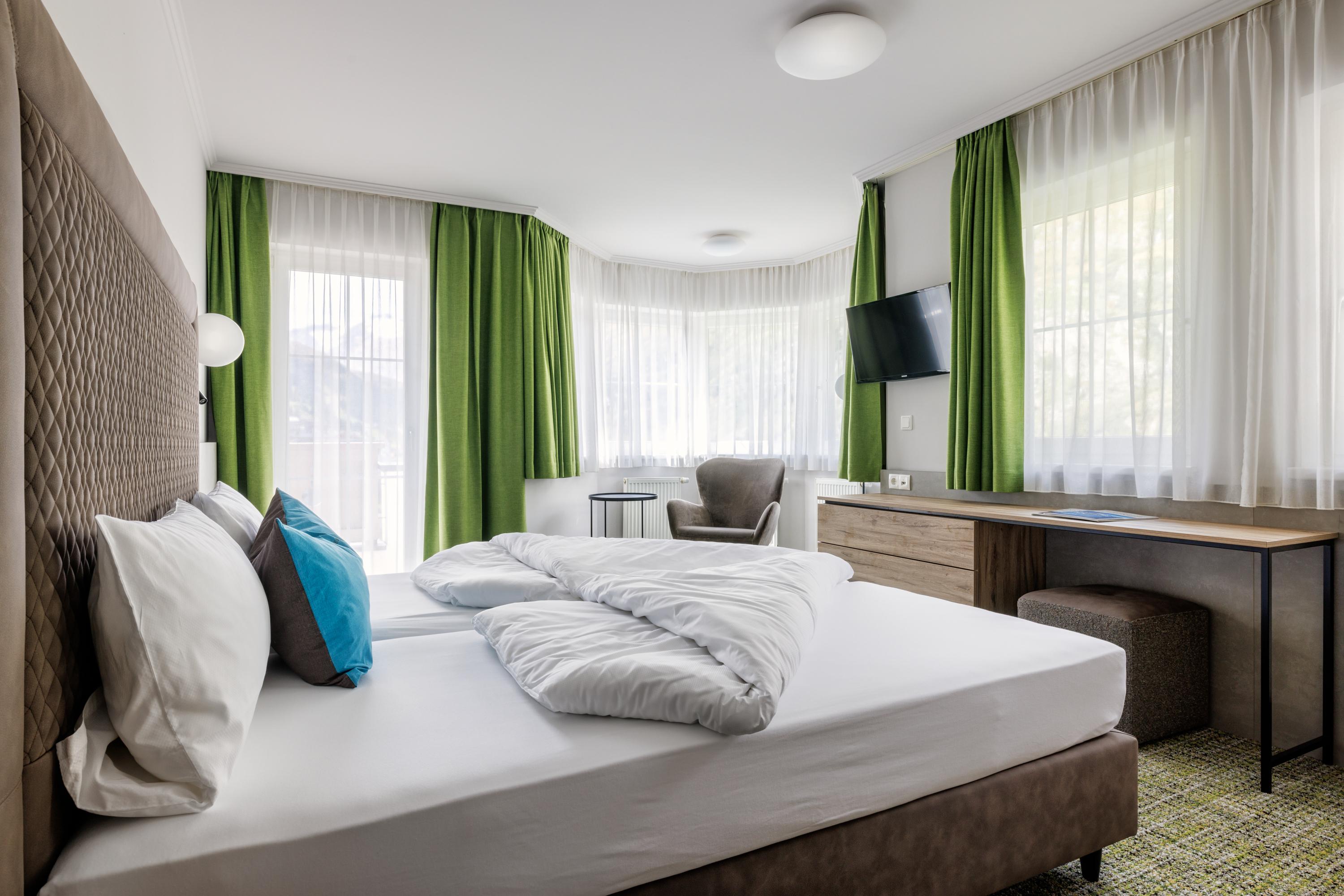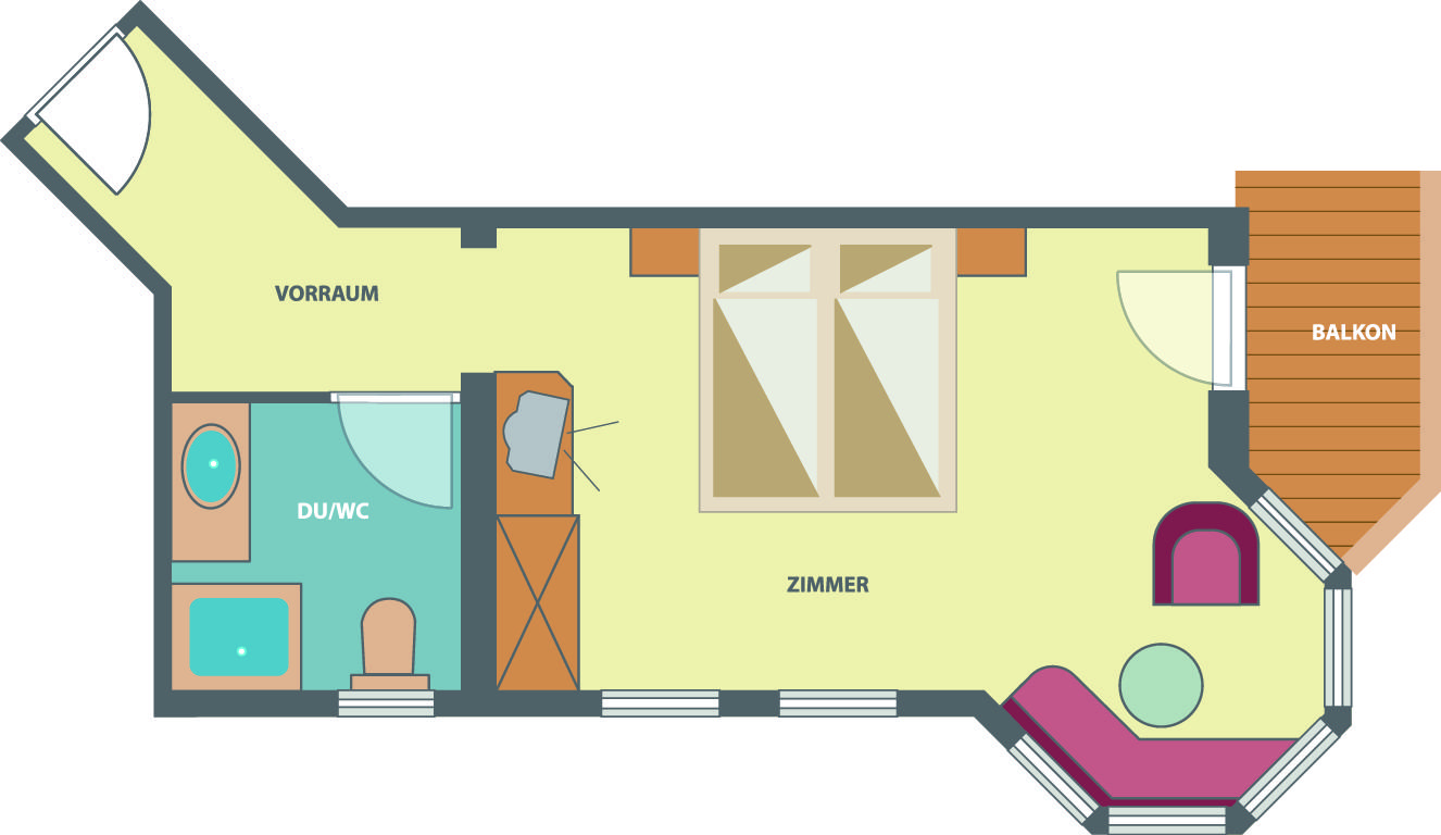 Ausstattung: Erker mit fantastischer Aussicht, Dusche/WC oder Badewanne/WC, Fön, Kosmetikspiegel, Telefon, Kabel-TV, Safe, Schreibtisch, Einzelcouch, Garderobe, Gemeinschaftsbalkon nach Süden