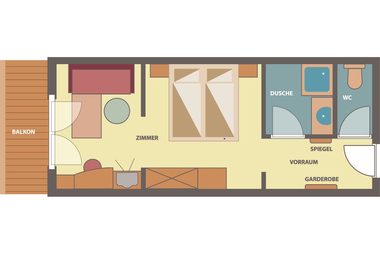 Ausstattung: Dusche oder Badewanne, getrenntes WC, Fön, Kosmetikspiegel, Telefon, Kabel-TV, Safe, Schreibtisch, Sitzcouch, Garderobe, Abgetrennter Balkon nach Westen.