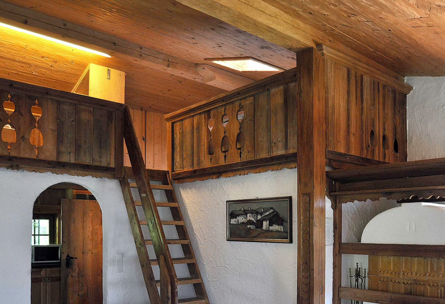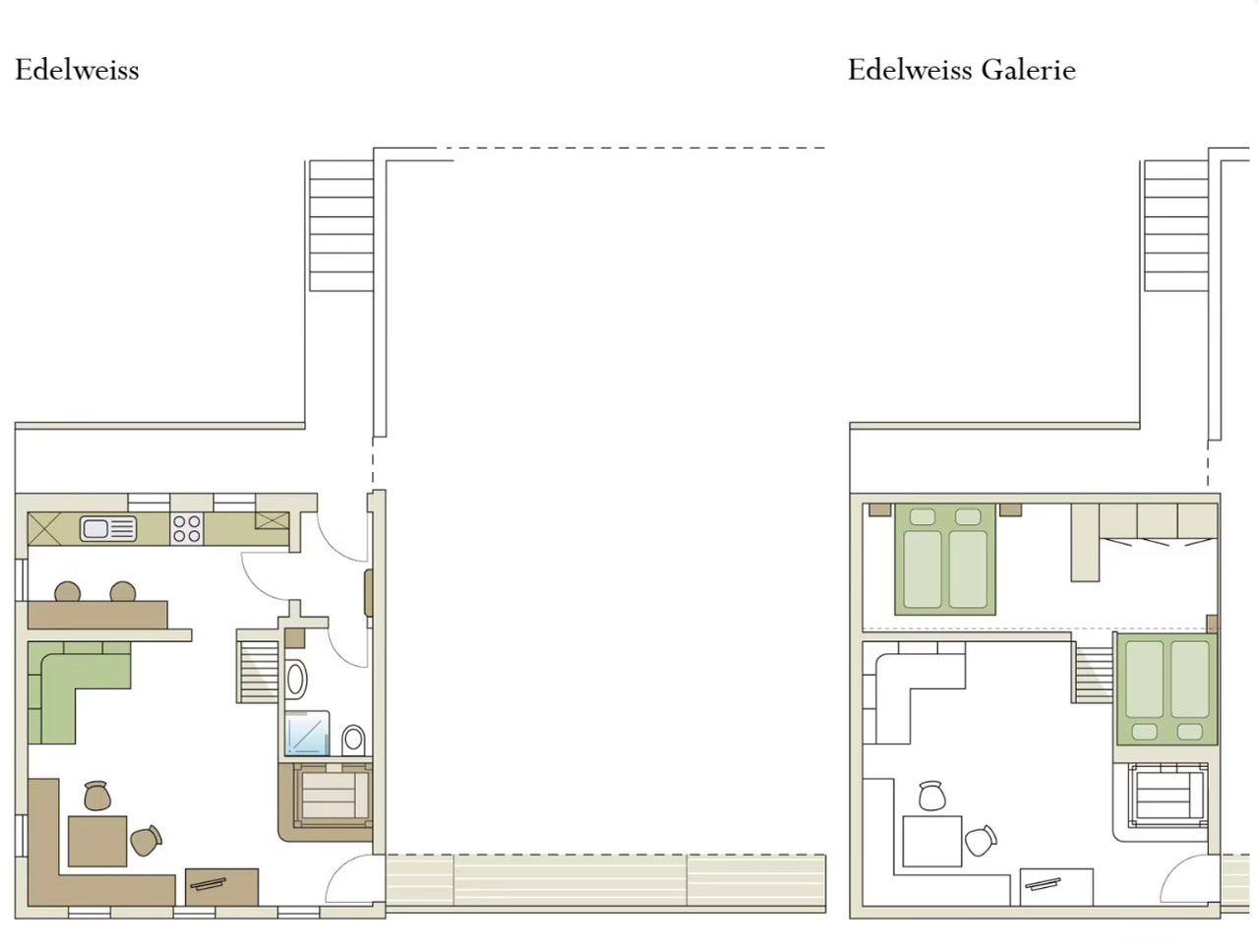 Die gemütliche ca. 55 m² große Maisonette-Wohnung »Edelweiß« liegt im oberen Seitentrakt des Hauses und bietet Platz für 2 bis 4 Personen. Im unteren Teil der Wohnung befinden sich die Küche, das Badezimmer, eine liebevoll eingerichtete Bauernstube mit Kachelofen und gemütlichem Ecksofa. Auf der Galerie gibt es zwei Doppelbetten, welche man über eine Leiter erreicht. Wohn- und Schlafbereich bilden somit zusammen einen schönen großen Raum mit direktem Zugang zu einem eigenen sonnigen Balkon, von dem Sie einen herrlichen Panoramablick genießen können. Selbst Haustiere dürfen sich hier wohlfühlen.