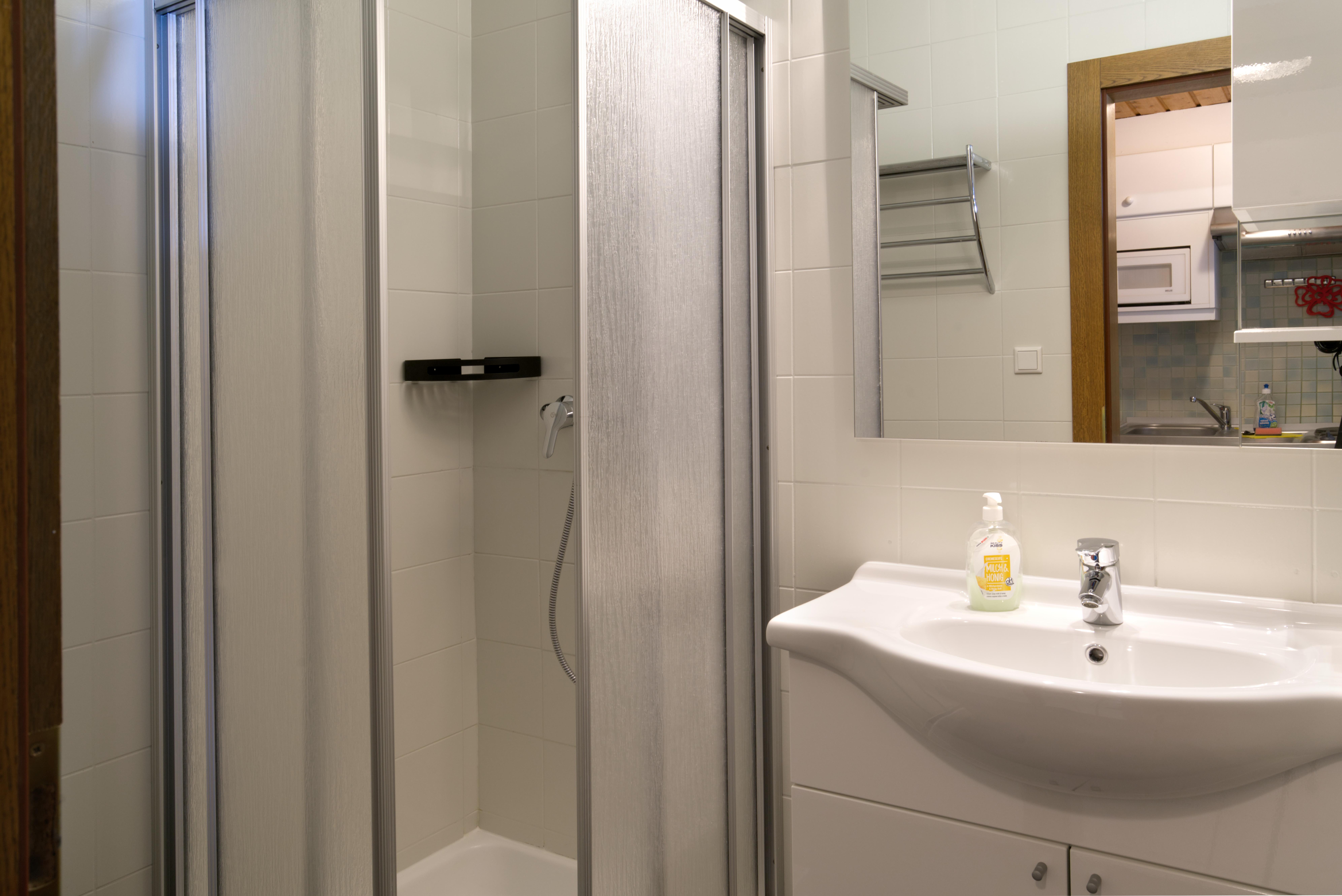 Wohnraum und Doppelbett optisch abgetrennt, Dusche und sep. WC, Küchenzeile mit Mikrowelle, Kaffeemaschine und Toaster, Gefrierfach-Kühlschrank, Bettwäsche, Handtücher
