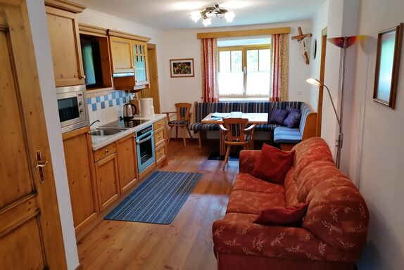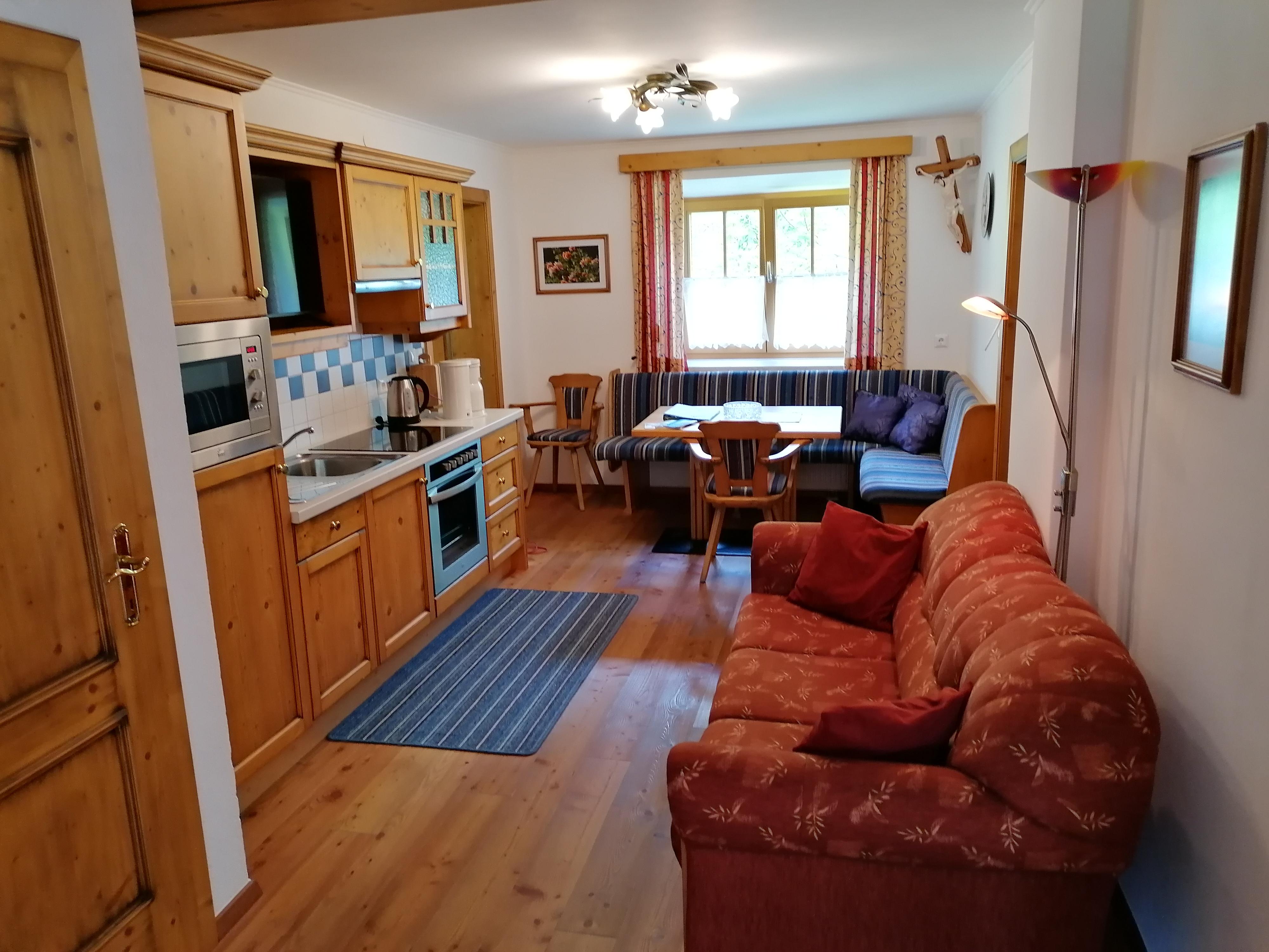 50 m2 Wohnfläche, ebenerdig gelegen laden ein zum Wohlfühlen. Die Ferienwohnung bietet Platz für 2 bis 4 Personen und ist ausgestattet mit Fichtenholzmöbeln und Holzböden, gemütliche Wohnküche mit Kühlschrank, Mikrowelle, Kaffeemaschine, Wasserkocher, E-Herd mit Backrohr, Geschirrspüler, Flachbildschirm mit SAT-TV, Radio, gratis W-LAN, 2 getrennte Doppelbettzimmer, Badezimmer mit Dusche und WC, Fön, eigener Raum mit Waschmaschine, Terrasse mit Sitzgelegenheit und direktem Zugang zu unserer Ruhe Oase mit Hängeliege und Liegestühlen zum Entspannen.
