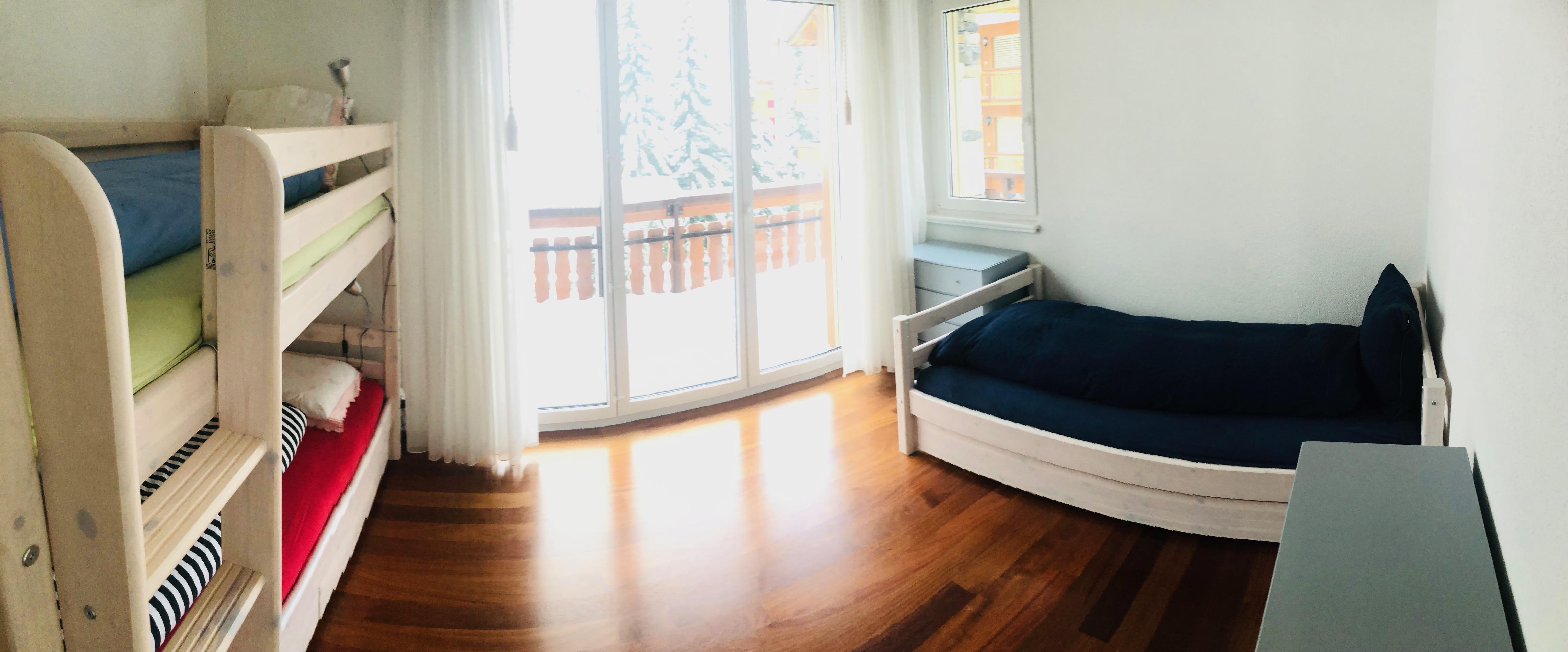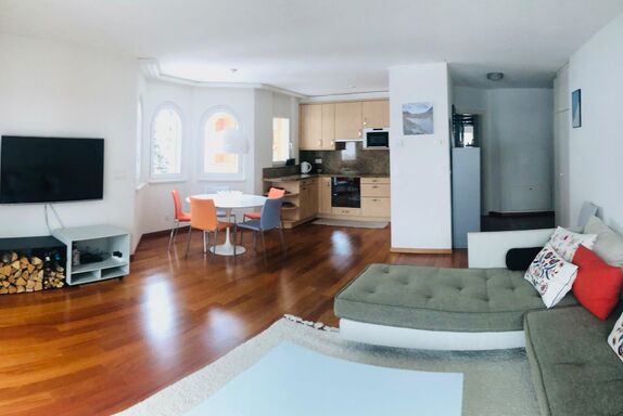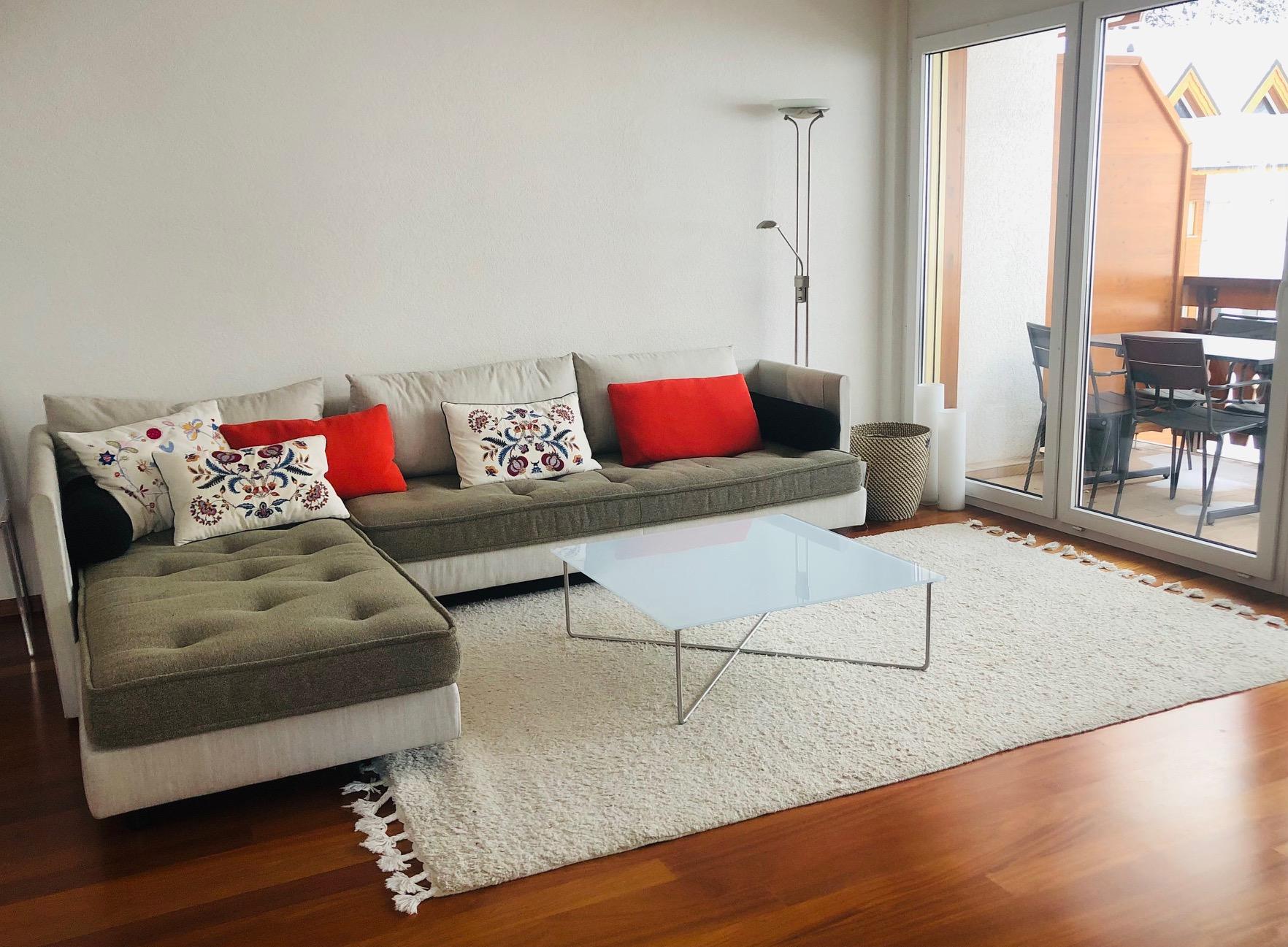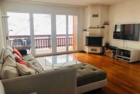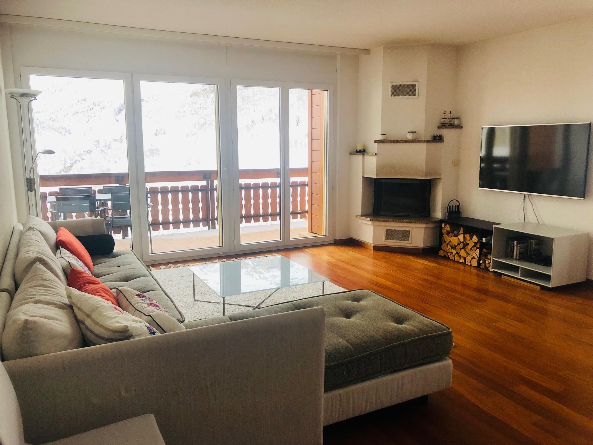 Moderne 3-Zimmerwohnung im 3. Stock: offene Küche mit Geschirrspüler und Mikrowelle, Wohnzimmer mit Cheminée, TV, Radio/DVD, gratis WiFi, 1 Doppelschlafzimmer, 1 Schlafzimmer mit 3 Betten (1 Einzelbett + 1 Etagenbett), 2 x Dusche/WC plus 1 x separates WC, grosser Südbalkon mit Panoramasicht, ruhige Lage, Lift, Ski- & Veloraum, Kinderspielplatz. Nähe: Torrentbahnen, Thermalbäder, Bushaltestelle, Dorfzentrum. Garage zu mieten im Haus. Nichtraucherwohnung. Keine Haustiere erlaubt!