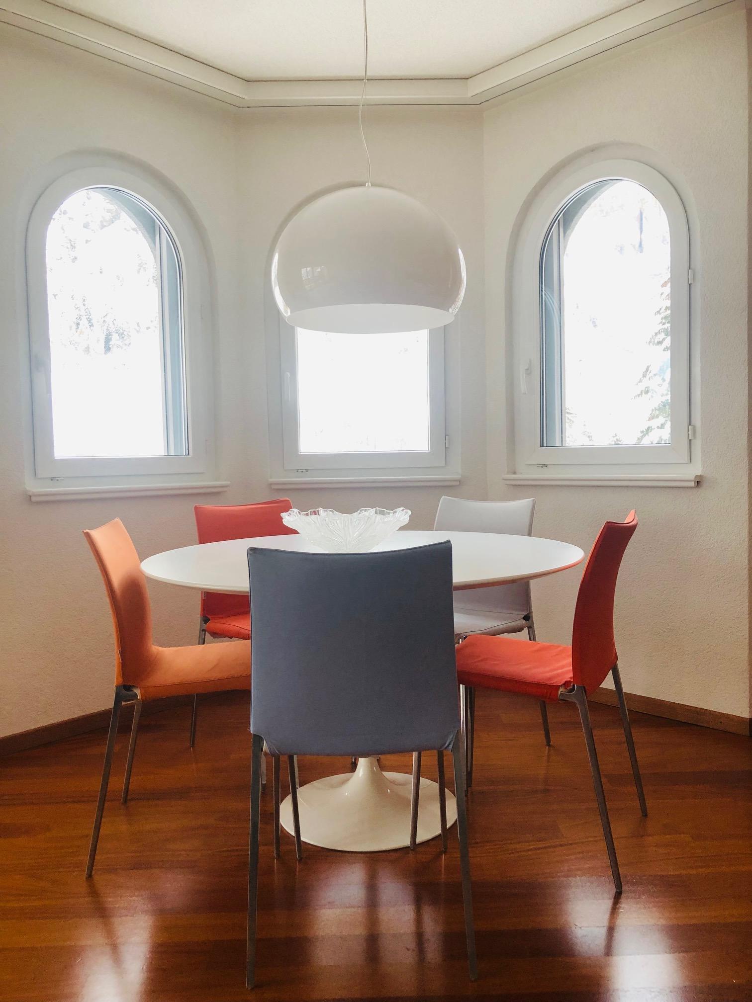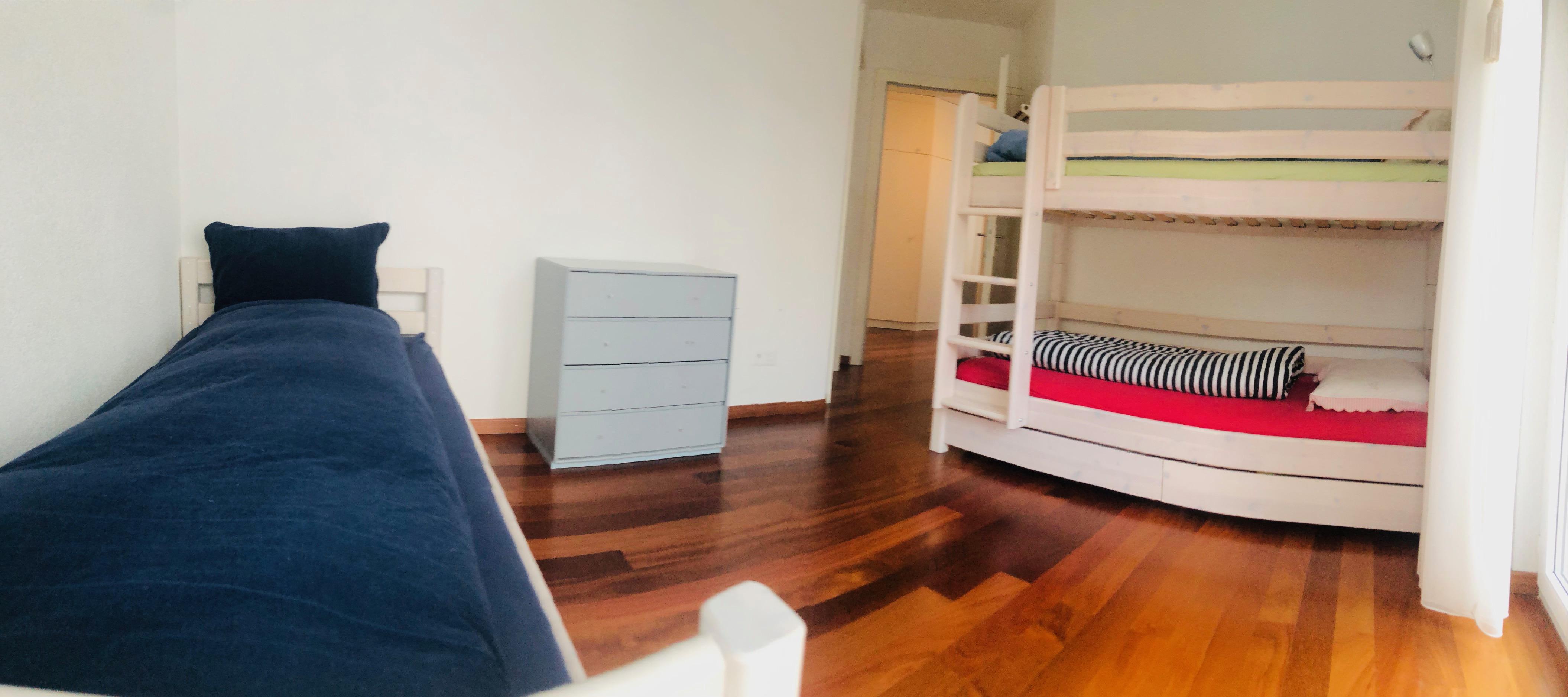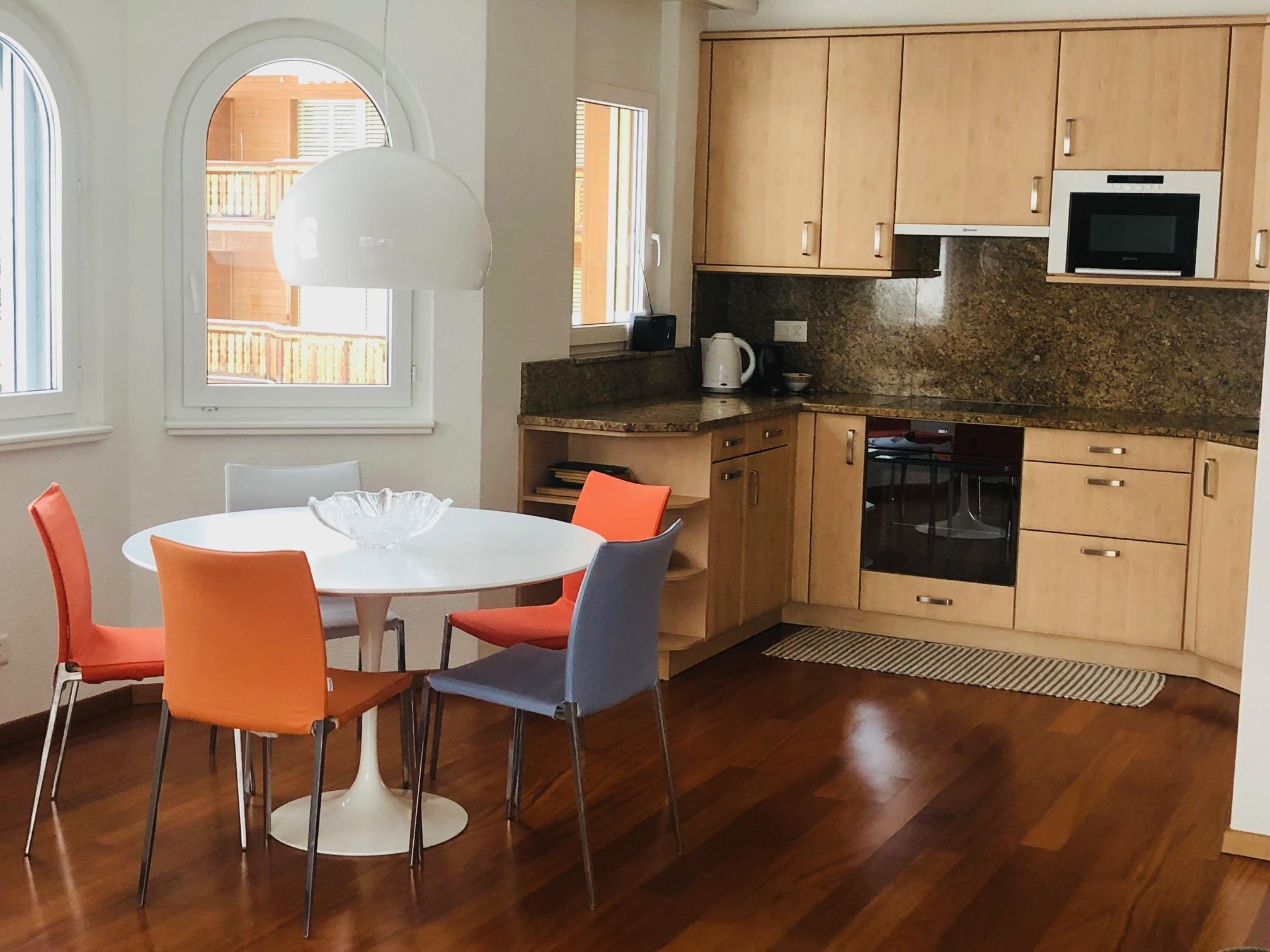 Moderne 3-Zimmerwohnung im 3. Stock: offene Küche mit Geschirrspüler und Mikrowelle, Wohnzimmer mit Cheminée, TV, Radio/DVD, gratis WiFi, 1 Doppelschlafzimmer, 1 Schlafzimmer mit 3 Betten (1 Einzelbett + 1 Etagenbett), 2 x Dusche/WC plus 1 x separates WC, grosser Südbalkon mit Panoramasicht, ruhige Lage, Lift, Ski- & Veloraum, Kinderspielplatz. Nähe: Torrentbahnen, Thermalbäder, Bushaltestelle, Dorfzentrum. Garage zu mieten im Haus. Nichtraucherwohnung. Keine Haustiere erlaubt!