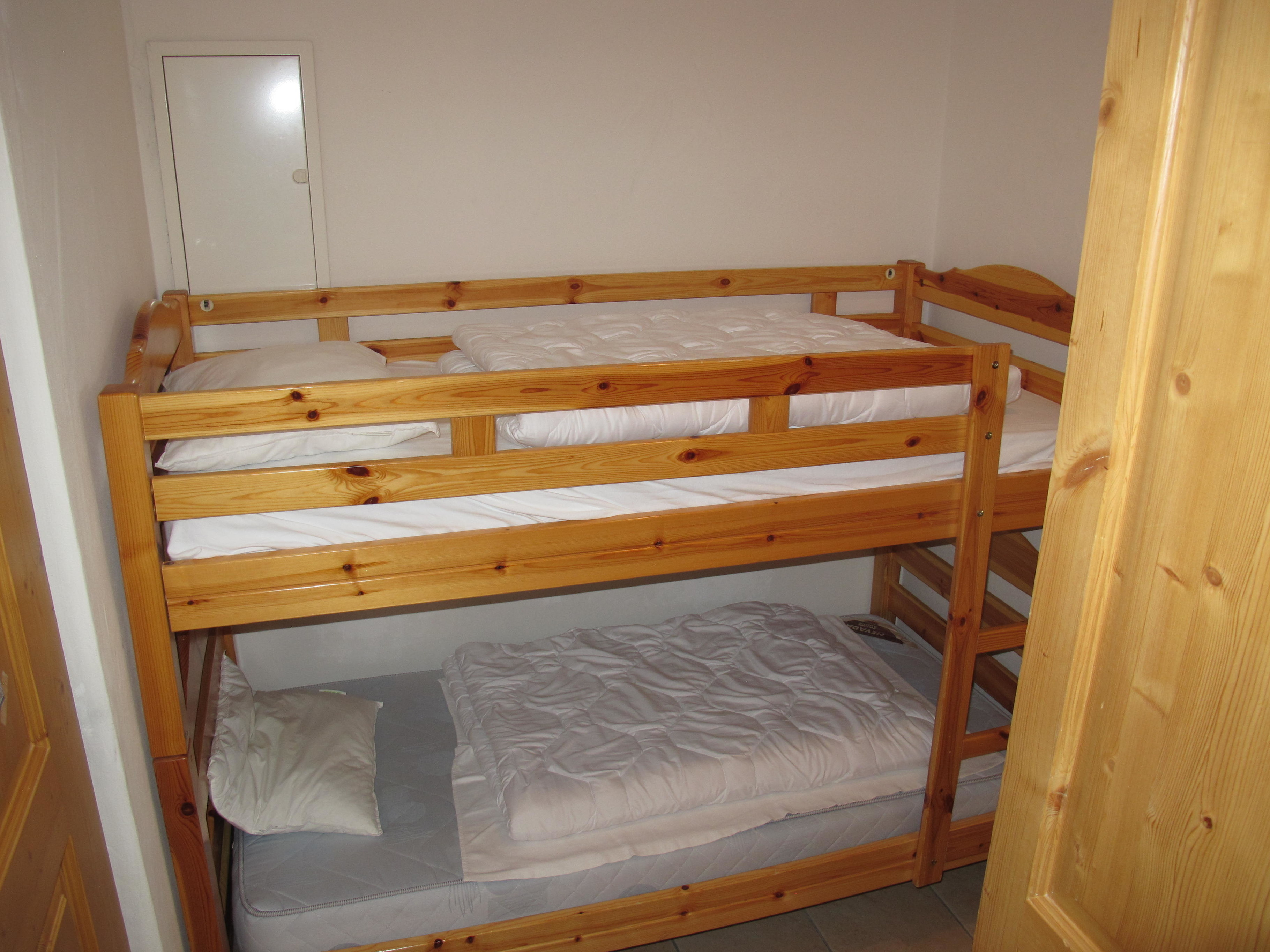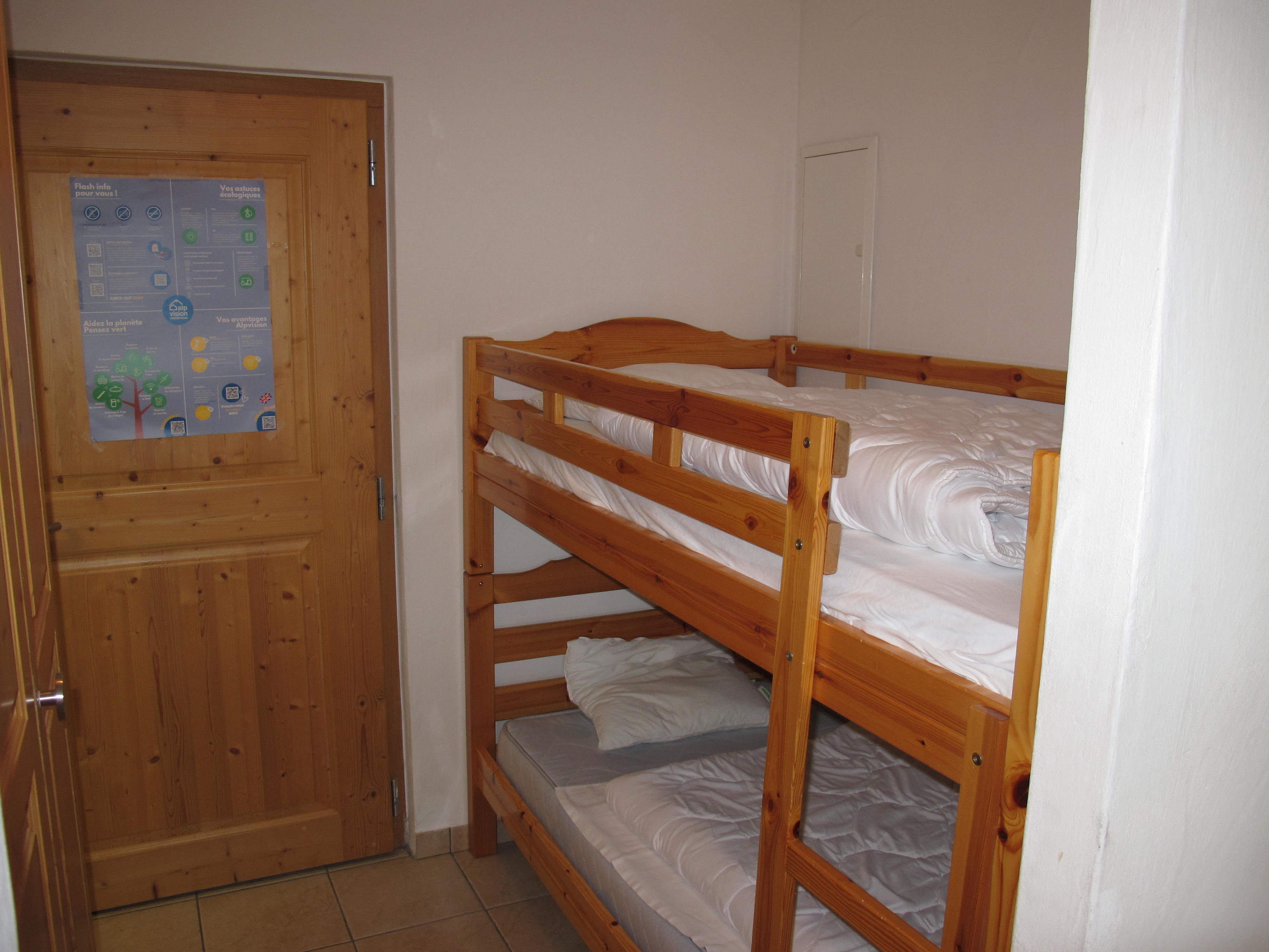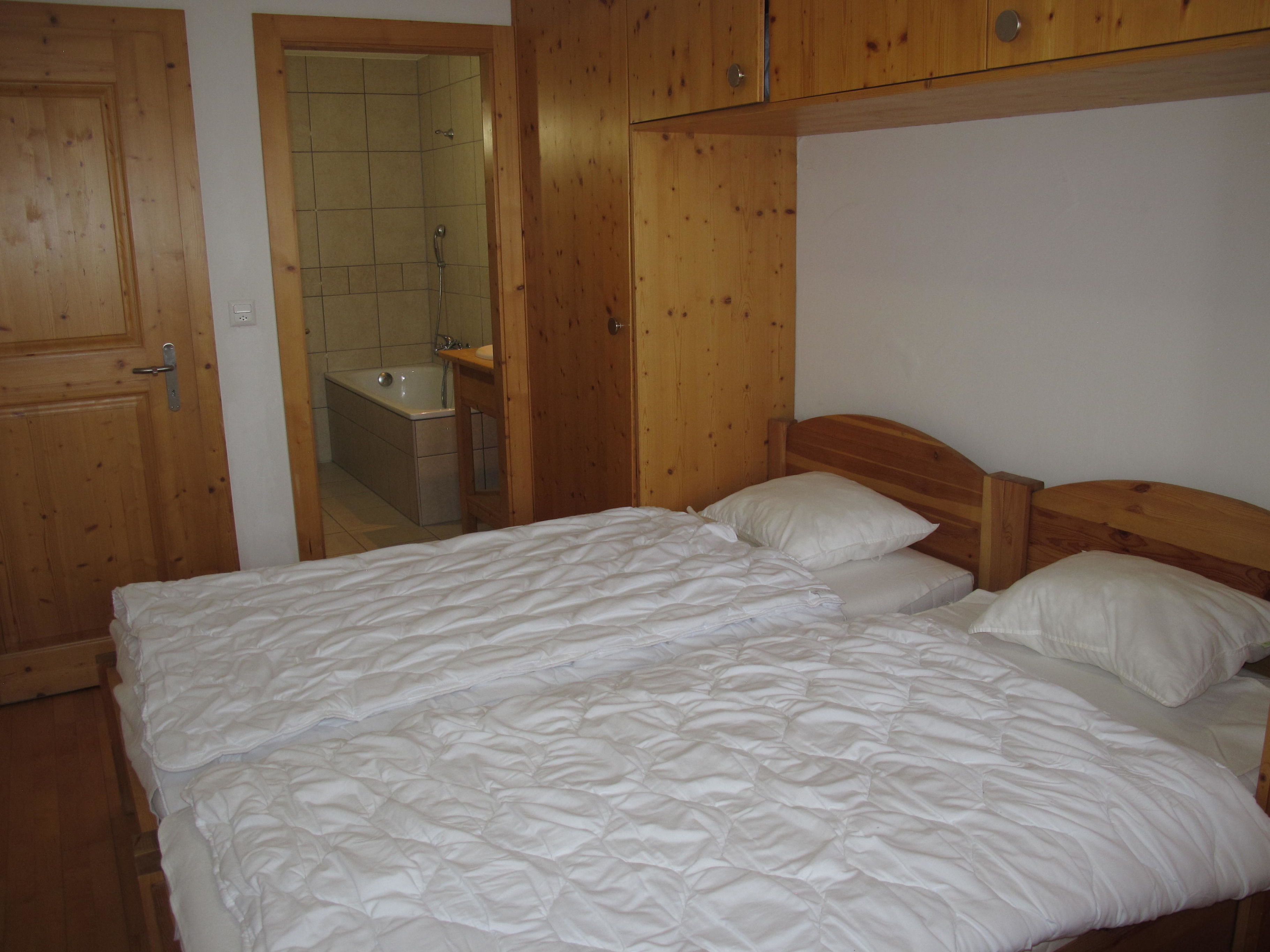 2,5-Zimmer-Wohnung CHAMOIS, 1. Etage, ca. 55 m²: Flur mit Garderobe und Etagenbett; vom Flur offener Übergang zu hellem Wohn-/Schlafraum mit Sitzgruppe, Doppelbettcouch, Kamin, Eßplatz und Balkonausgang. Offene Küche mit Einbauherd (4 Ceranfelder, Backofen), Mikrowelle, Geschirrspüler, Kühlschrank mit großem Gefrierfach, Kaffeemaschine, Wasserkocher, Toaster, Fondue- und Raclette-Gerät. Doppelzimmer mit eigenem Bad/WC mit Doppelwaschecken. Weitere Dusche/WC.