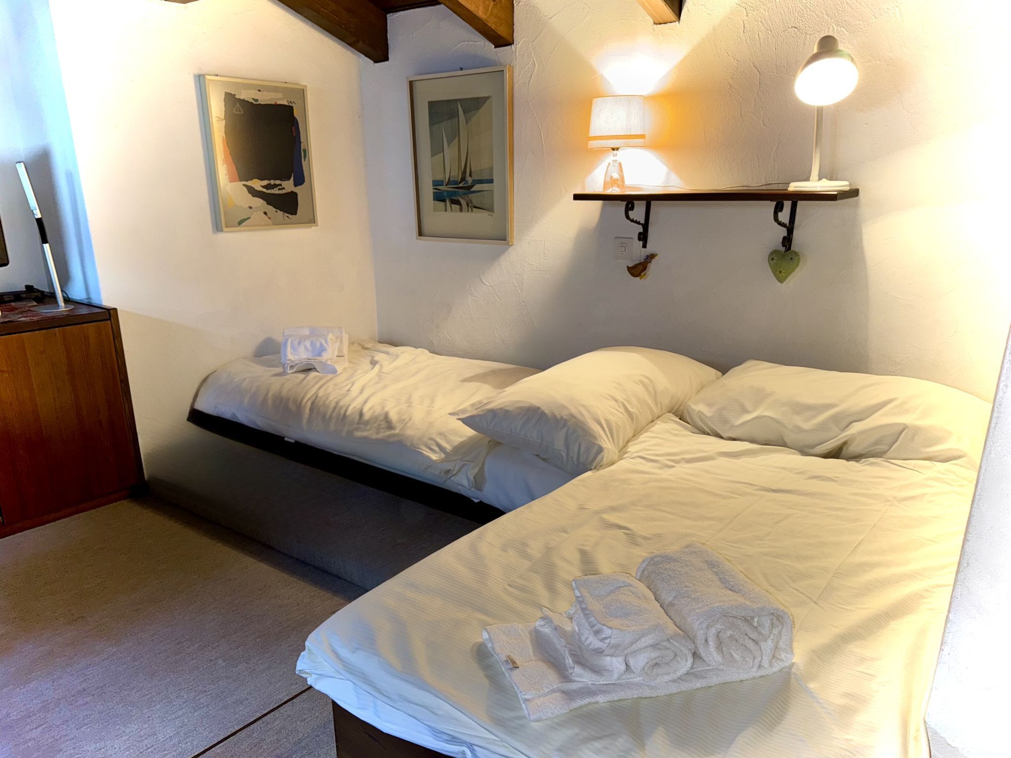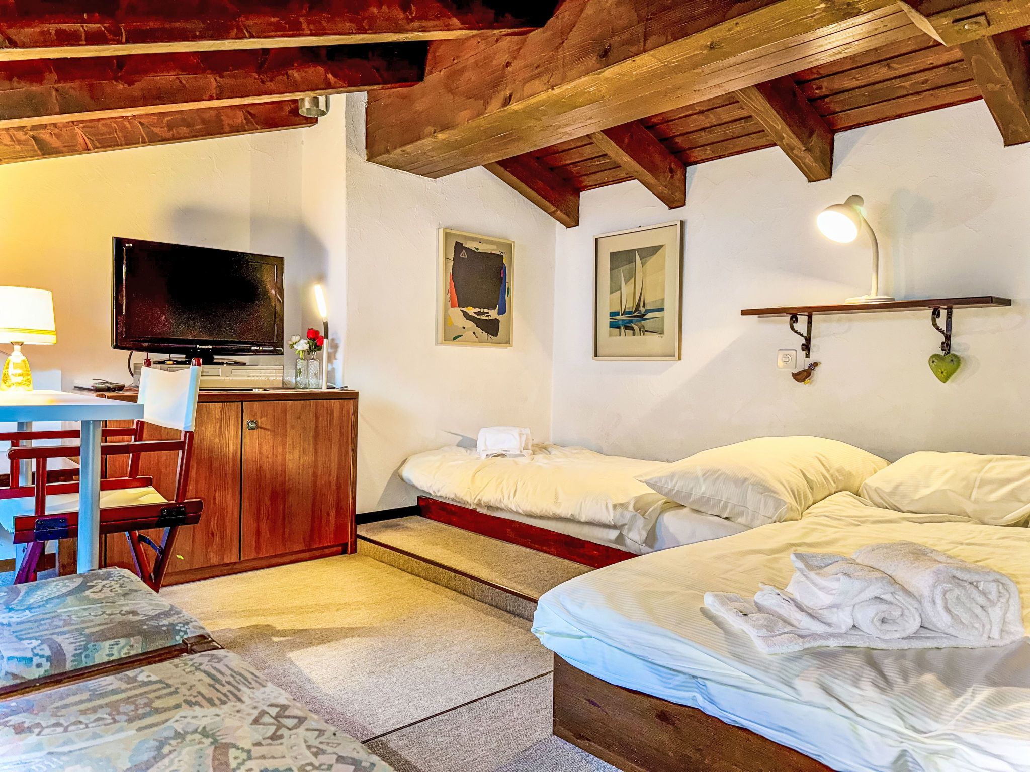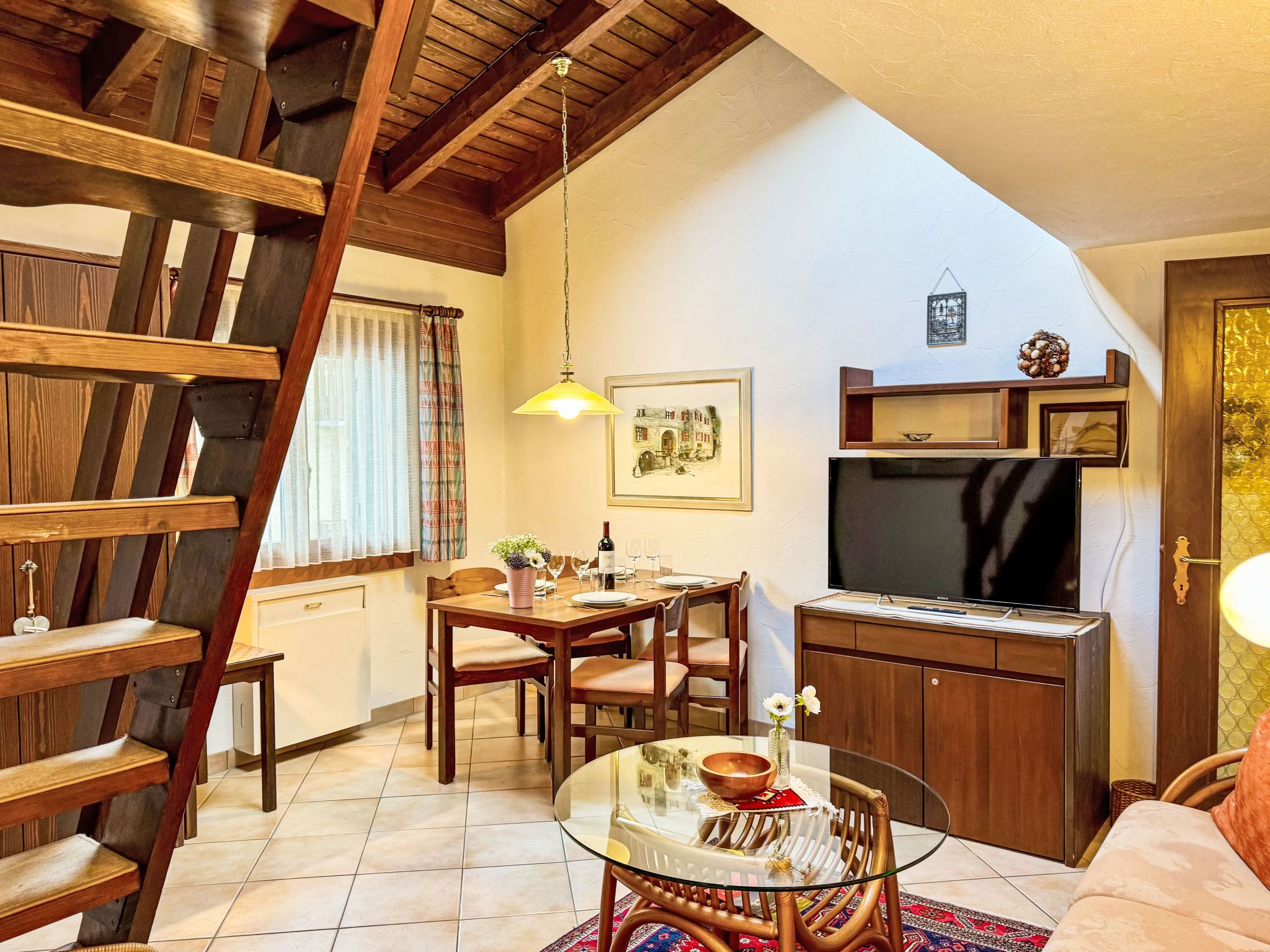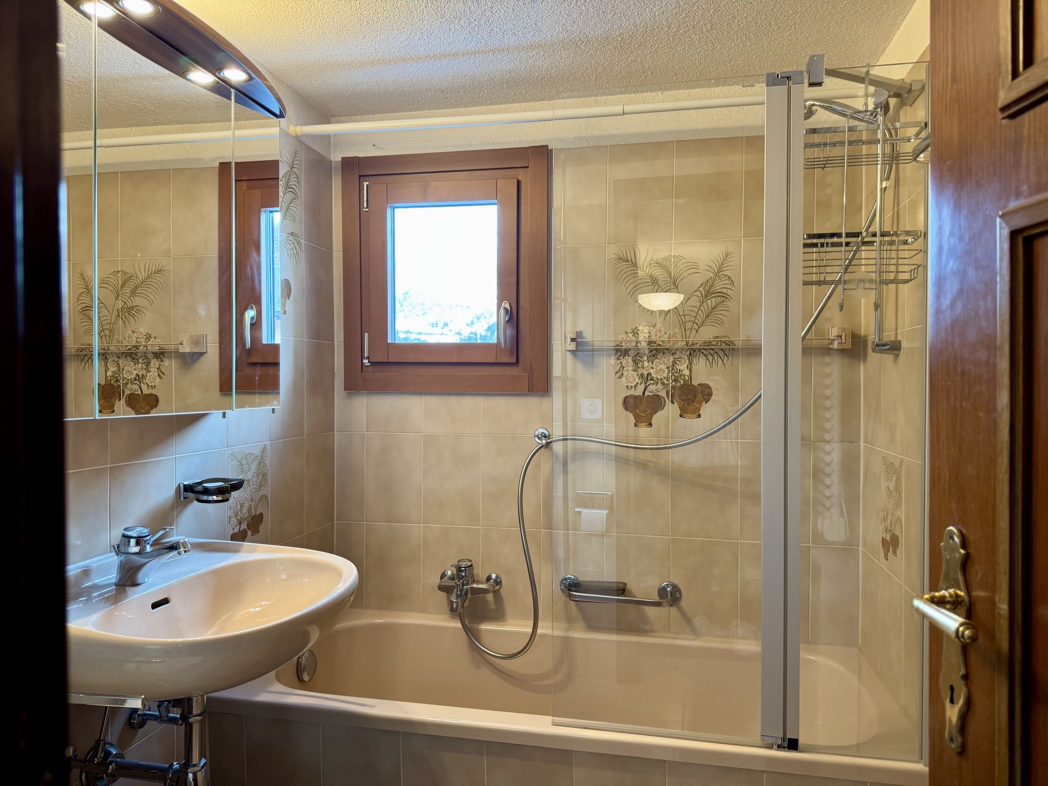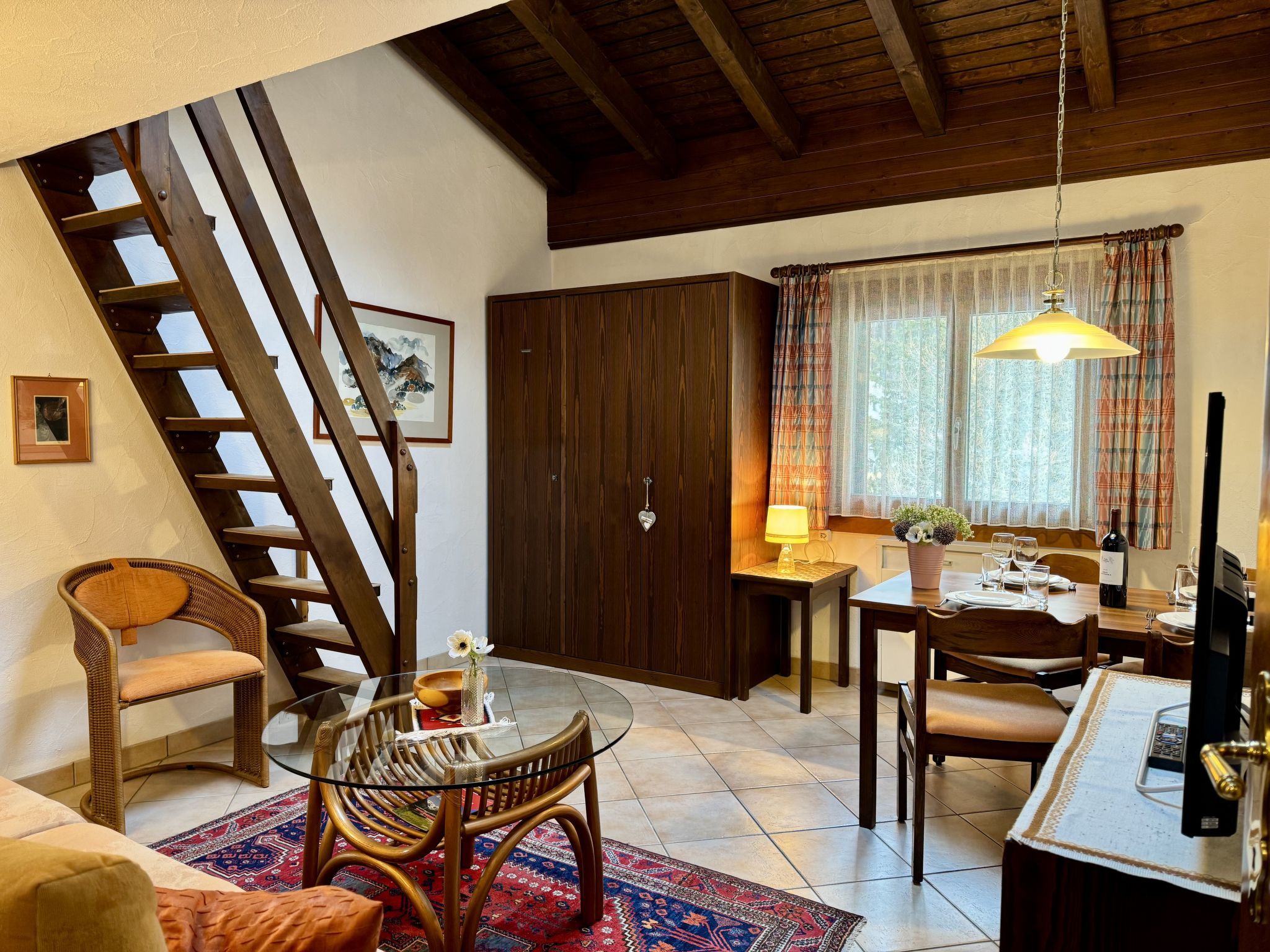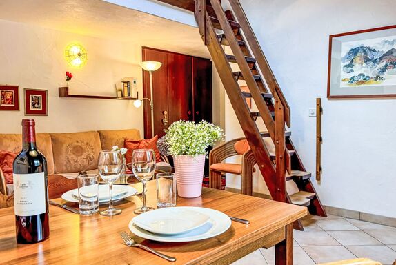 Residenza Chesa Margun 15-4, 2-Zimmer-Wohnung 47 m2 auf 2 Stockwerken, im Dachgeschoss, Nordlage. Gemütlich eingerichtet: Wohn-/Esszimmer mit Kabel-TV (Flachbildschirm). 1 Doppelzimmer mit 1 Doppelbett. Kleine Küche (4 Kochplatten, Backofen, Geschirrspüler, Toaster, Wasserkocher, elektrische Kaffeemaschine, Kapseln für die Kaffeemaschine (Nespresso) extra). Bad/WC. Obergeschoss: (steile Treppe) abgeschrägte, offene Galerie, Deckenhöhe 150 - 170 cm mit 2 Betten und Kabel-TV (Flachbildschirm). Seitliche Sicht auf die Berge und die Landschaft. Zur Verfügung: Internet (WLAN, gratis). Garage, Höhe 203 cm, Breite 290 cm. E-Ladestation. Bitte beachten: für Kleinkinder nicht geeignet. Nichtraucher-Unterkunft.