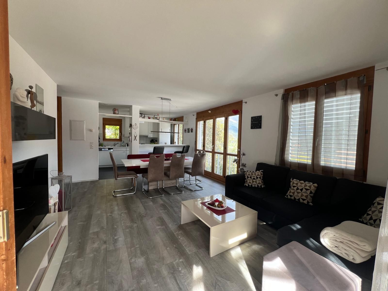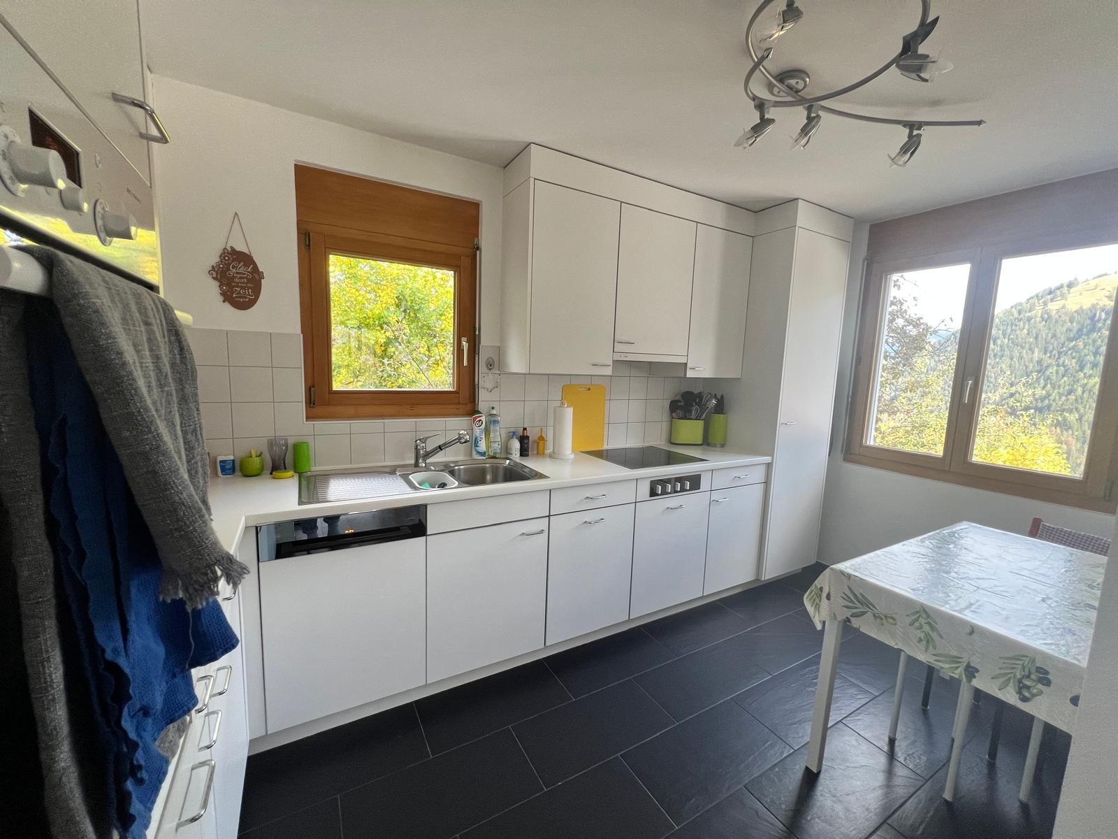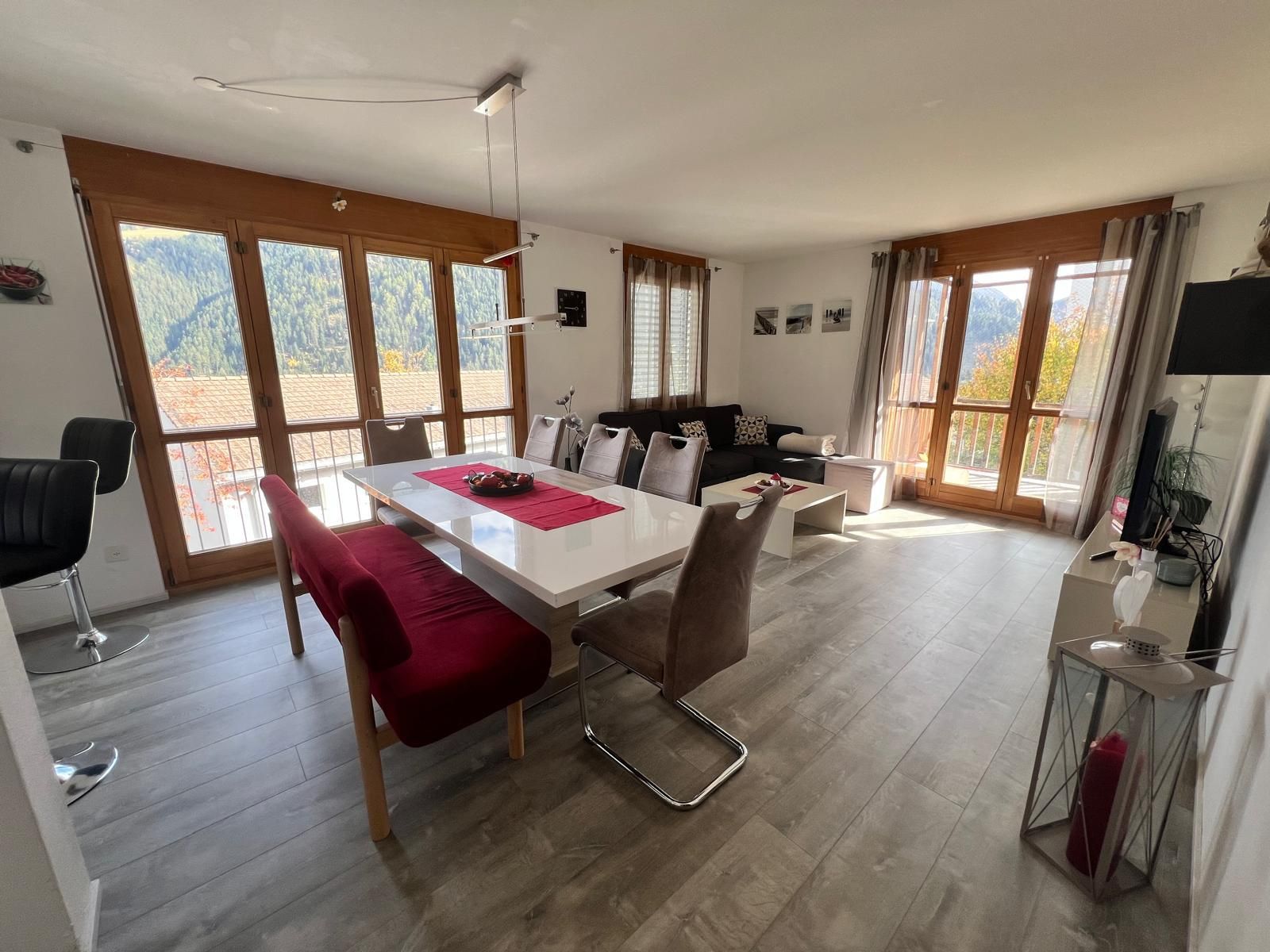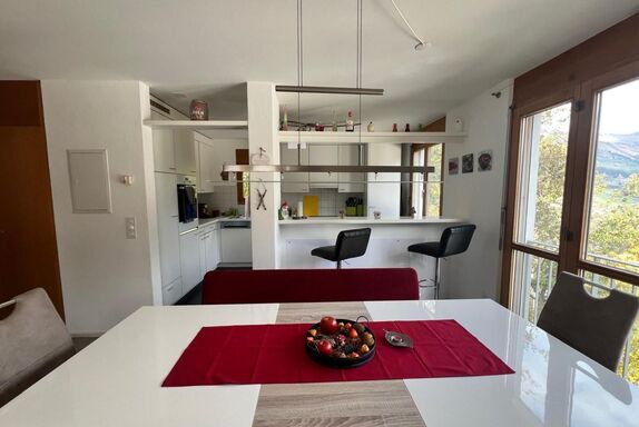Die Ferienwohnung bietet einen groszügigen Wohnbereich mit offener, voll ausgestatteter Küche und direktem Zugang zu einem grossen Südbalkon mit Blick auf die Berge.