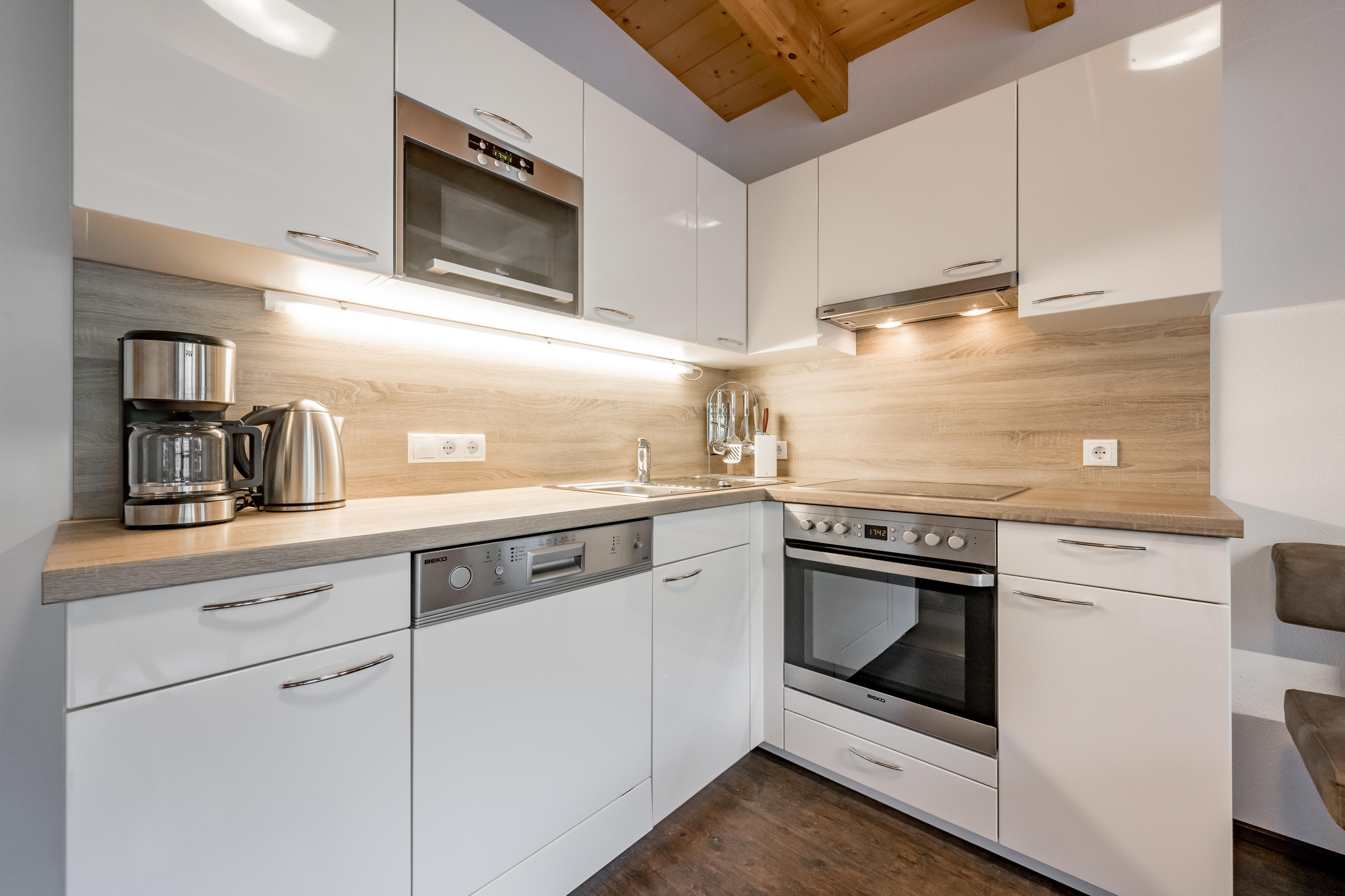 • Vollausgestattete Wohnküche mit Mikrowelle, Wasserkocher, Nespresso Kapsel-Kaffeemaschine, Spülmaschine, Kühlrschrank mit Gefrierfach, Ceranfeld mit 4 Kochfeldern, Kochgeschirr, Speisegeschirr und Besteck sowie gemütlichem Essbereich